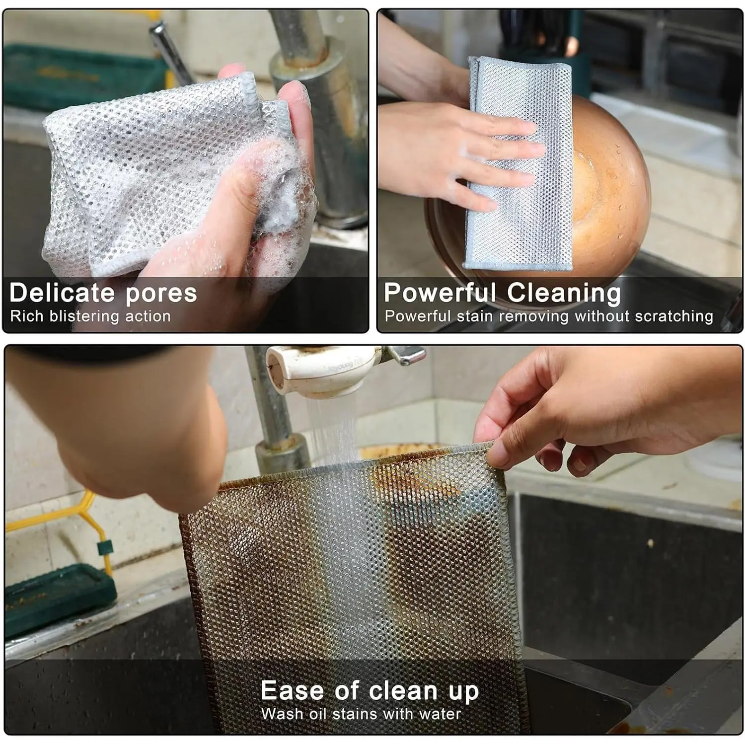 These wire dishcloths are designed for wet and dry use.They produce a rich lather that won't leave water marks thanks to their diamond lattice weave surface and fine pores.They trap moisture and wash away grease.