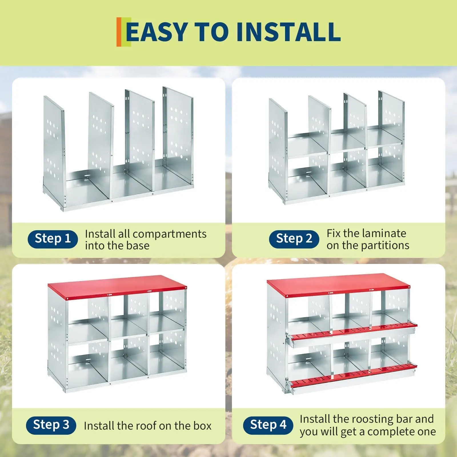Weather-Resistant Galvanized Steel Build:Constructed with rust-proof galvanized steel walls and a sturdy roof for maximum durability. Strategically placed ventilation slots ensure proper airflow while protecting against predators and harsh weather conditions.
