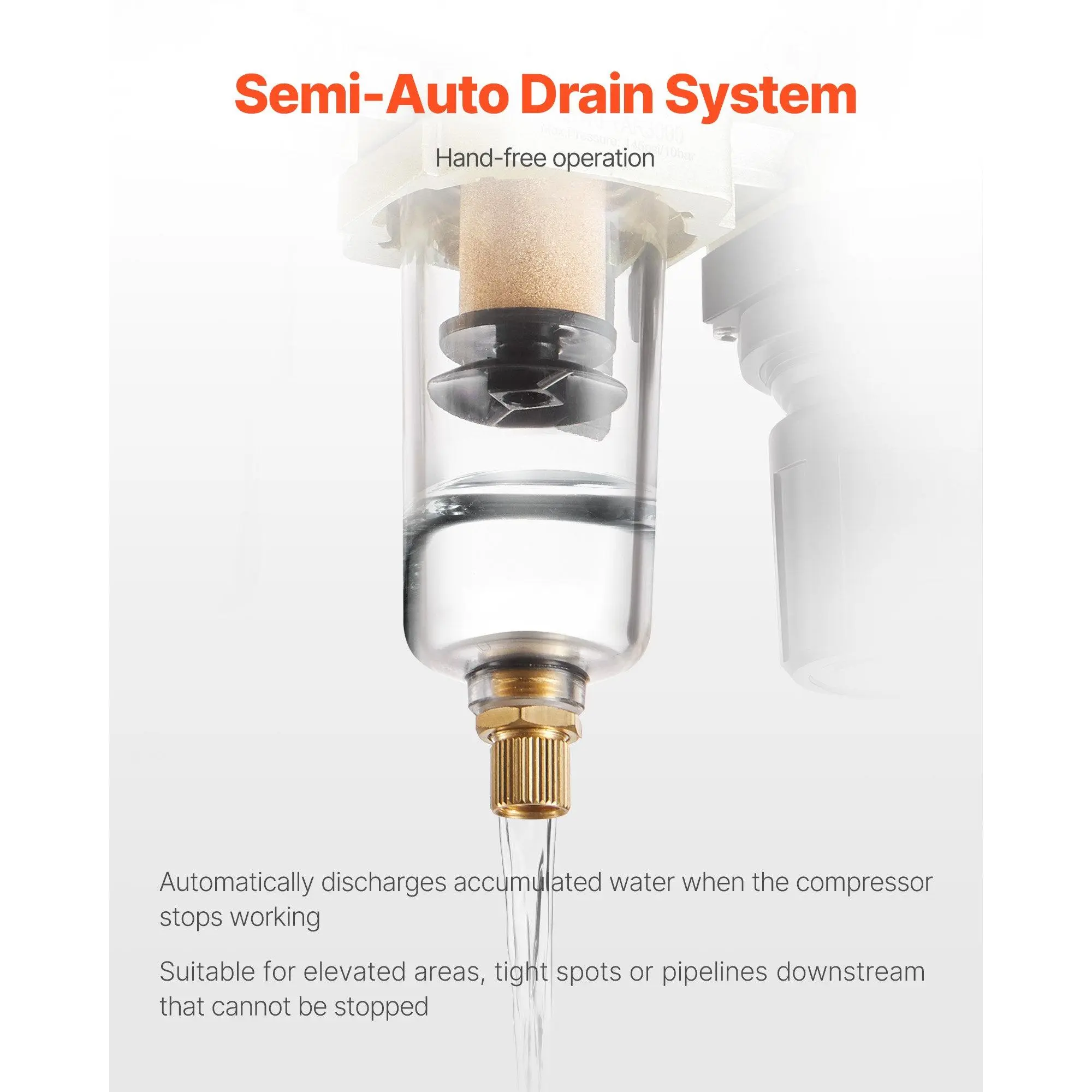 Deliver clean and dry compressed air with VEVOR 3/8 NPT air compressor filter regulator. It combines dual-stage precise filtration and stable pressure regulation. With 25 m+ 5 m brass filter elements, it effectively removes moisture, impurities, and particles from the compressed air.