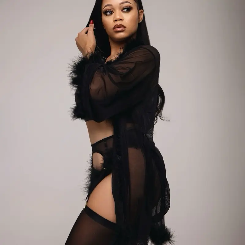 Look 5 from Skimpy Rose Drop 01 is the ultimate embodiment of seductive elegance. This striking set features a sultry black mesh bustier with delicate feather accents, paired with a matching high-waisted garter belt and thong. The luxurious robe, adorned with soft feathers along the trim, completes the look, draping effortlessly to accentuate your confidence and allure. Perfect for making a bold, unforgettable statement, this look redefines sexy with a sophisticated edge. Dare to own the night in this empowering ensemble.