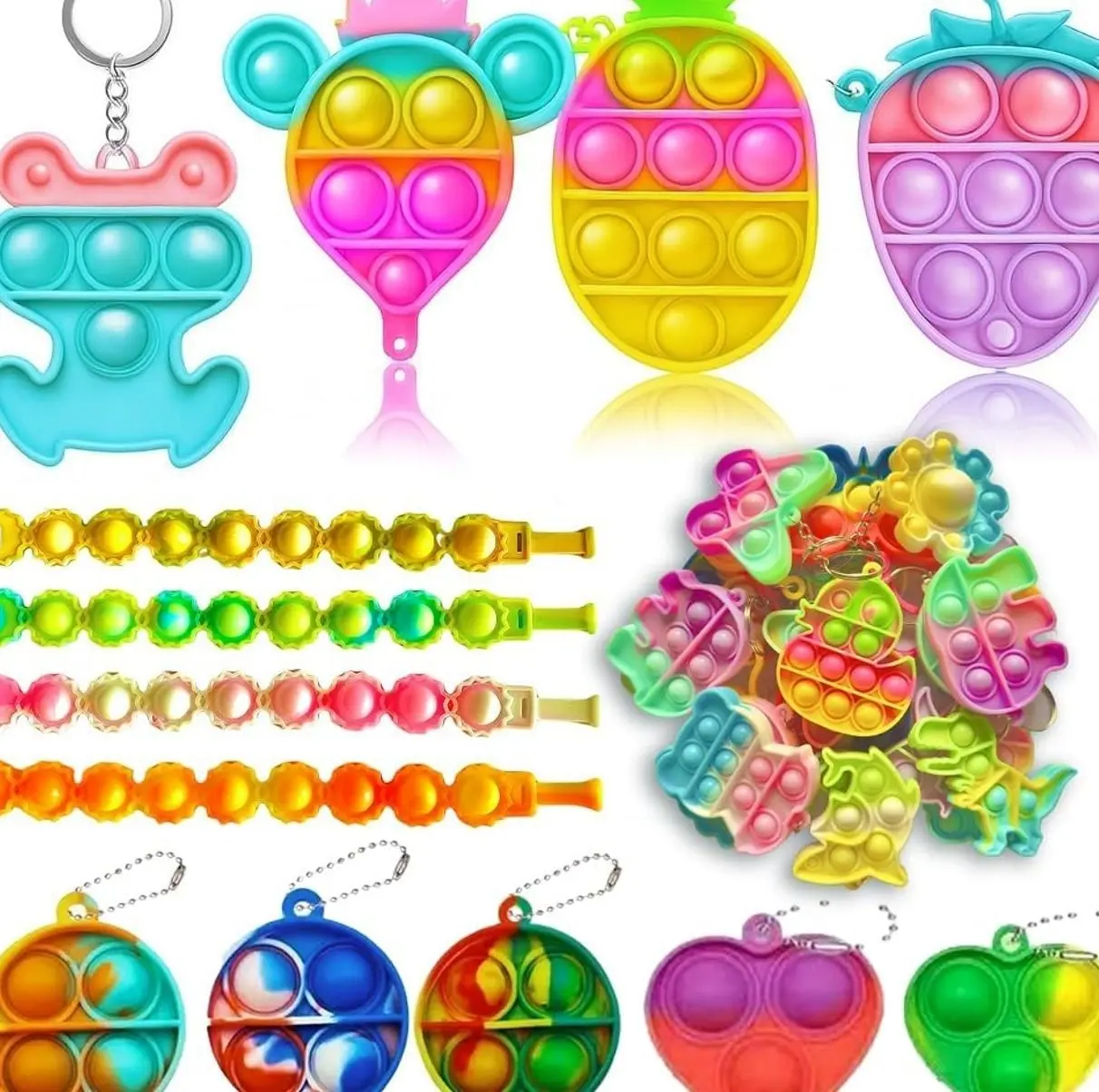 Set of 160 randomly selected items: 5 Squishies, 5 Sticky Hands, 5 Wobblers, 3 Pull back Animal Cars, 5 Mini Pop Keychains, 5 Spinners, 4 Pop Bracelets, 10 Slap Bracelets, 5 Airplane Pull Back Cars, 3 Plastic Walking Beads Cartoon Animal Maze, 5 Fingerboard, 3 Pop Keychain, 65 Assorted Stickers, 7 Monkey Noodles, 2 Stretchies, 5 Spike Balls, 6 mini dinosaur figures, 13 plastic rings, 2 Sensory Rings, 2 Pull back Race Cars — a perfect all-in-one surprise pack!