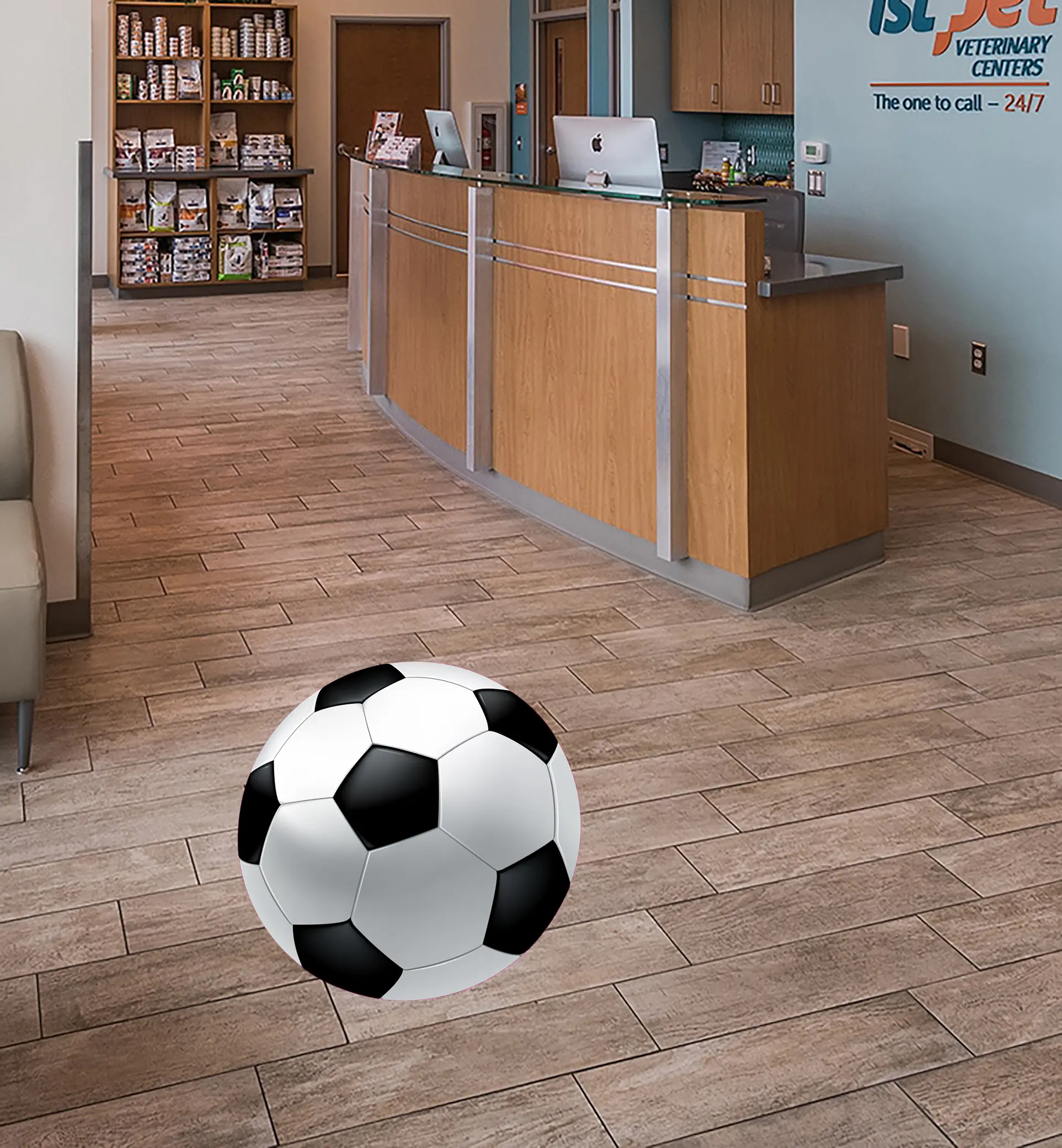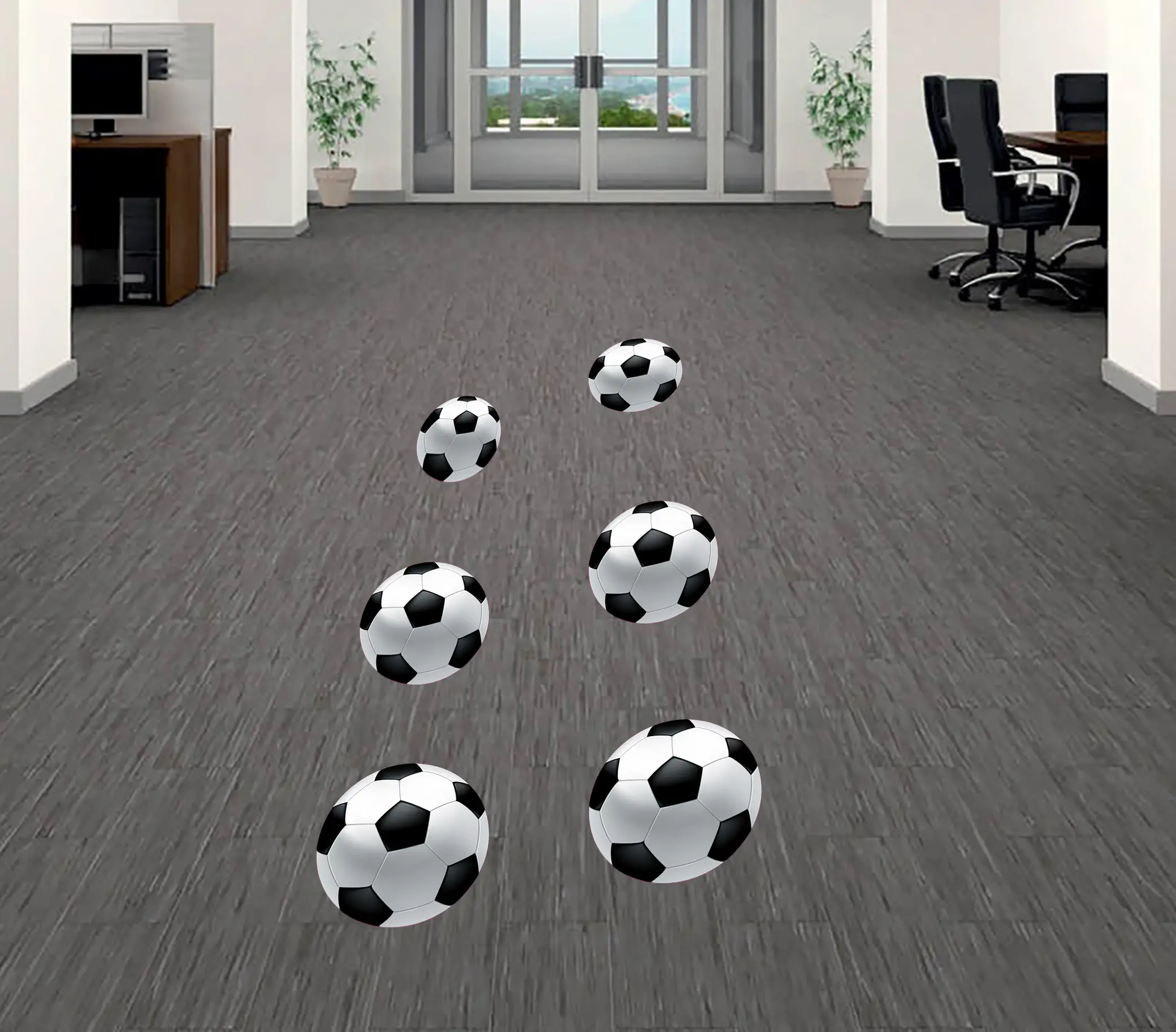 The product is a set of 6 to 9" Soccer Ball Floor Vinyl Decals, perfect for a birthday party. These removable sidewalk decals feature a Soccer theme, making them ideal for indoor or outdoor use. Made from vinyl decal stickers, these footprints can add a fun and creative touch to any birthday celebration, especially for kids who love dinosaurs. Produced by Awareness Vinyl in the United States, these printed outdoor floor vinyl decals are a unique and eye-catching addition to the party decorations.