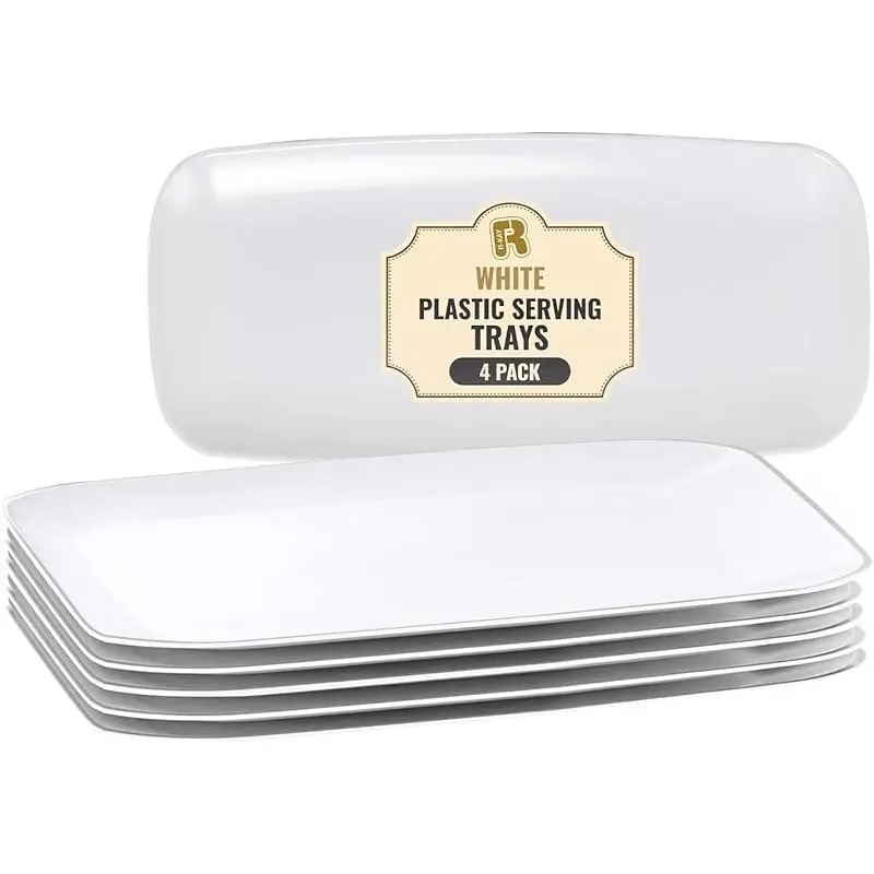 4 Pack White Plastic Serving Trays 17"x6.5", Rectangular Heavy Duty Dessert & Food Platters for Party, Holiday & Entertaining Supplies