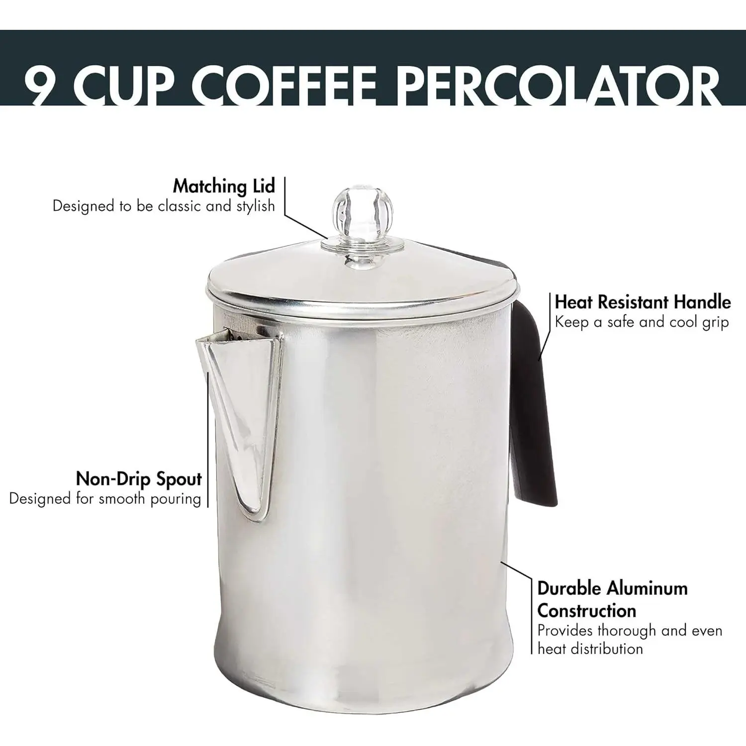 Classic Stovetop Coffee Percolator: 9-Cup Durable Aluminum, for Rich & Aromatic Brew, Retro Silver Design