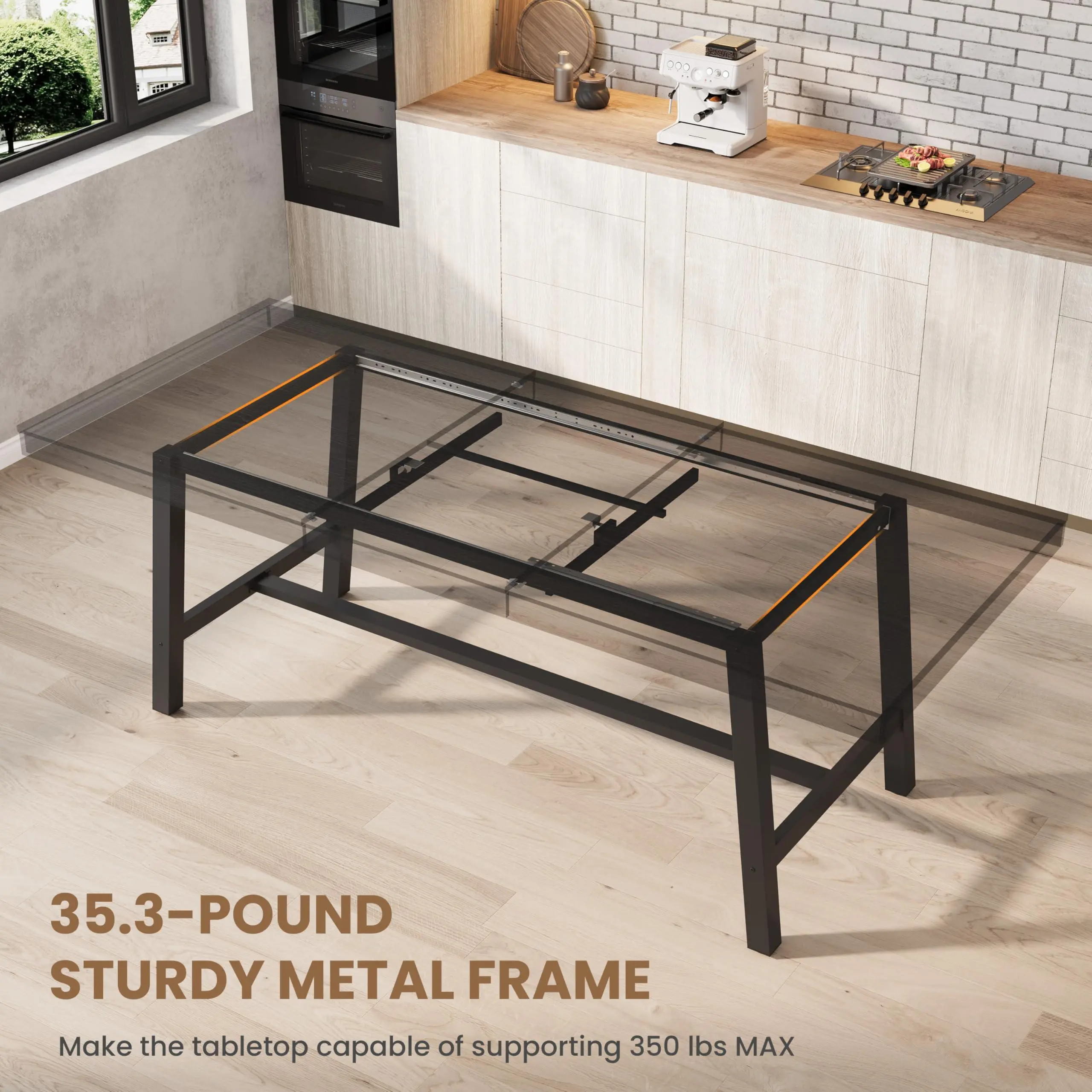 【Heavy Duty & Durable Kitchen Table】:Constructed with high-density engineered wooden tabletop and a reinforced metal dining table frame, this piece supports up to 350 lbs. The surface is scratch-resistant, heat-resistant, and waterproof, making it a family-friendly kitchen table that withstands spills and heavy daily use. The sturdy dining table base provides maximum legroom, allowing chairs to be tucked in neatly