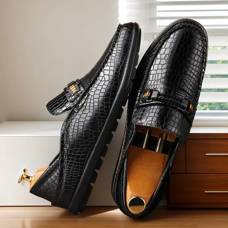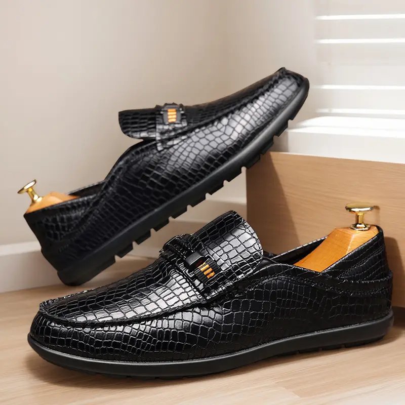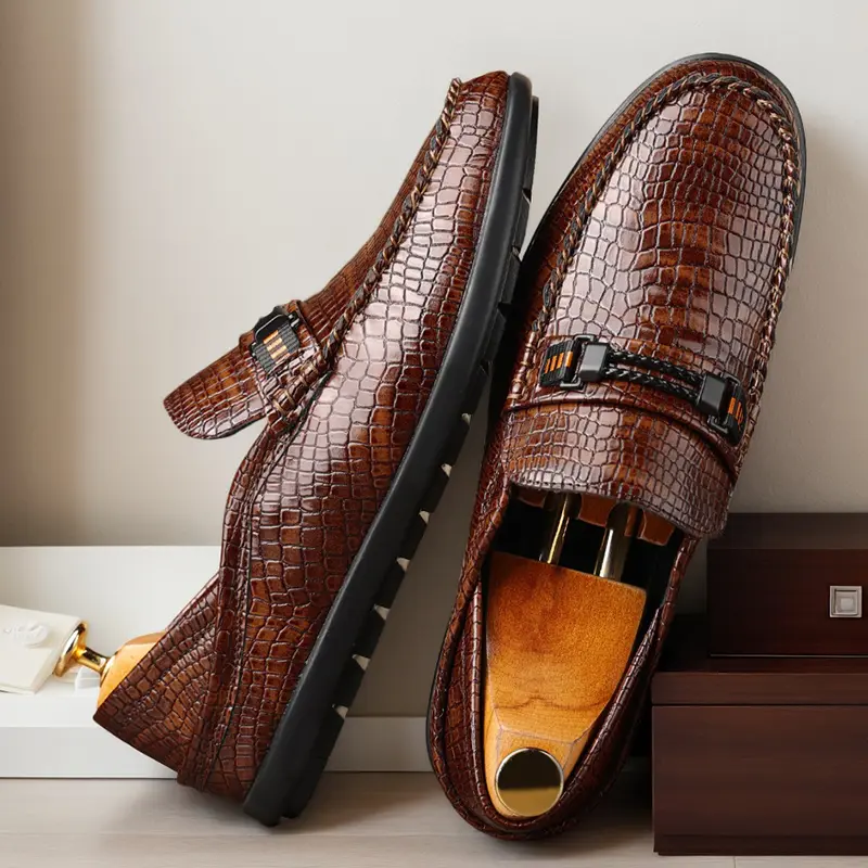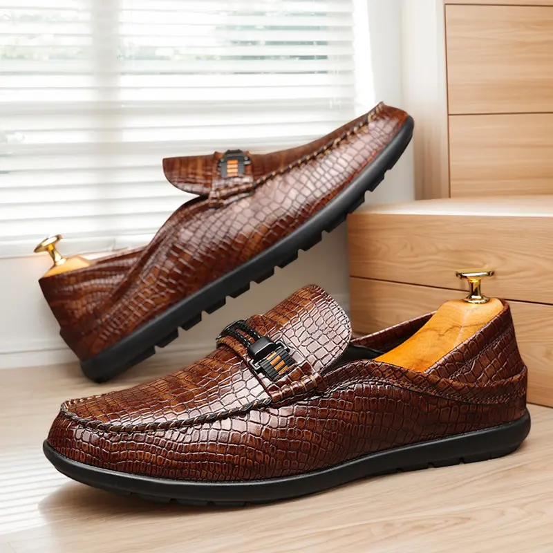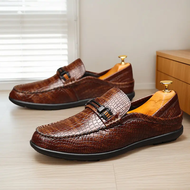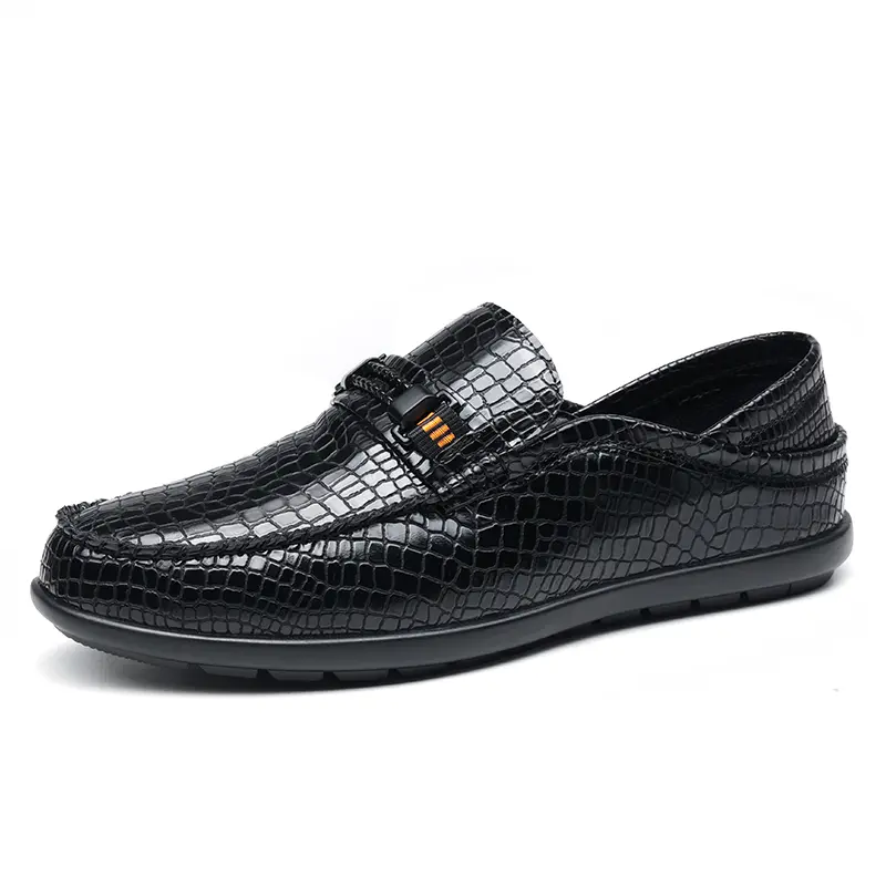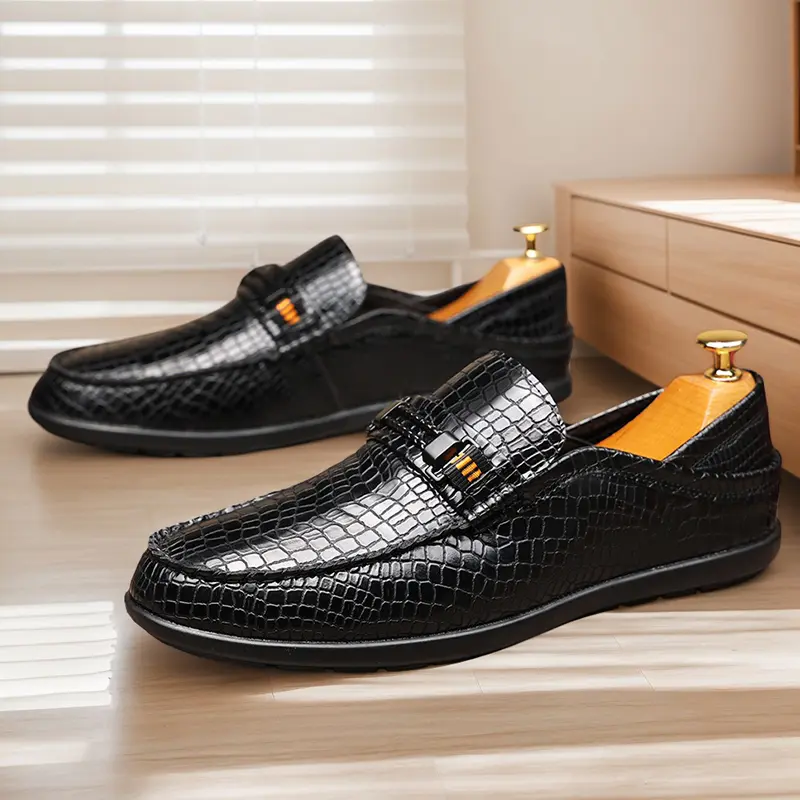 These men's formal loafers are crafted from high-quality polished leather with a premium crocodile-embossed texture, featuring a sleek metal bit accent with orange detail and a streamlined slip-on silhouette. Available in classic black and warm brown, the textured finish delivers a sophisticated, upscale look, perfect for business meetings, formal events, and daily commutes.