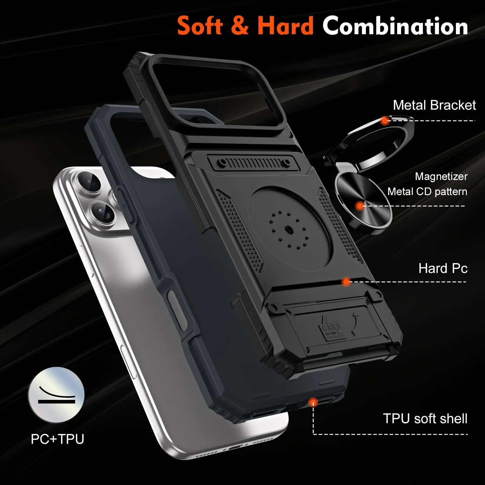 Heavy-Duty Shockproof Hard Case for iPhone 13 14 15 16 E 17 Pro Max Plus, Hidden Dual Card Slot Design with Rotating Metal Stand, Card Holder Protective Cover