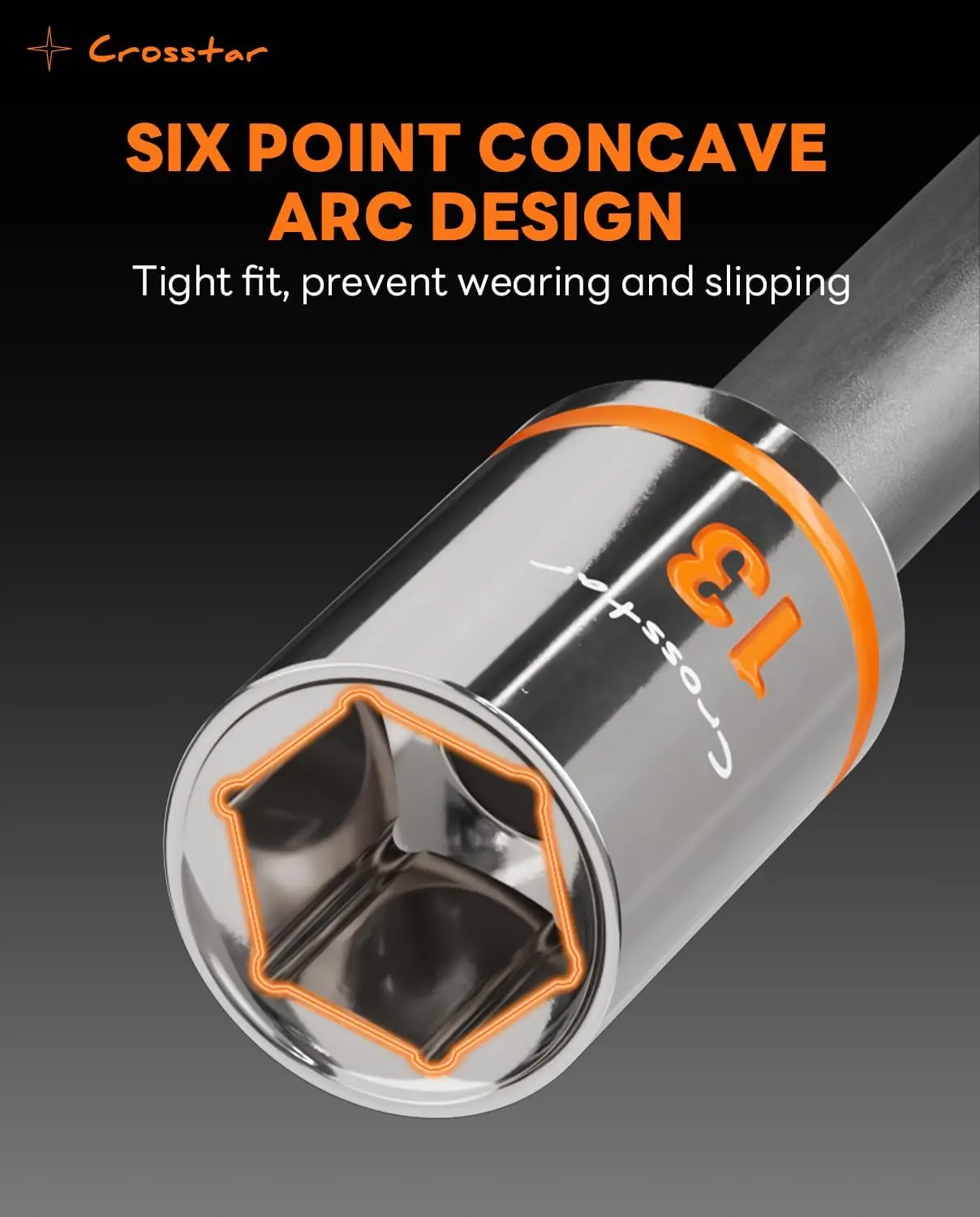 ·【6-Point Socket with Concave Arc Design】Our precision-machined 6-point socket features a Concave Arc Design that delivers a tight, secure fit with hex-shaped fastener heads. The rounded arc design on each of the six points allows for easy socket engagement, while force applied evenly across the fastener’s flat surfaces (instead of the corners) effectively prevents fastener rounding and slipping, ensuring maximum torque transfer and reliable, frustration-free fastening every time.