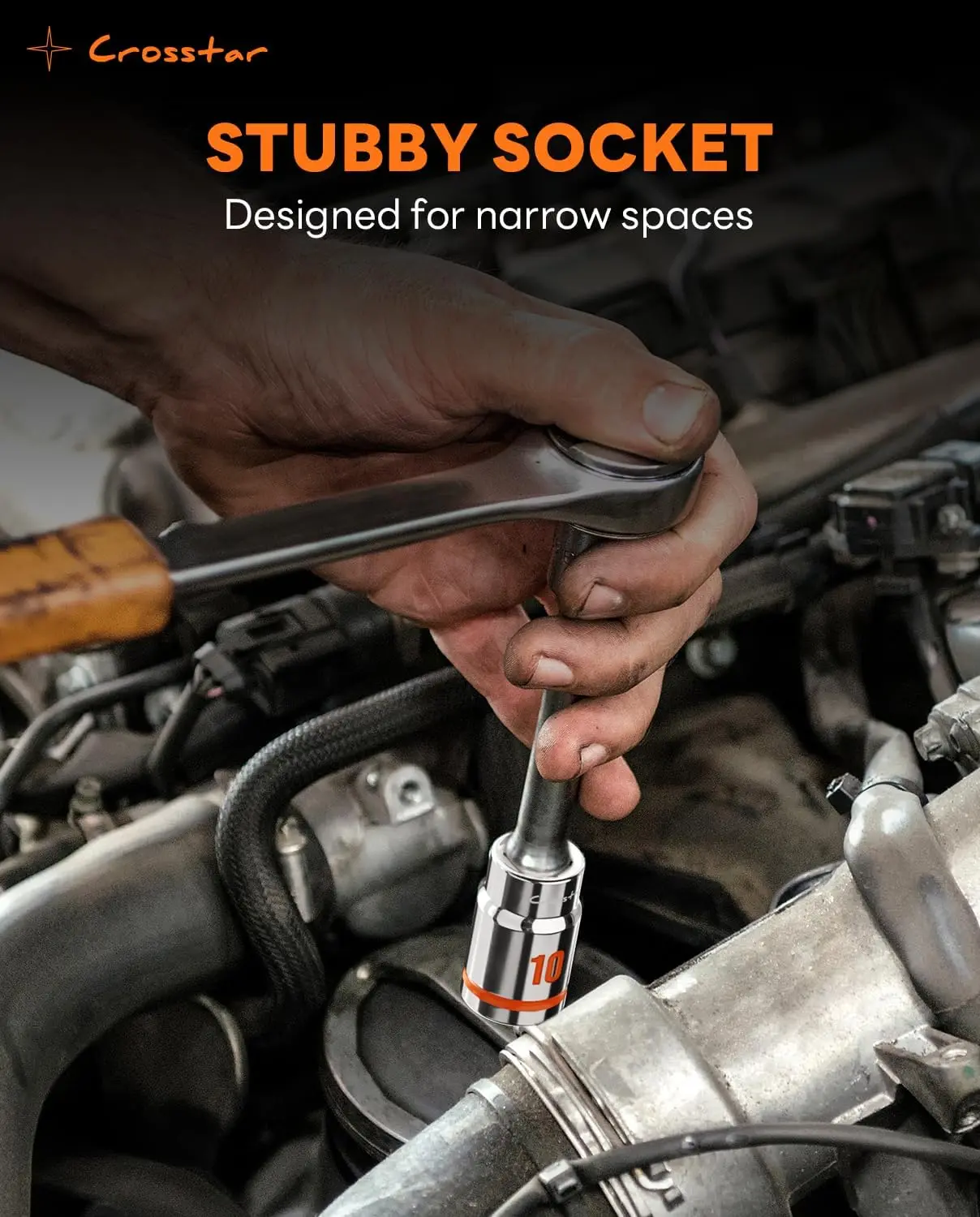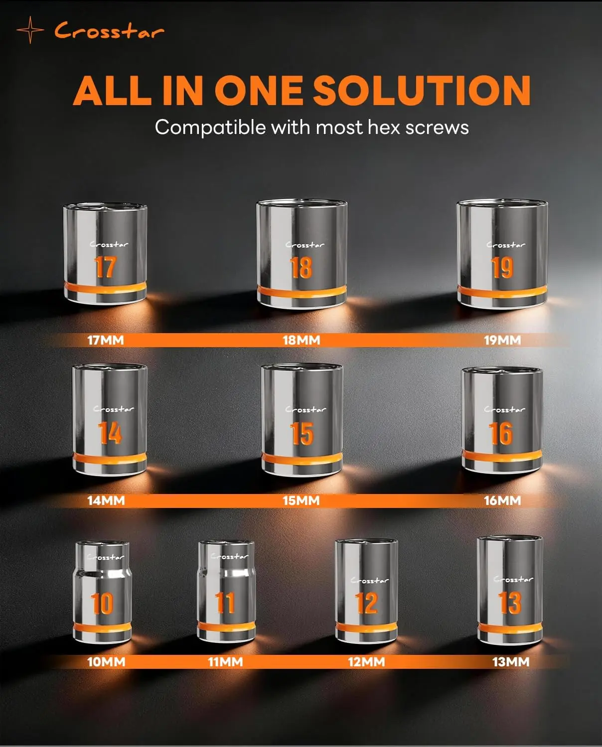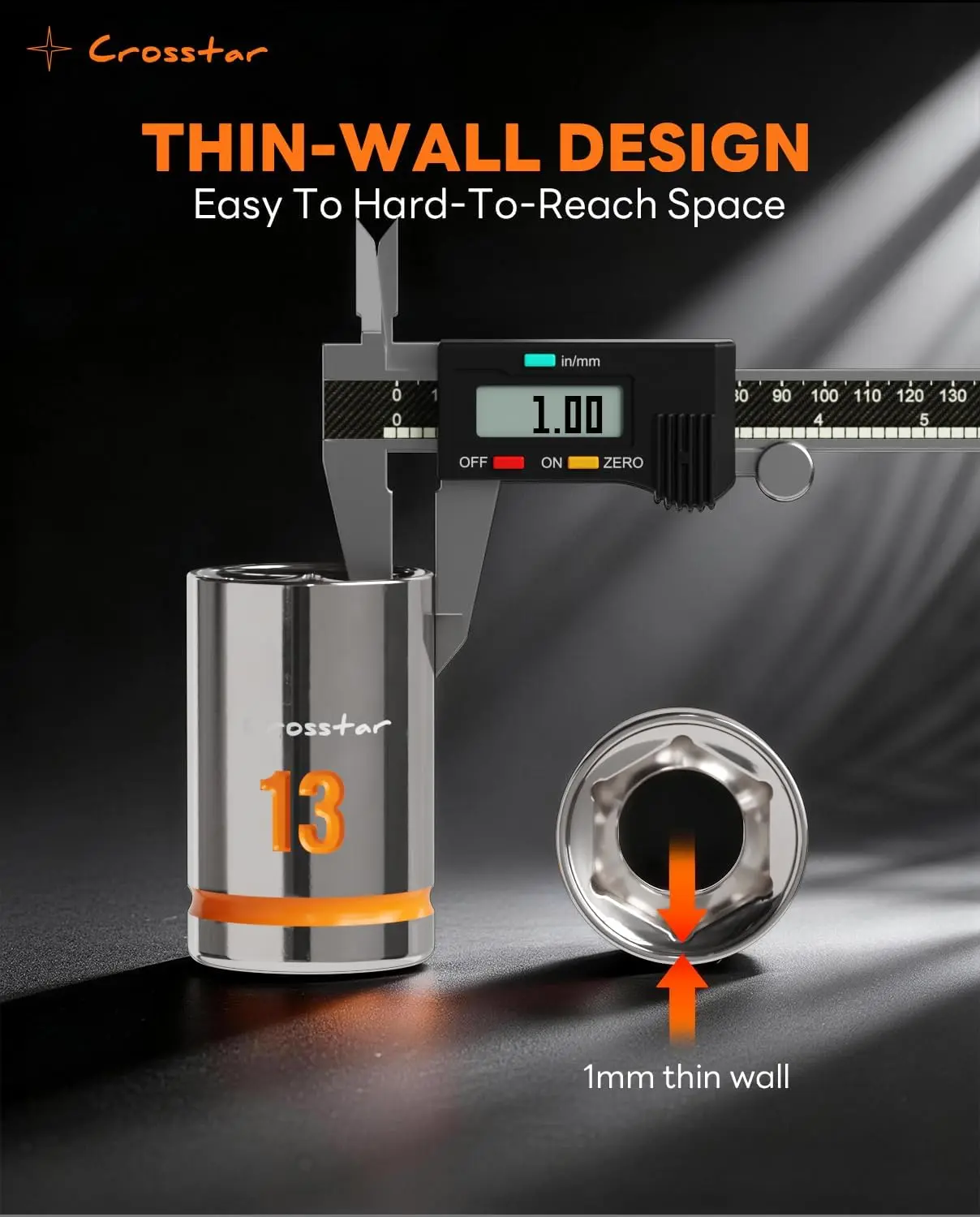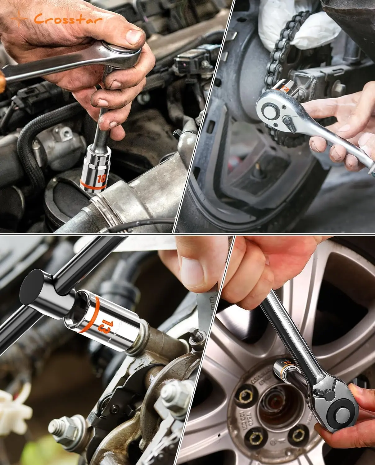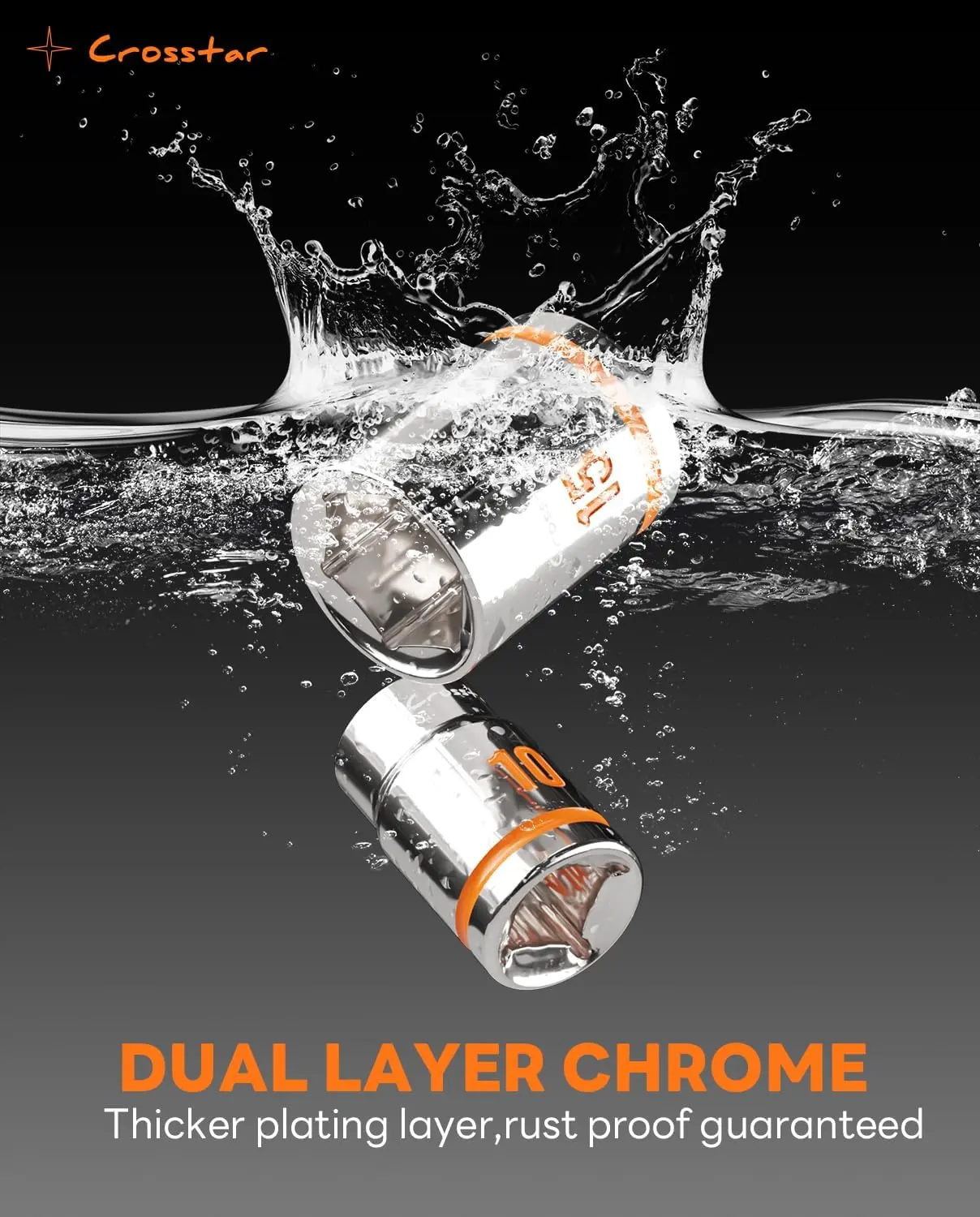 ·【Premium Material and Coating for Maximum Durability】All sockets are made from hardened Chrome-Vanadium (Cr-V) steel, then heat treated for high torque strength and finished with a double-layer polished finish—far more wear-resistant, rust-resistant and scratch-proof than ordinary coatings. This mirror-like plating is easy to clean and stands up to heavy daily use in garages and workshops for long-lasting performance.