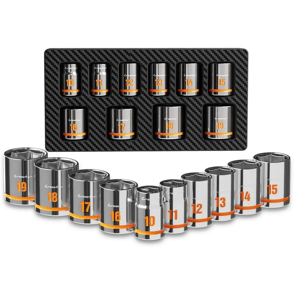 ·【Complete 10-Piece 3/8" Drive Metric Shallow Socket Set】This 3/8" Drive Socket Set includes 10-piece metric shallow sockets in the most commonly used sizes: 10mm, 11mm, 12mm, 13mm, 14mm, 15mm, 16mm, 17mm, 18mm,19mm, paired with an EVA foam case. Designed for tight spaces, it’s ideal for various work scenarios including automotive repair, small machinery maintenance, motorcycle and bicycle refurbishment—covers all your basic and daily needs!