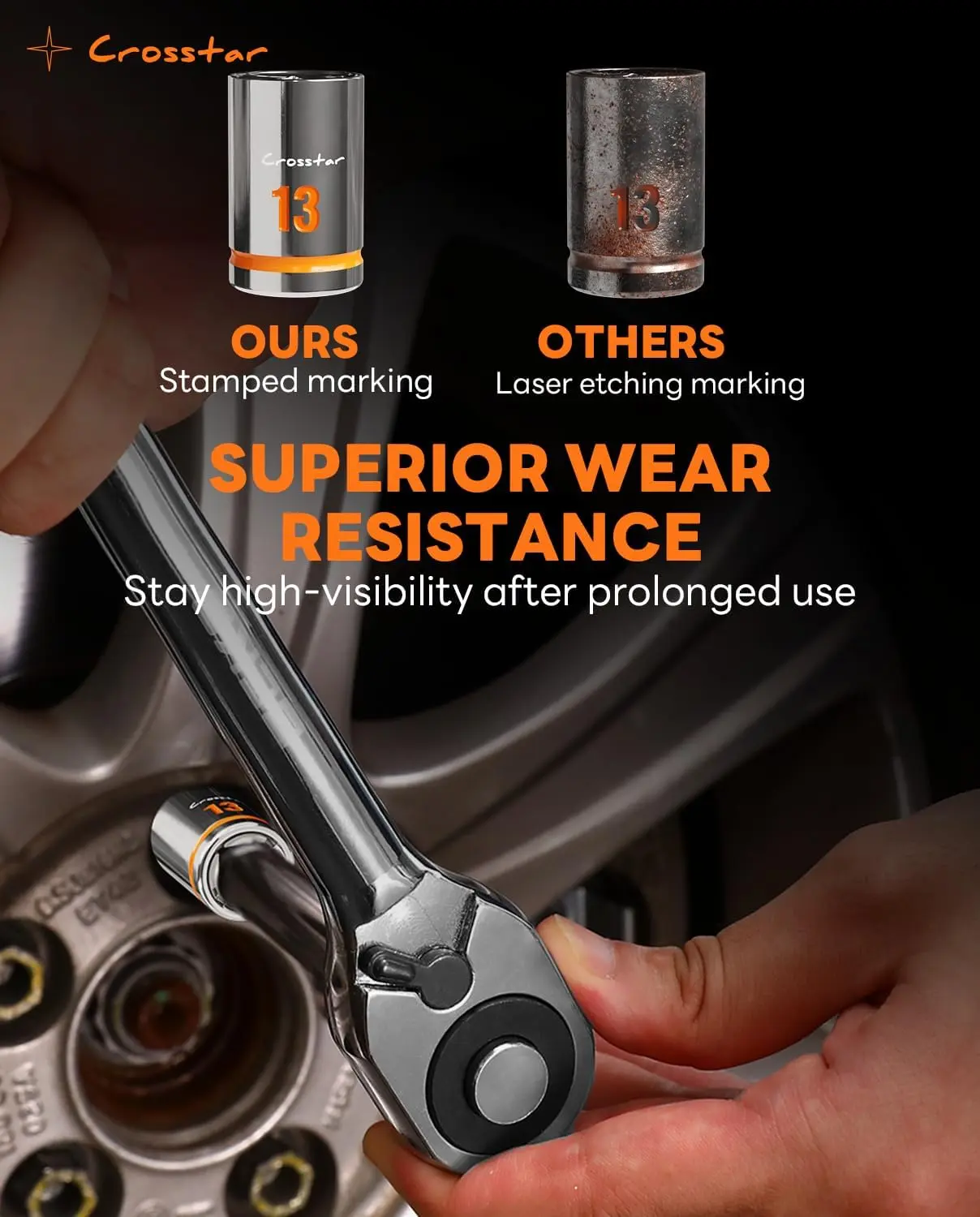 ·【High Visibility and Wear-Resistant Markings】Unlike ordinary laser-etched markings that fade and blur with long-term use, each socket of ours features stamped indentations filled with eco-friendly paint for size markings, paired with color-coded rings on the socket heads. This upgraded dual design ensures superb high-visibility, allowing you to quickly locate the right socket even in tight spaces, and the size marking is exceptionally wear-resistant—it won’t fade, smudge or wear off, keeping the size markings crystal clear for years of heavy-duty use!