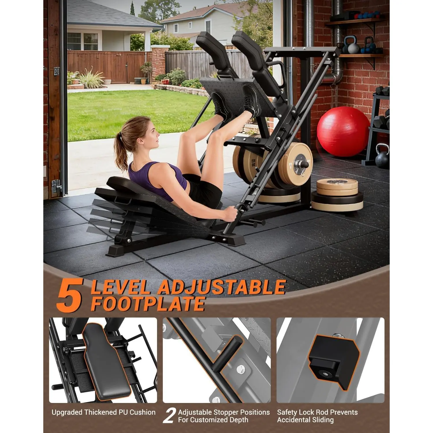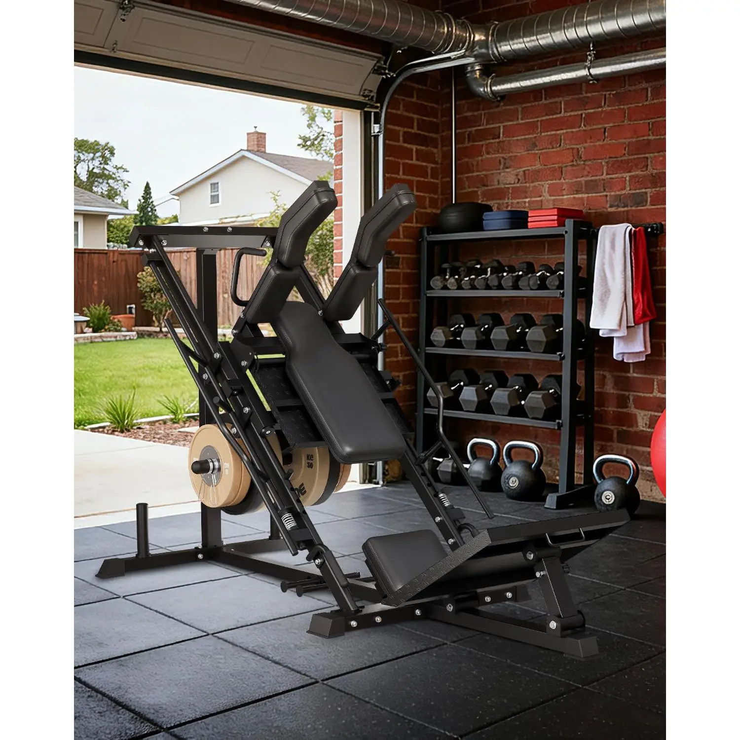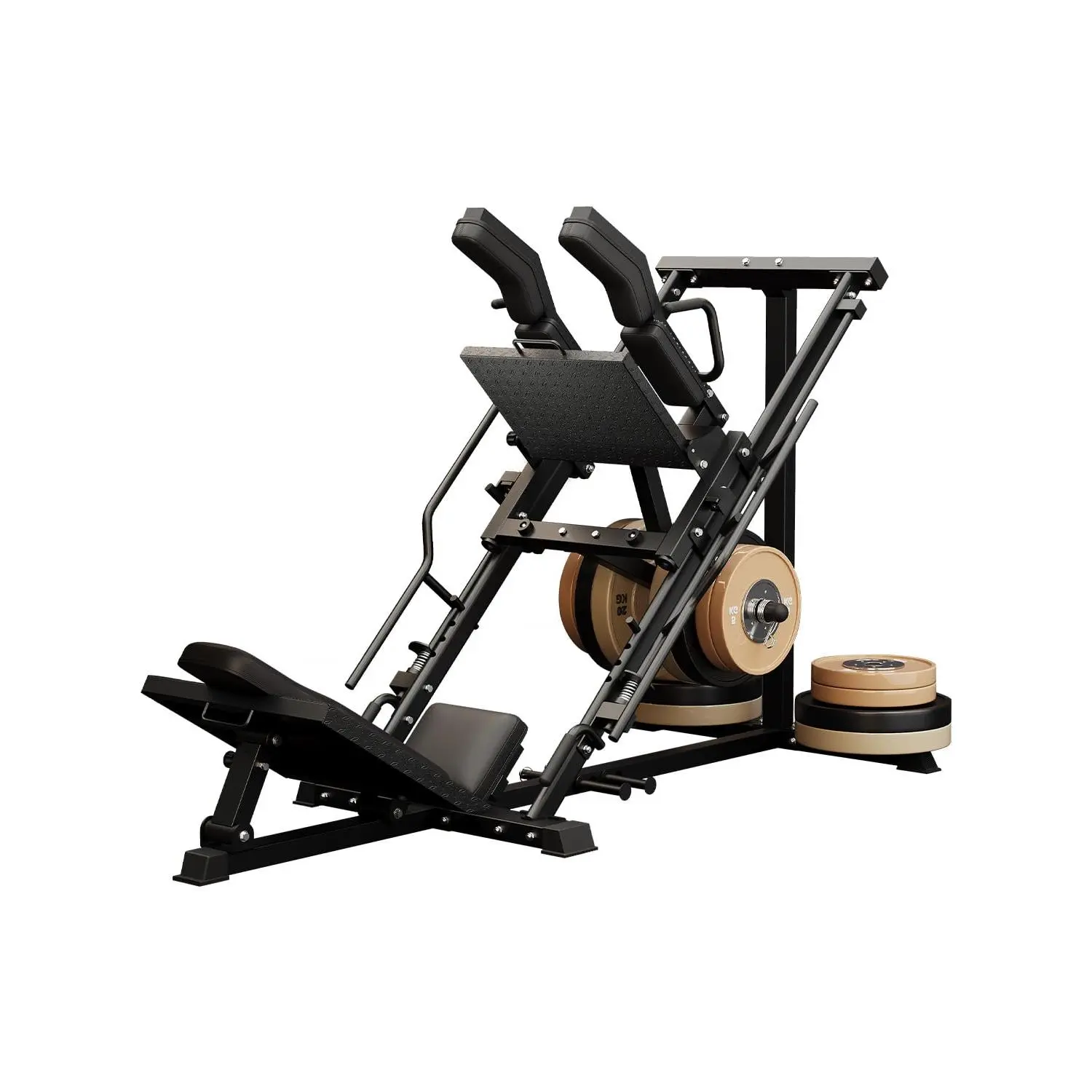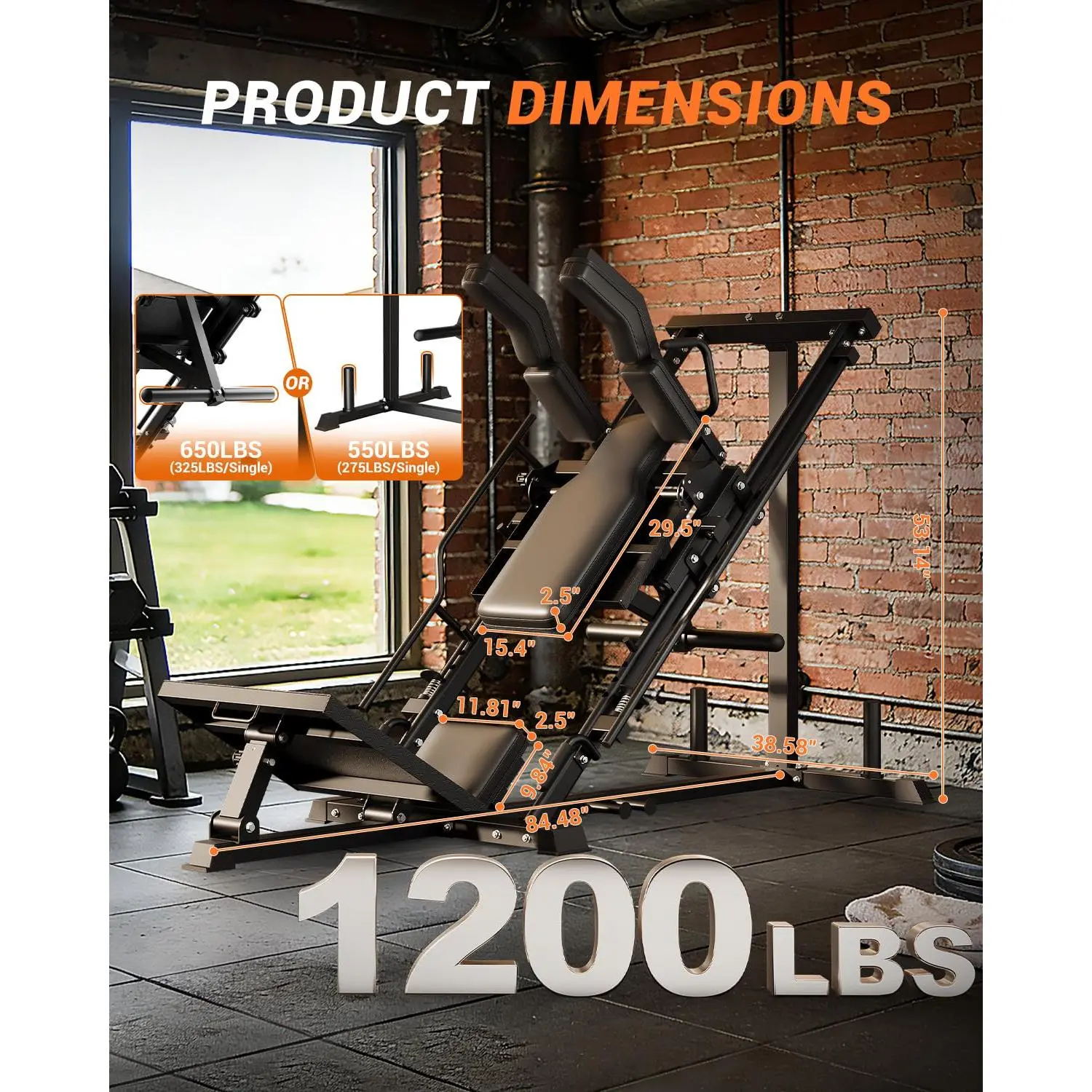 【Fits 2" Olympic & 1" Standard Plates + Home Gym Footprint】 Compatible with 2-inch Olympic and 1-inch standard weight plates. Machine size: 84.48" L × 38.58" W × 53.14" H, designed to build a dedicated lower-body station at home without a commercial gym footprint.