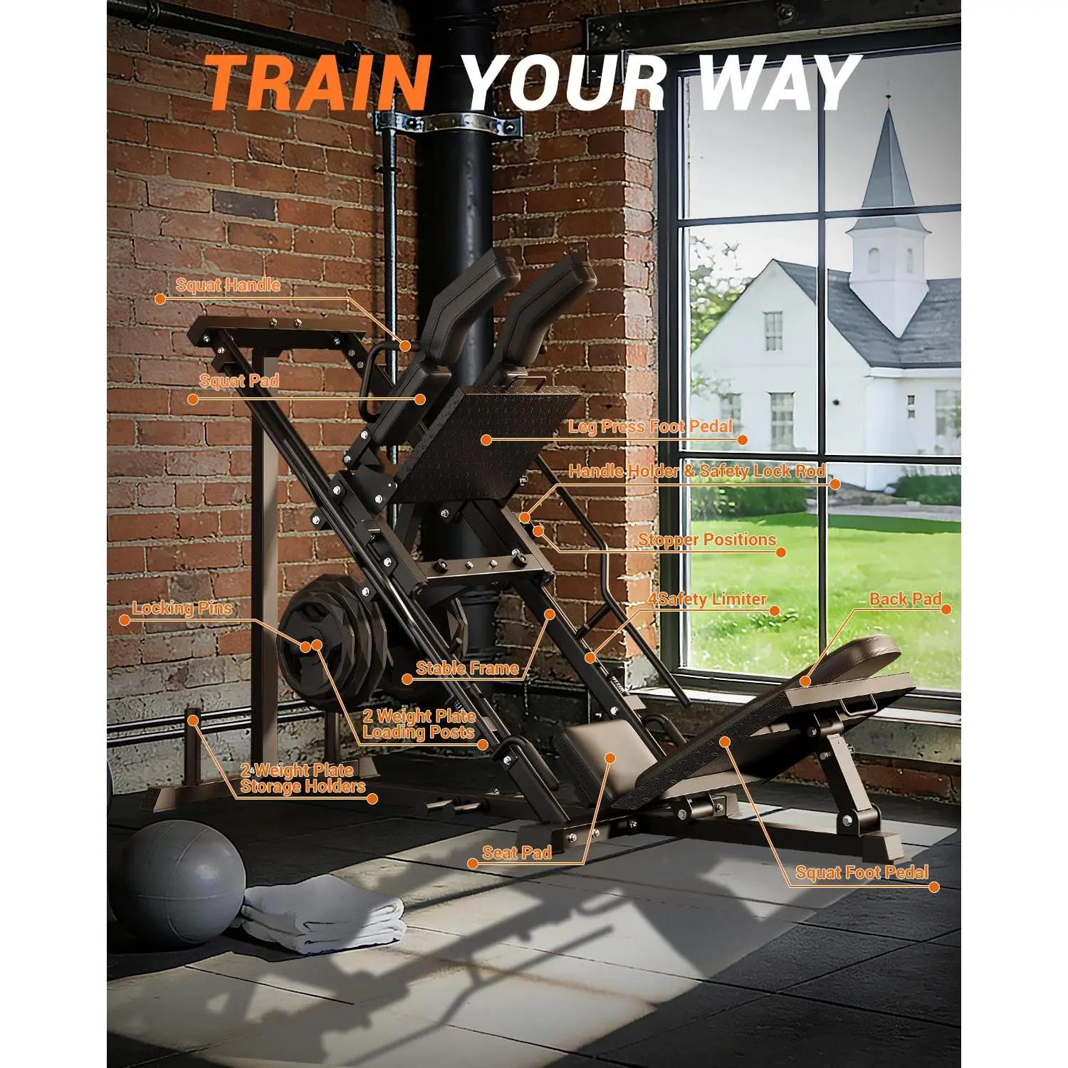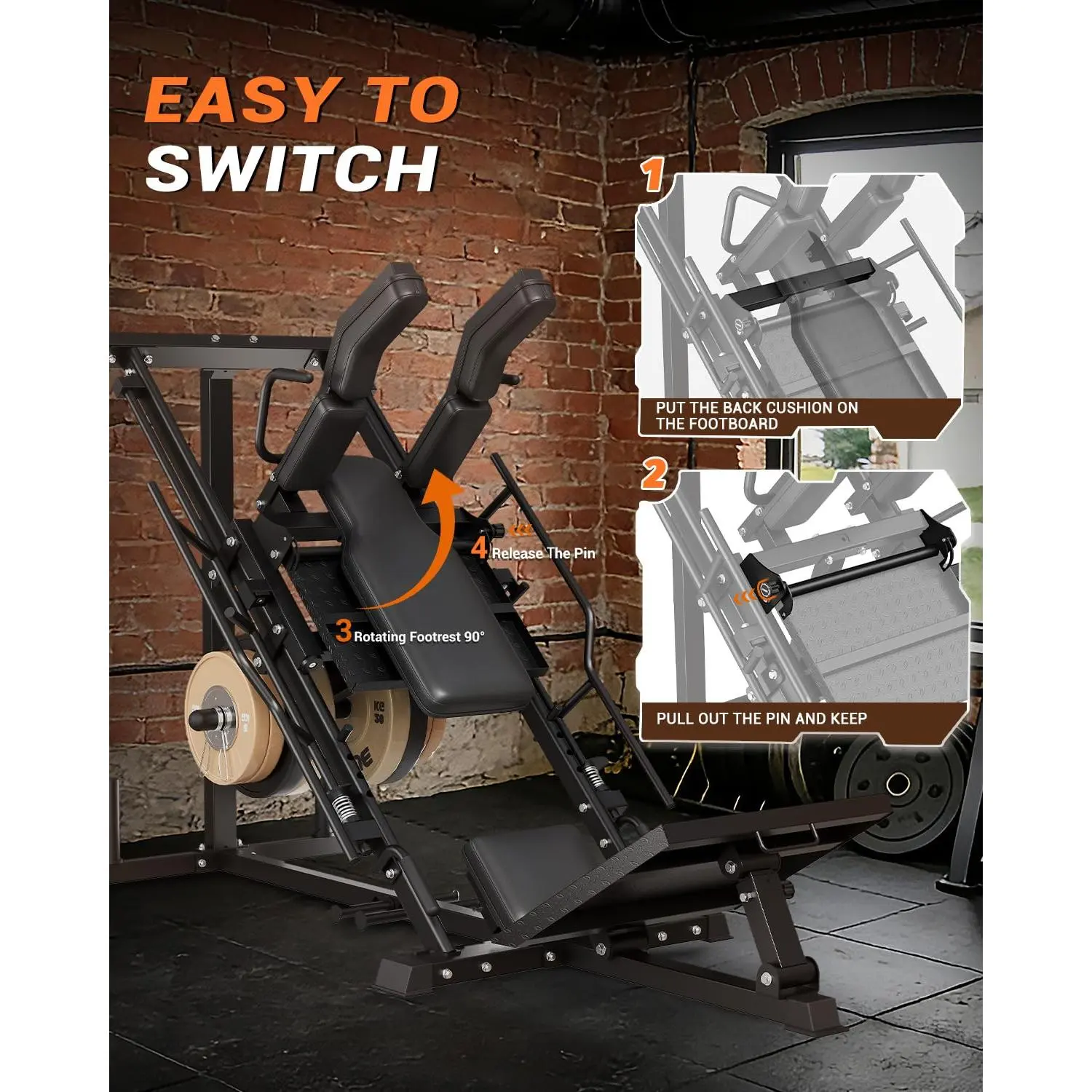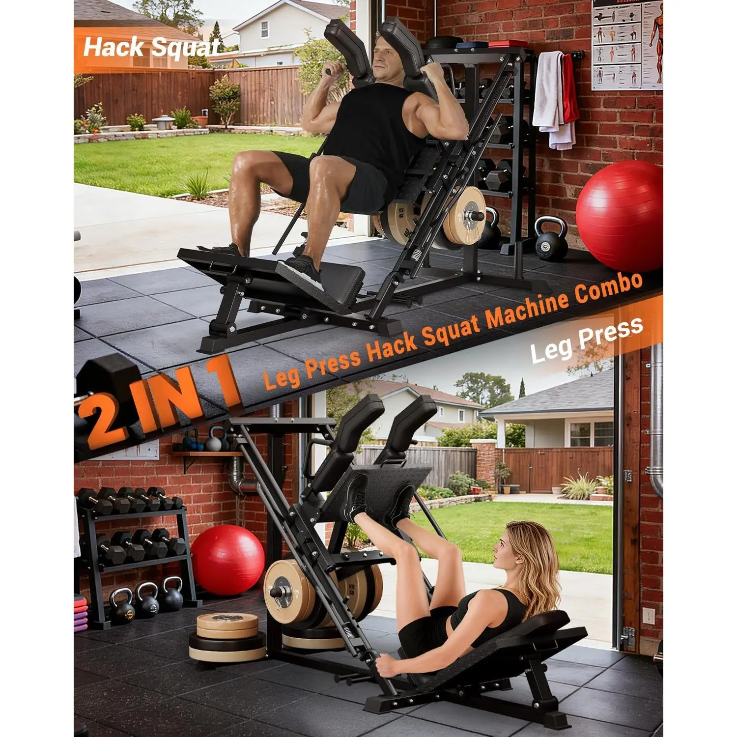 【2-in-1 Leg Press & Hack Squat Machine】 One compact, plate-loaded machine for leg press and hack squat—switch modes in about 10 seconds with the quick-change design. Built for home gym leg days to train quads, glutes, and hamstrings with controlled movement.