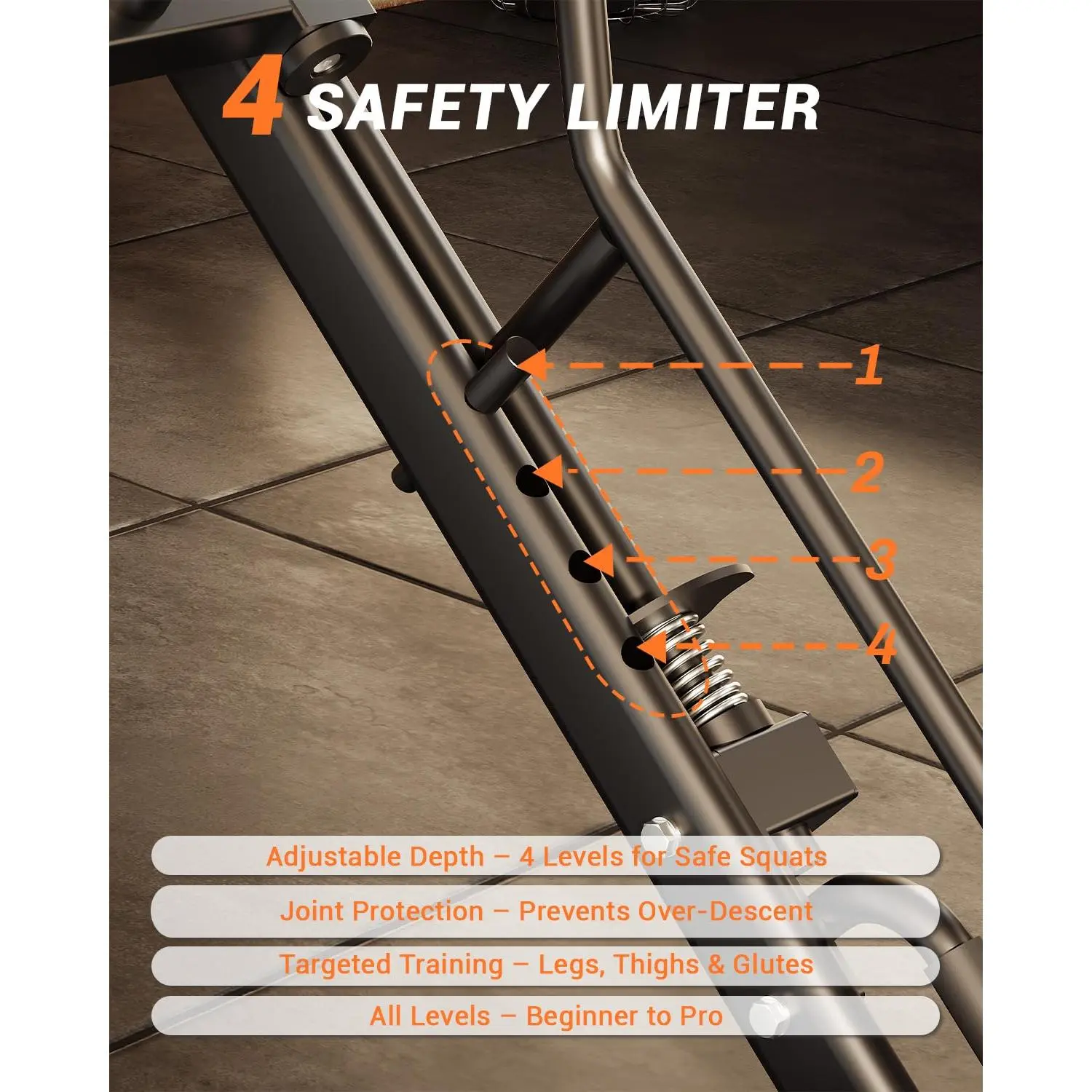 【4-Position Safety Limiters + Secure Handles】 Adjustable depth limiters help prevent over-travel and support safer range-of-motion training. Four stop positions fit beginners learning form and experienced lifters pushing strength, while dual safety handles add control during reps.