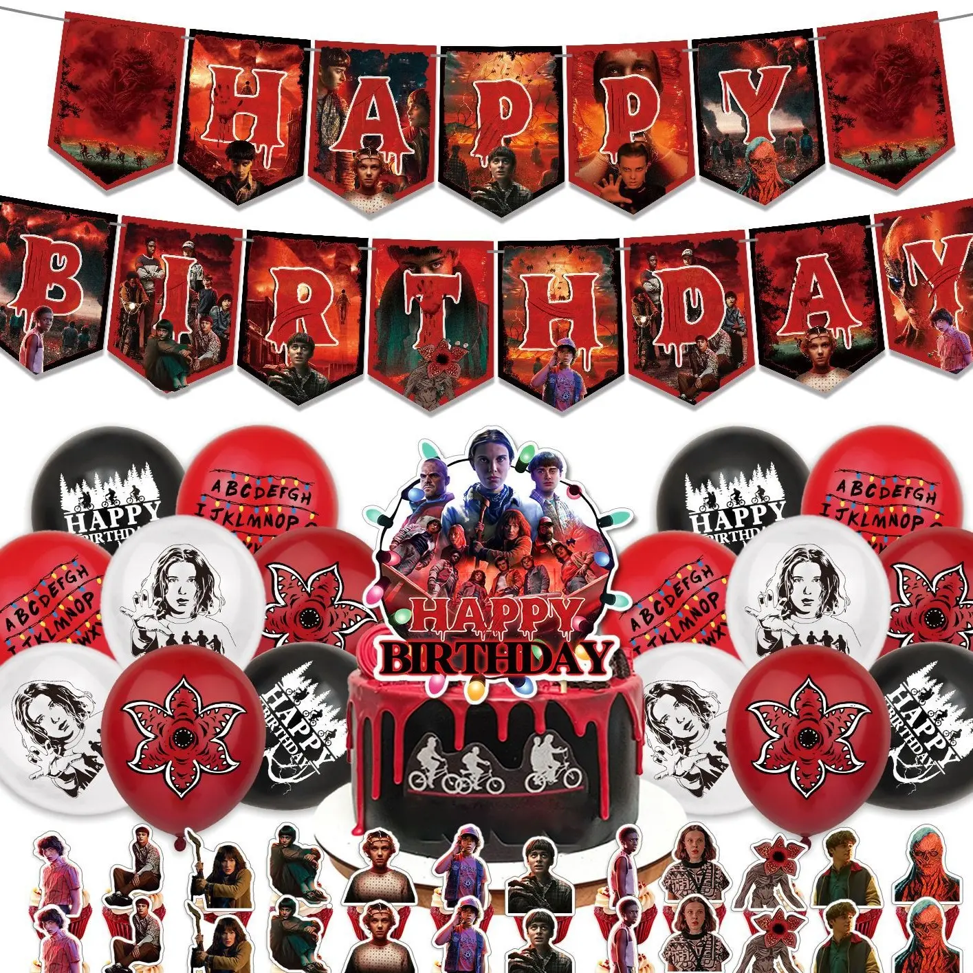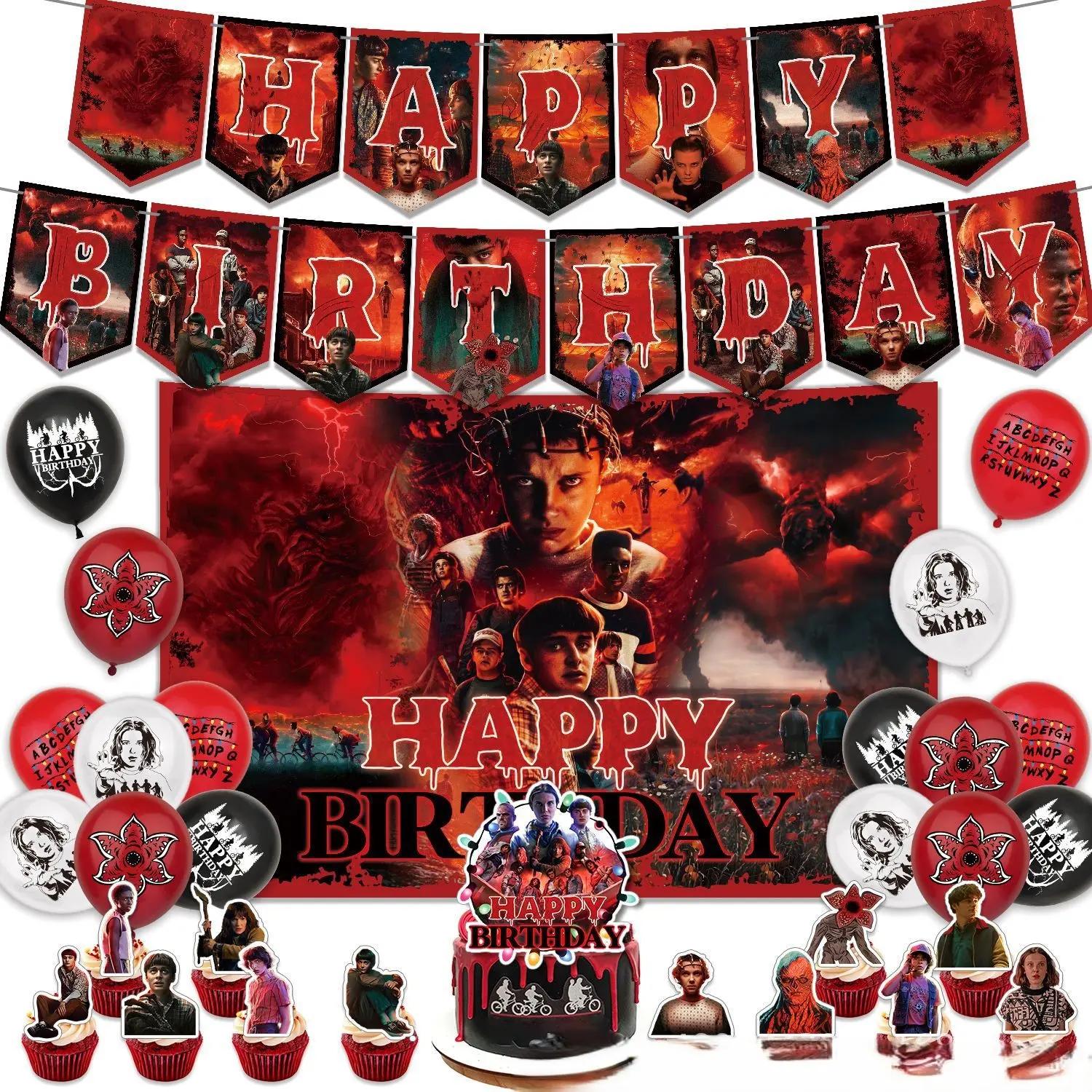 Transform your birthday party into a Stranger Things adventure! This set includes a banner, backdrop, balloons, and cake toppers. Perfect for fans of the show, it creates an immersive atmosphere. Each item is designed to capture the essence of the series, making your event unforgettable.