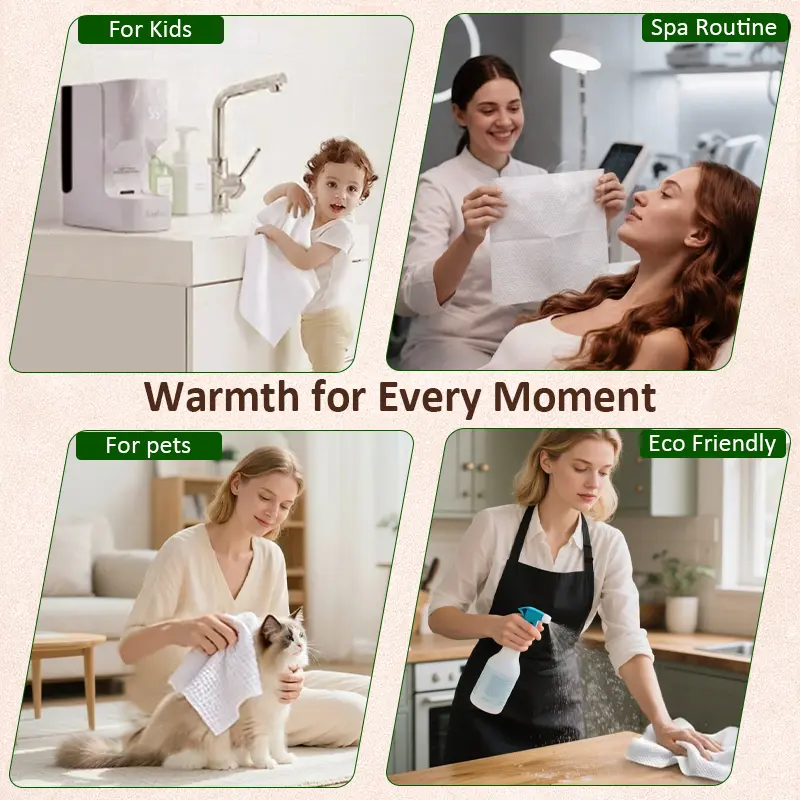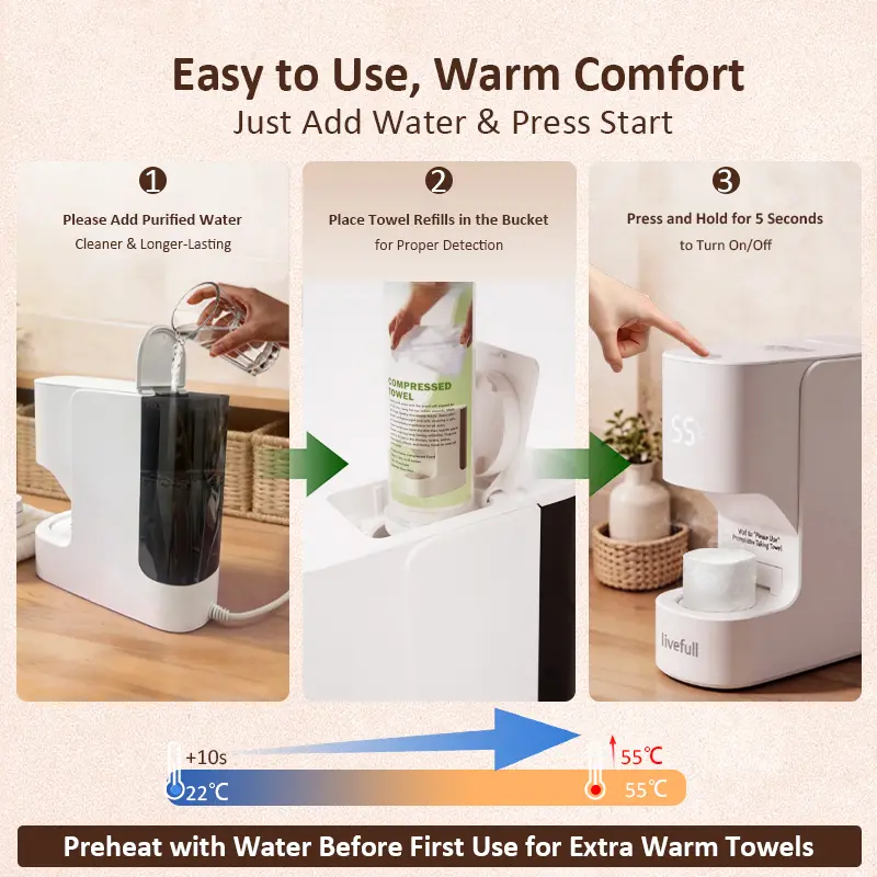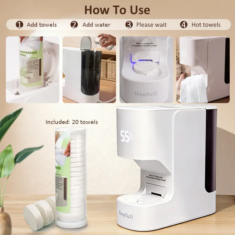 Just add water, drop in a compressed towel, and press the button. The machine heats the water and automatically expands the towel into a warm, ready-to-use towel.