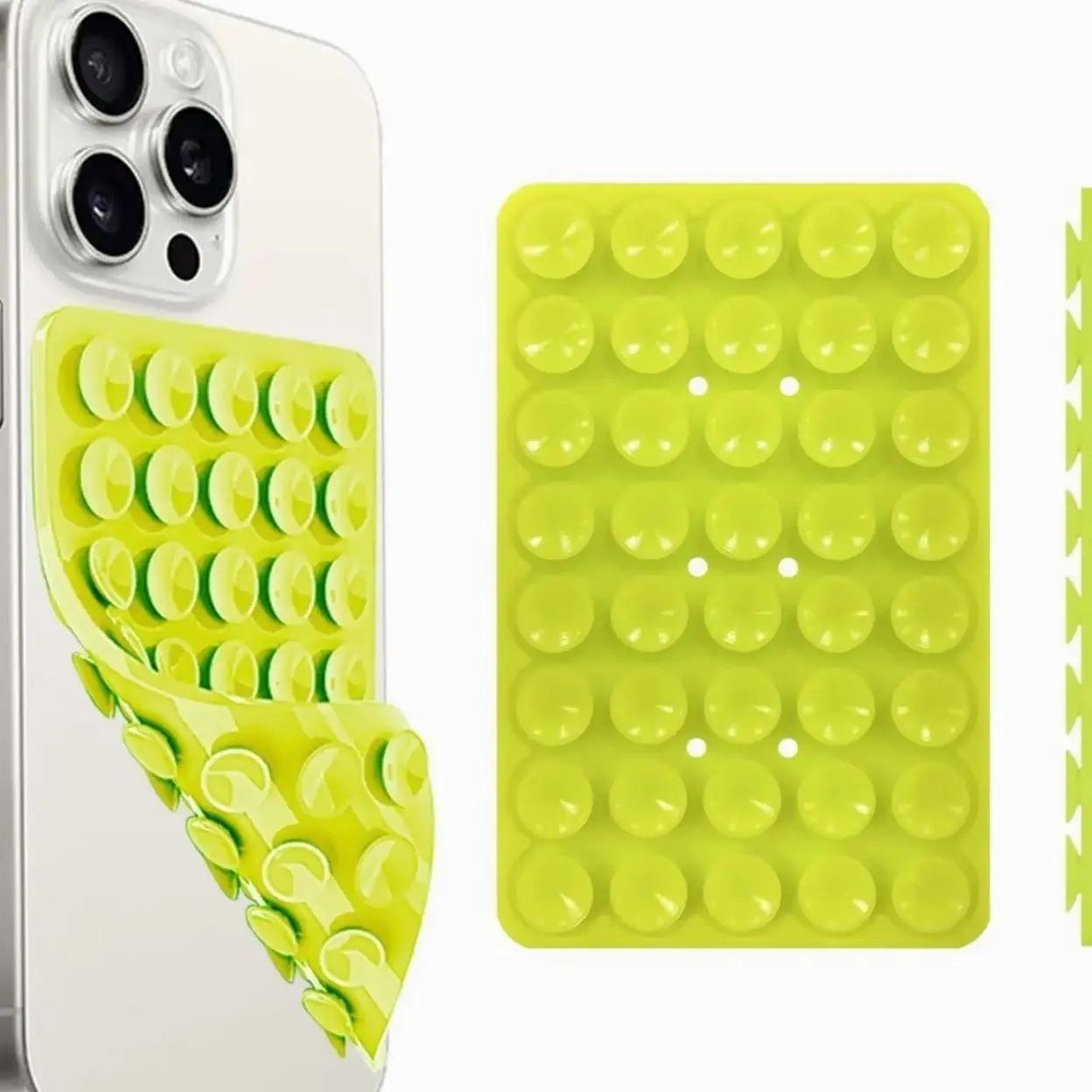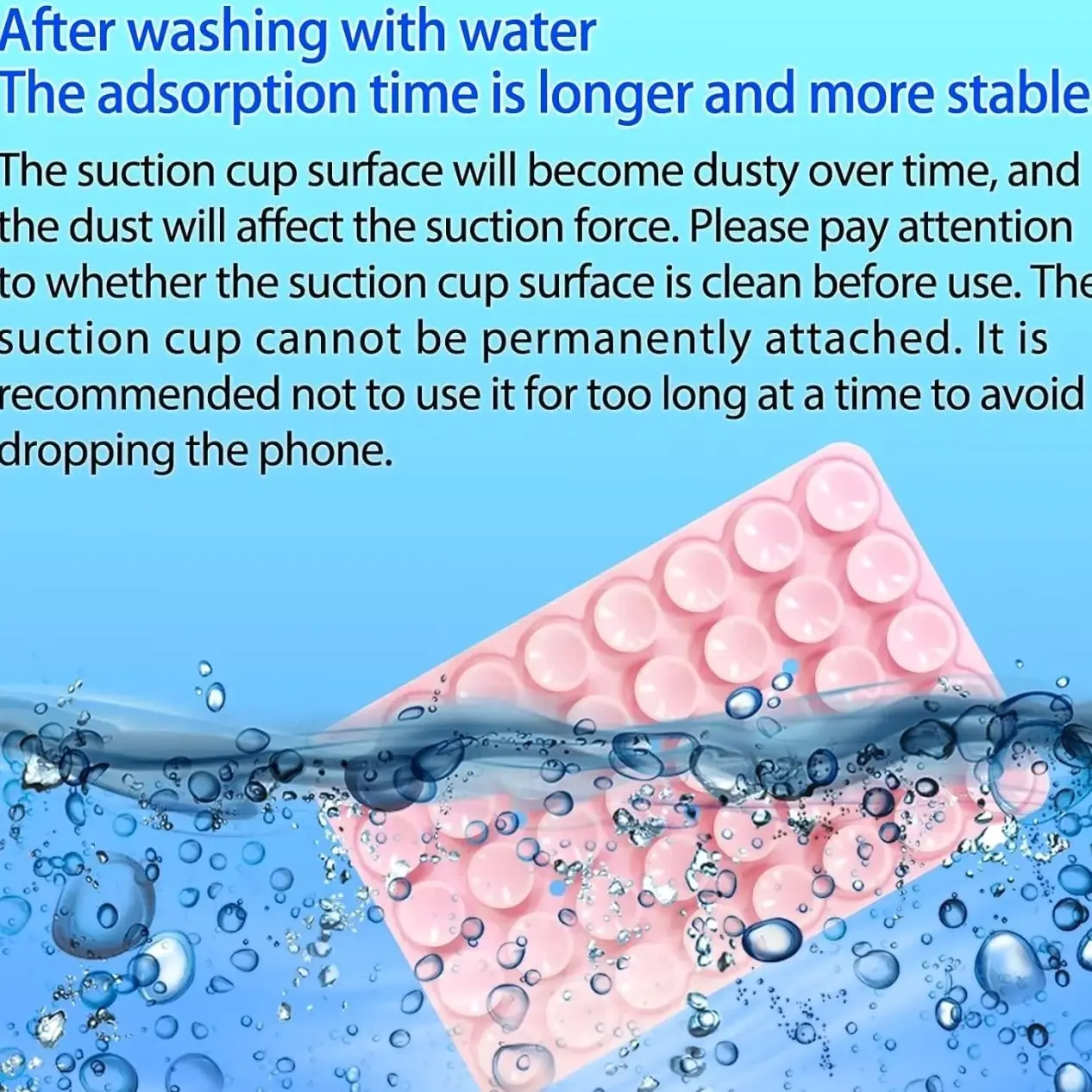 The image shows the silicone suction cup phone case mount in use, demonstrating its strong grip and dual-sided functionality.