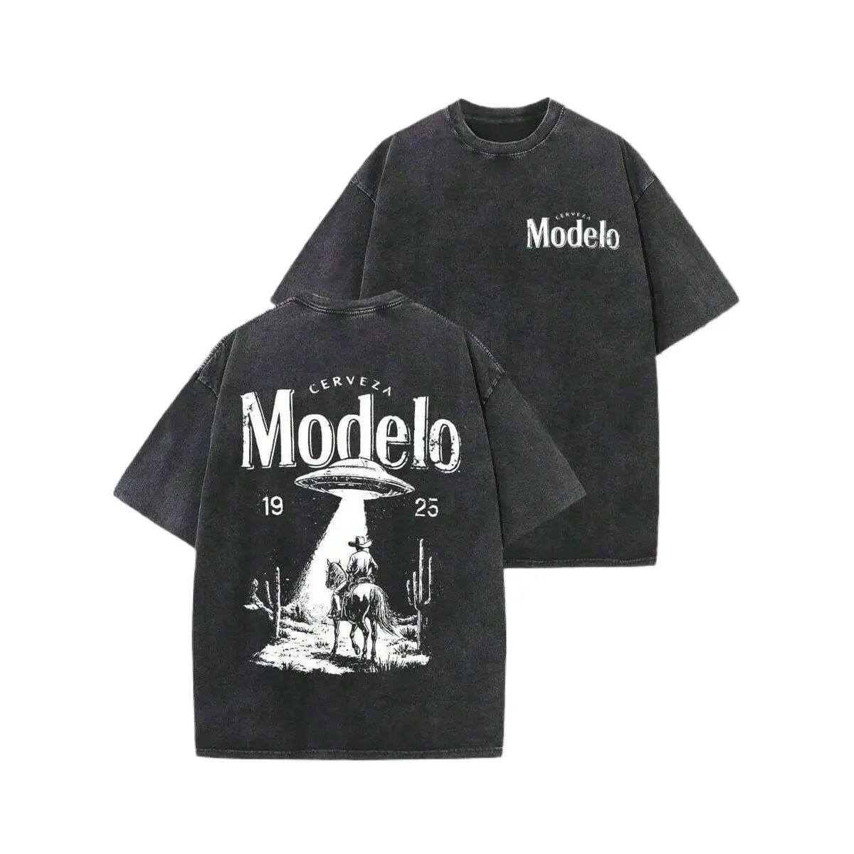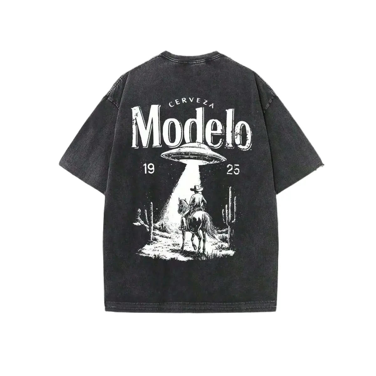 Vintage Washed Black Modelo Graphic T-Shirt Unisex, Retro Distressed Oversized Crew Neck Short Sleeve Tee, Western Cowboy UFO Abduction Print Cerveza Beer Streetwear Casual Top for Men Women, Outdoor Daily Wear