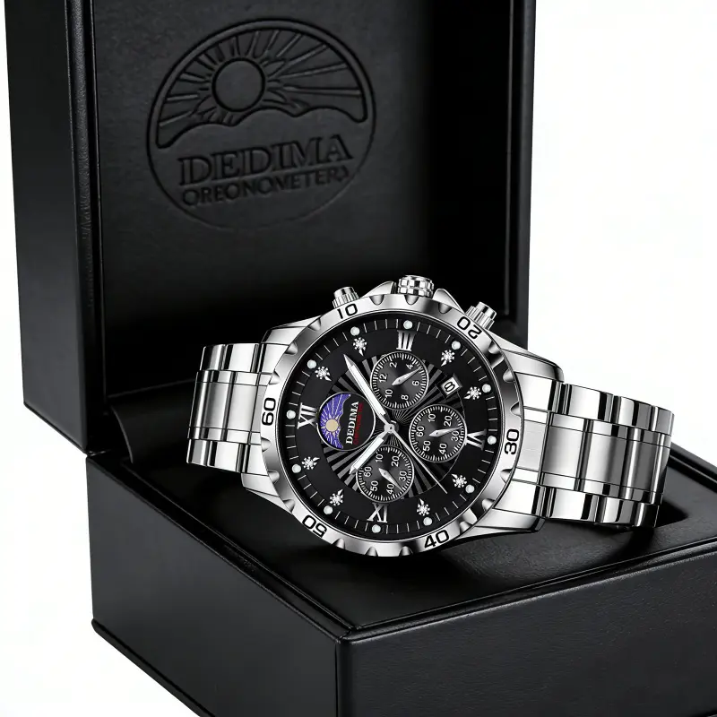 Special features: luminous display, calendar, small seconds hand, moon phase display