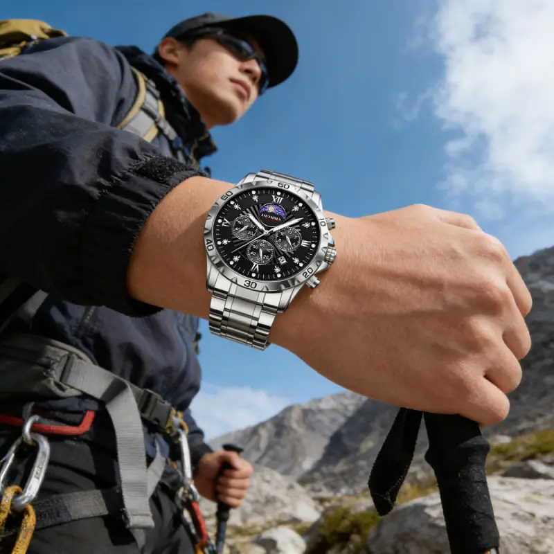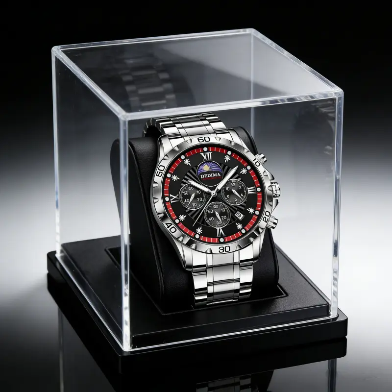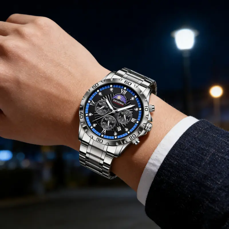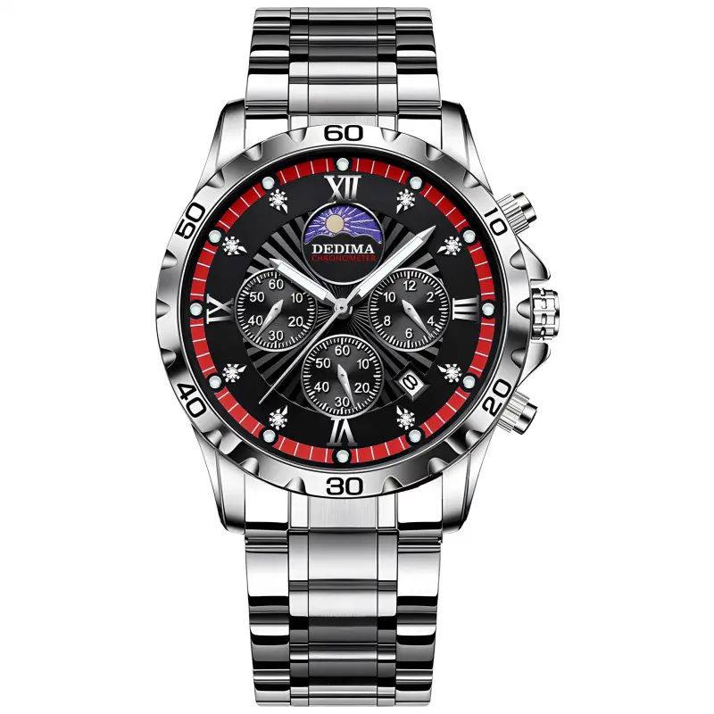 Color: Steel band with black surface, steel band with black and red surface, steel band with black and blue surface, leather strap with black surface, leather strap with black and red surface, leather strap with black and blue surface