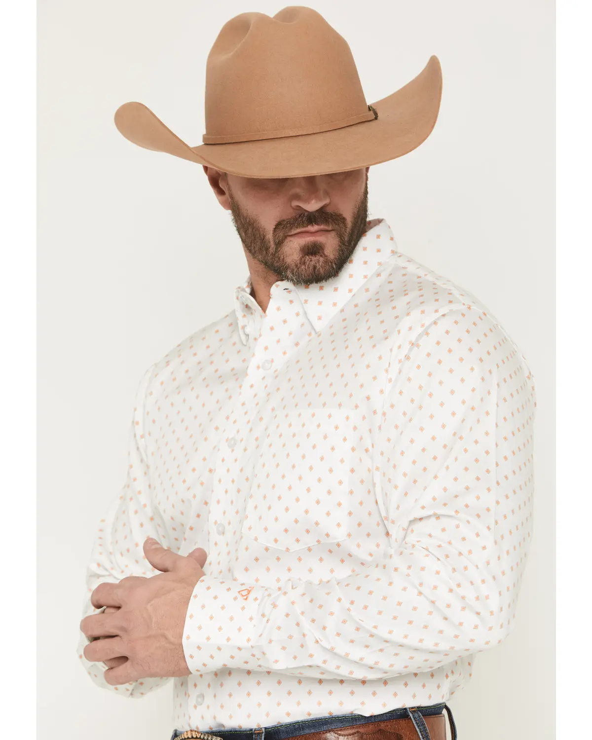 Model is 6'1" wearing a size large. 100% cotton. Spread collar. Long sleeves. Button-down placket and cuffs. Single patch pocket on left chest. White with orange and tan micro medallion print. Straight yoke on back. Cody Johnson logo embroidered on left cuff. Imported.