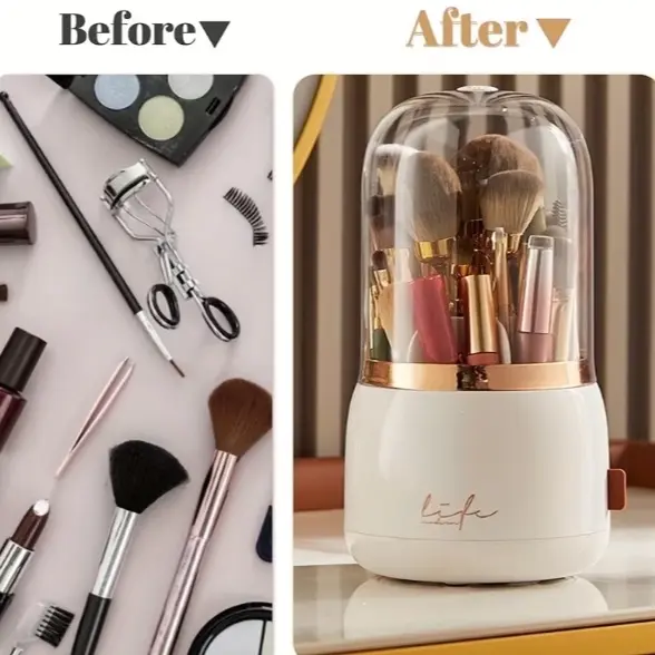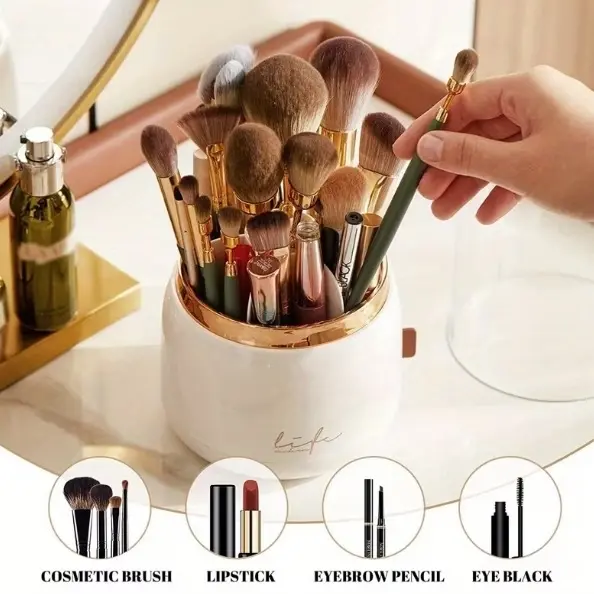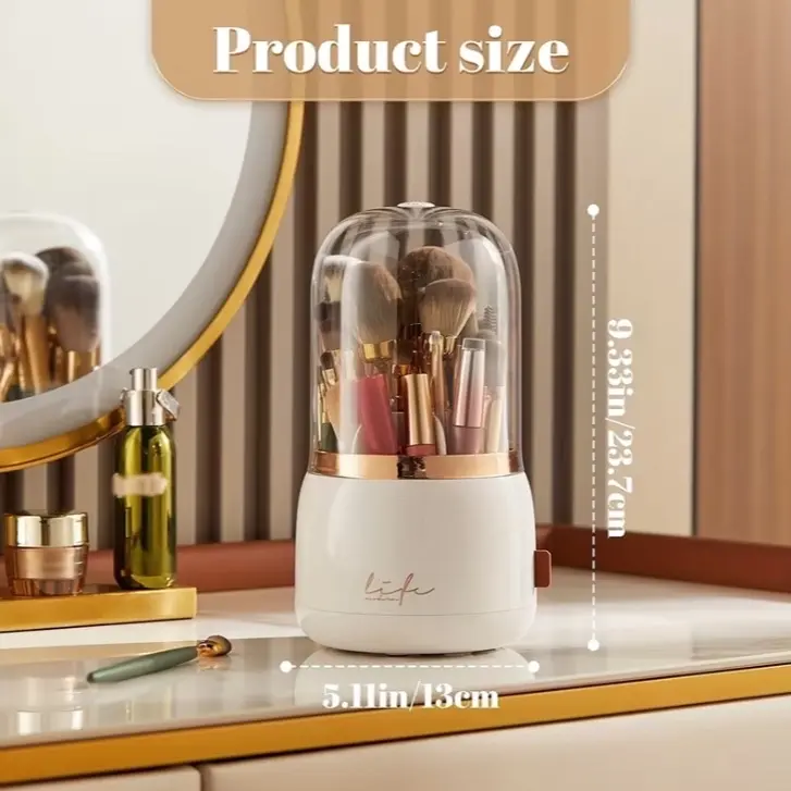 This Makeup Brush Holder Organizer with a lid is perfect for your vanity or bathroom countertop. It features a clear acrylic cover that keeps your brushes dust-free. The rotating design allows easy access to all your brushes. Ideal for maintaining an organized space.