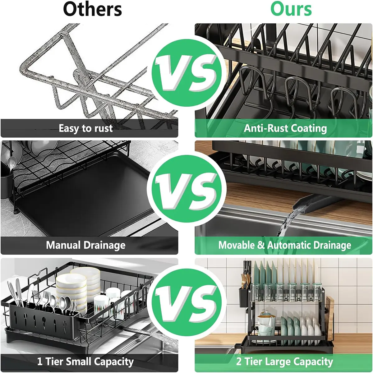·2-Tier Design: This rack features two compartments, allowing you to dry multiple dishes simultaneously.