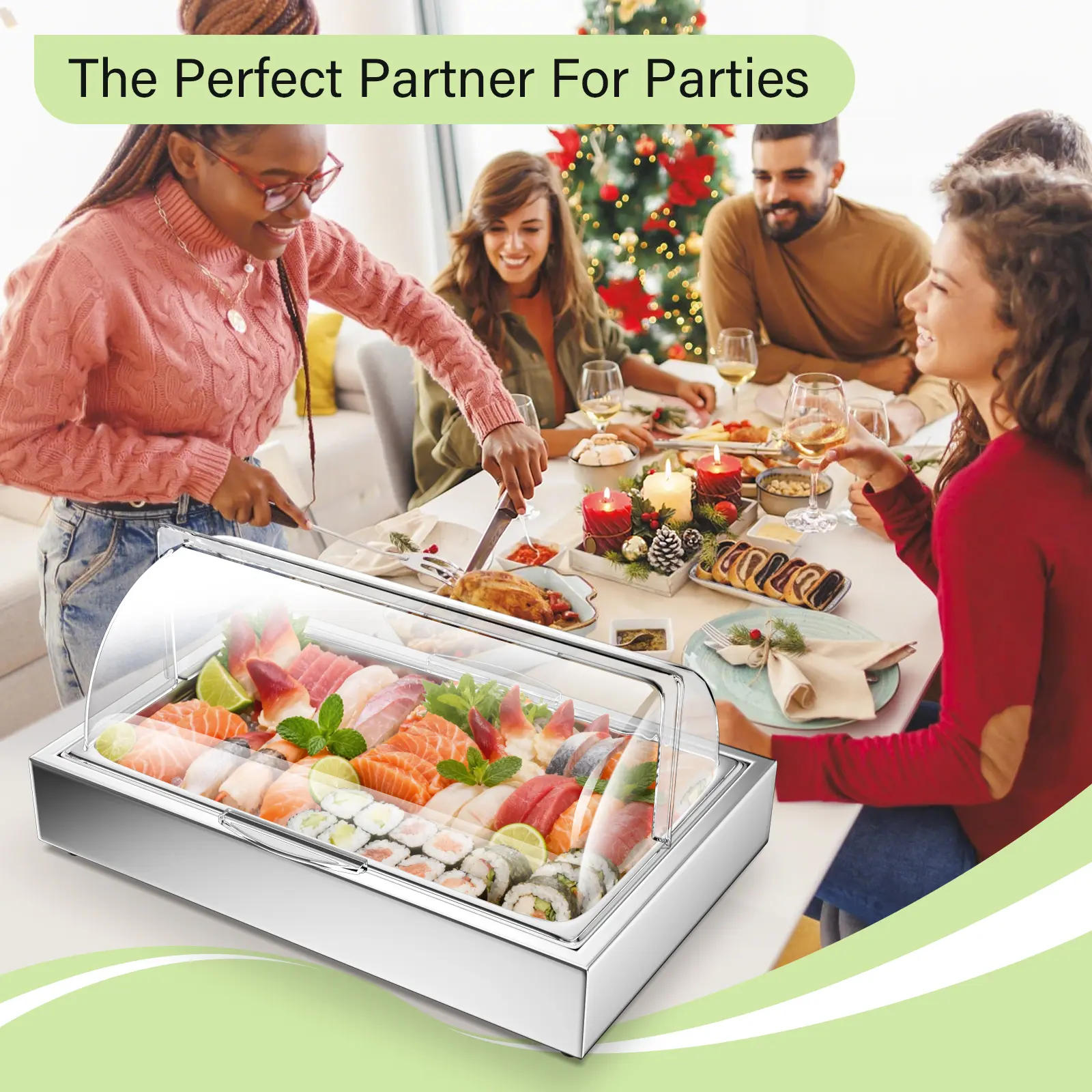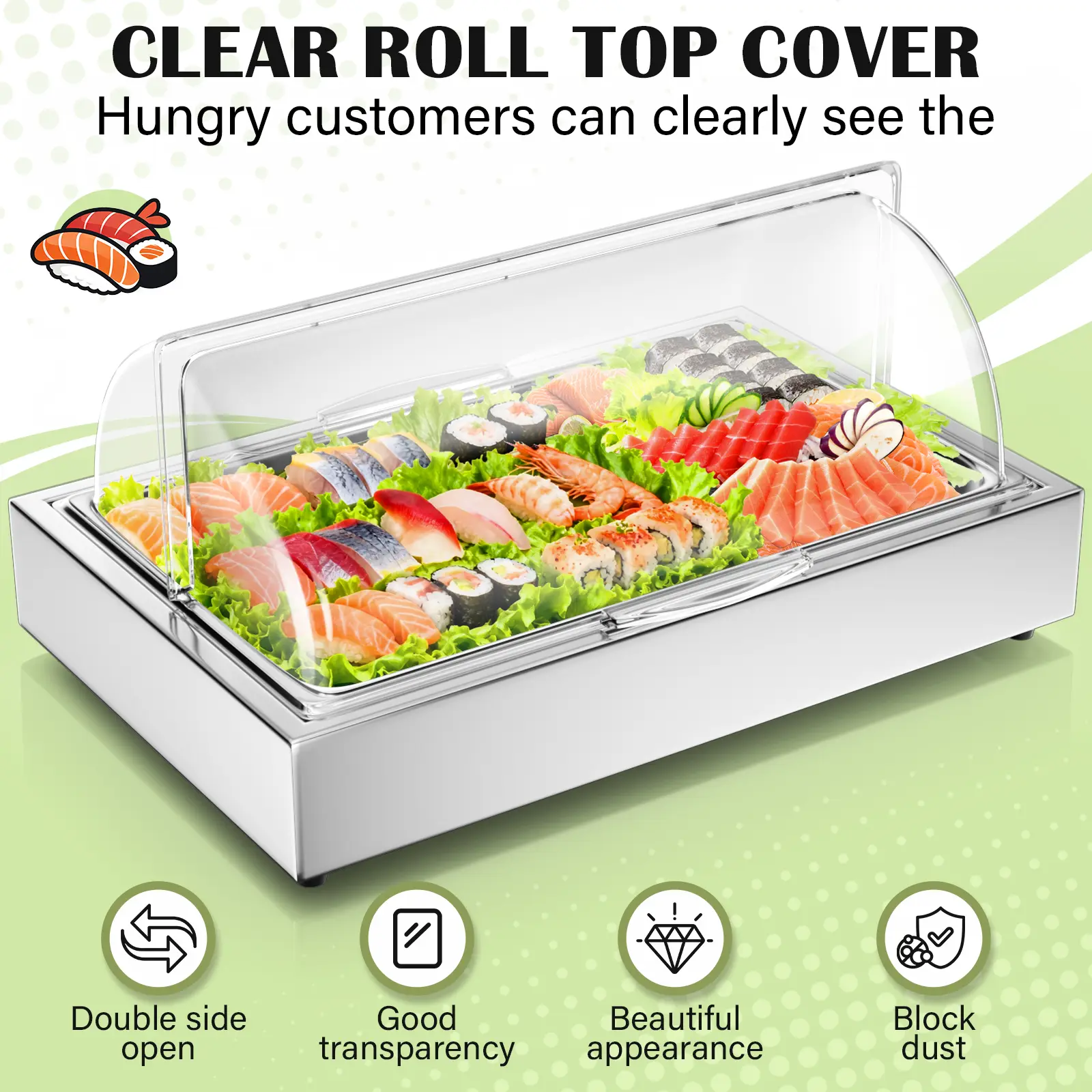 ·Clear Roll Top Cover:The PC cover has good transparency and visualization. Roll top cover can be opened on both sides, making it convenient for people on both sides to take food in buffet occasions.