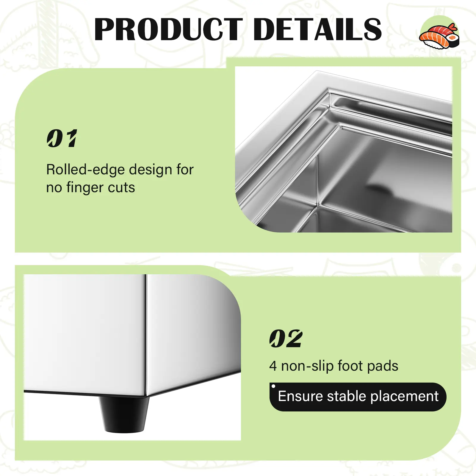·Food grade stainless steel:Serving tray is made of thickened stainless steel, which is stable and not easy to deform. Ensuring durability and a long service life.There are 4 non-slip foot pads on the base to ensure stable placement.