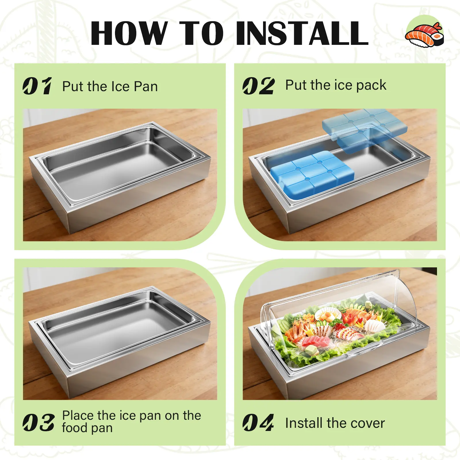 ·2 Ice Packs and 1 clip:The countertop display case has 2 ice packs and 1clip, which can be filled with water and frozen, then put them into the a gap between the tray and the bottom basin to preserve your various fresh foods, such as sushi, sashimi, seafood, salad and fruits, etc.