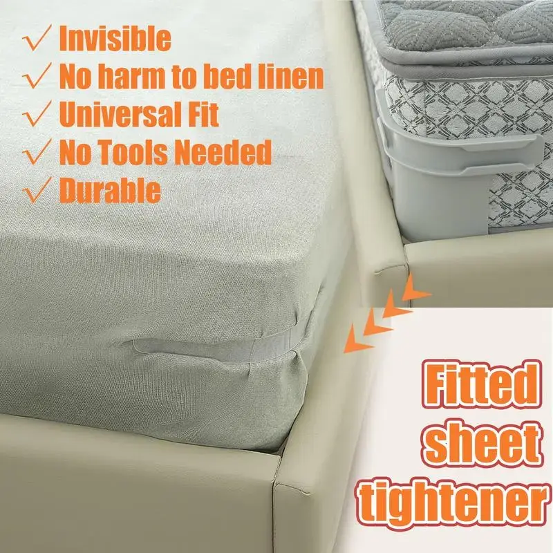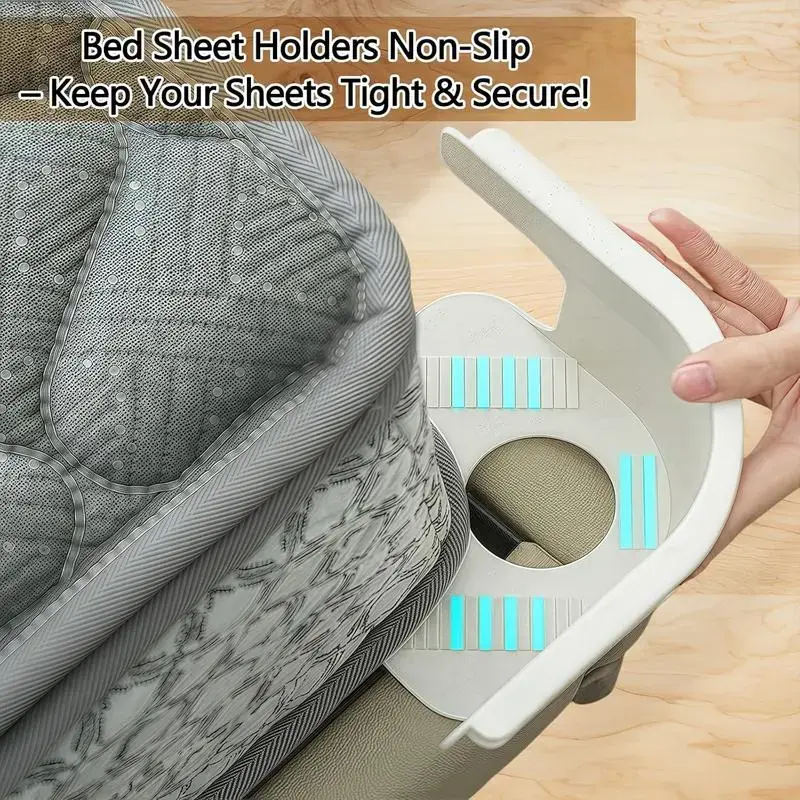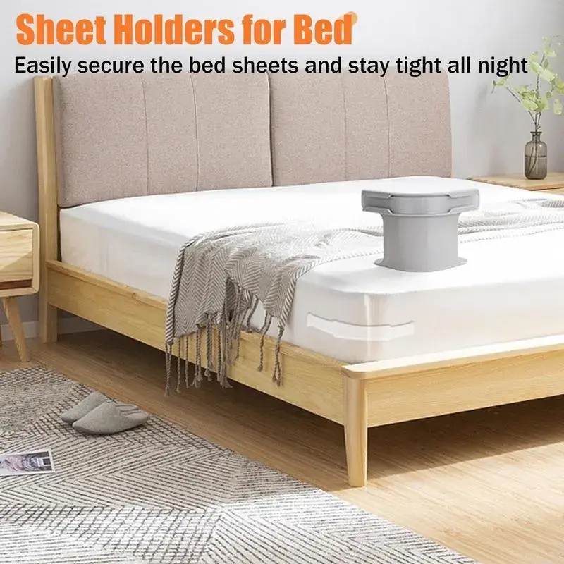 Keep Your Sheets Tidy&Wrinkle-Free:Our fitted sheet holders for corners can keep the bed sheets in place without wrinkles,sheet clips allowing for a comfortable night's sleep.• Suitable for all Mattresses: Our bed sheet clips can be well matched with various types of beds, whether it's a single bed,a twin bed, a king-sized bed or an extra-large bed,or summer/winter sheets.Bed sheet straps are designed to fit all bed sheet types and mattress sizes.