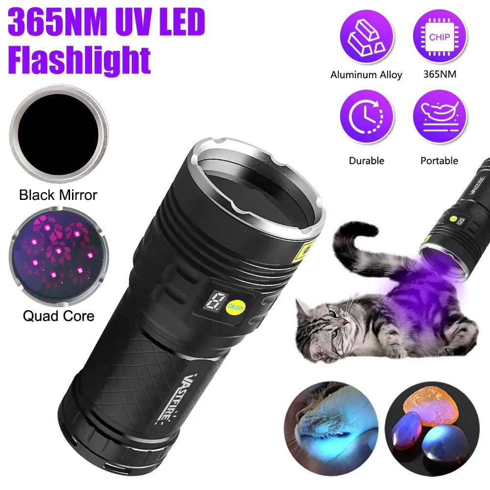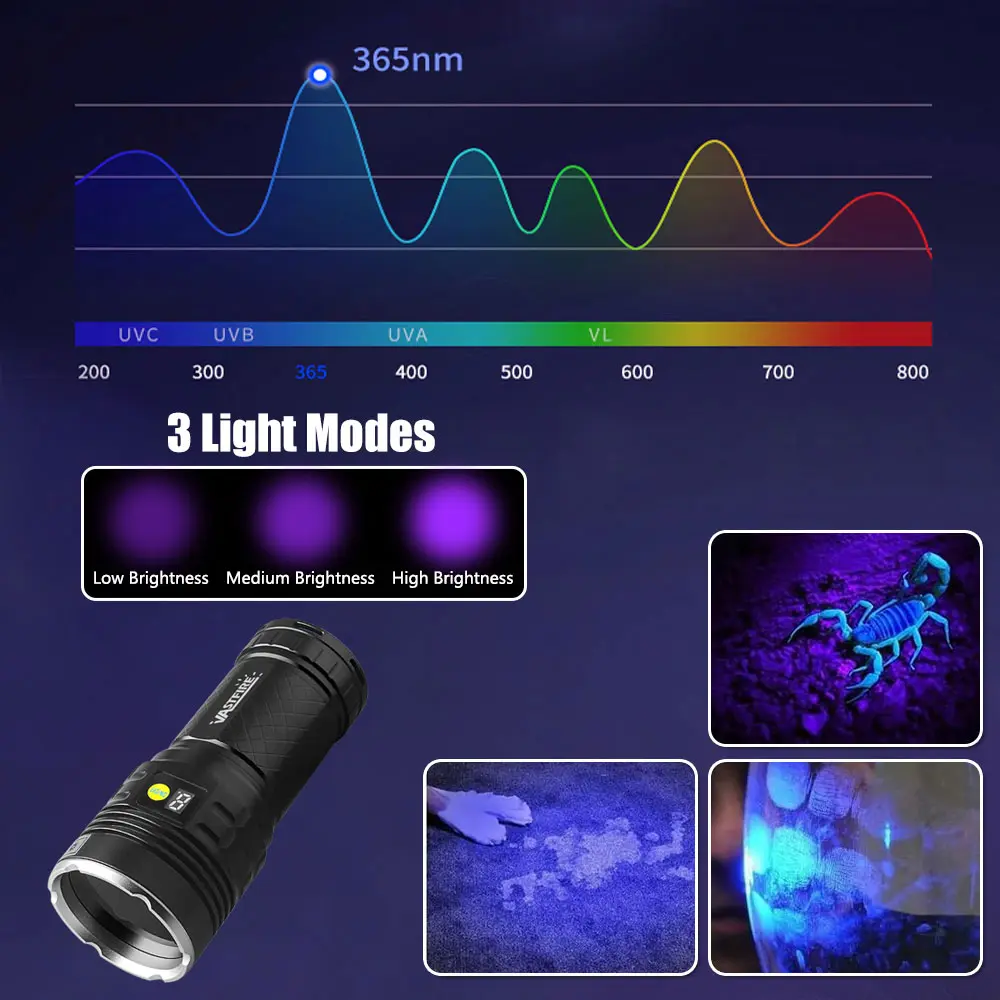 365 nm UV flashlight, USB rechargeable, high power black light, suitable for pet urine detection, resin curing, mineral identification, blood trail tracking, scorpion capture, rock treasure hunting, gemstone identification, and air conditioner leak detect