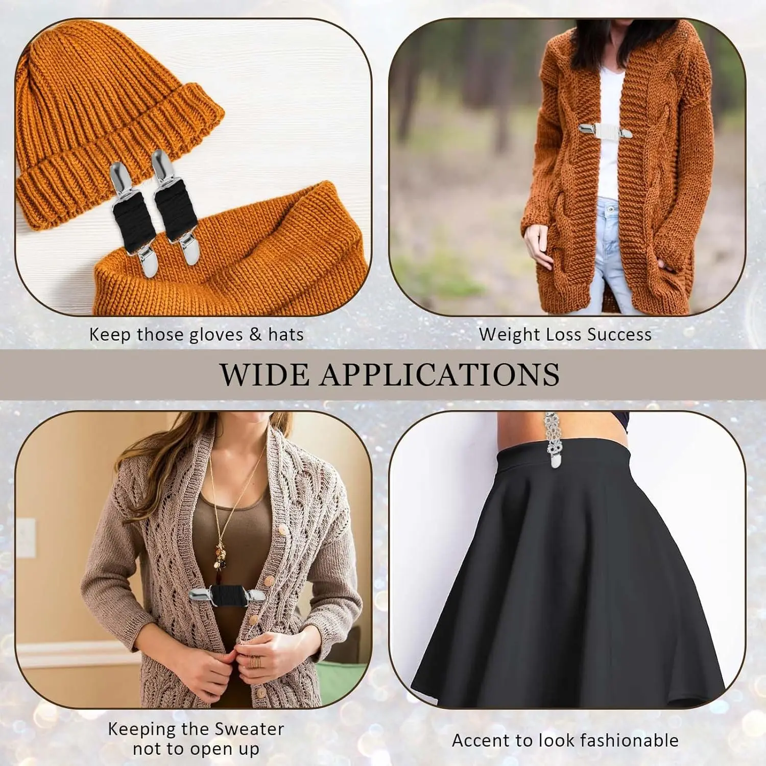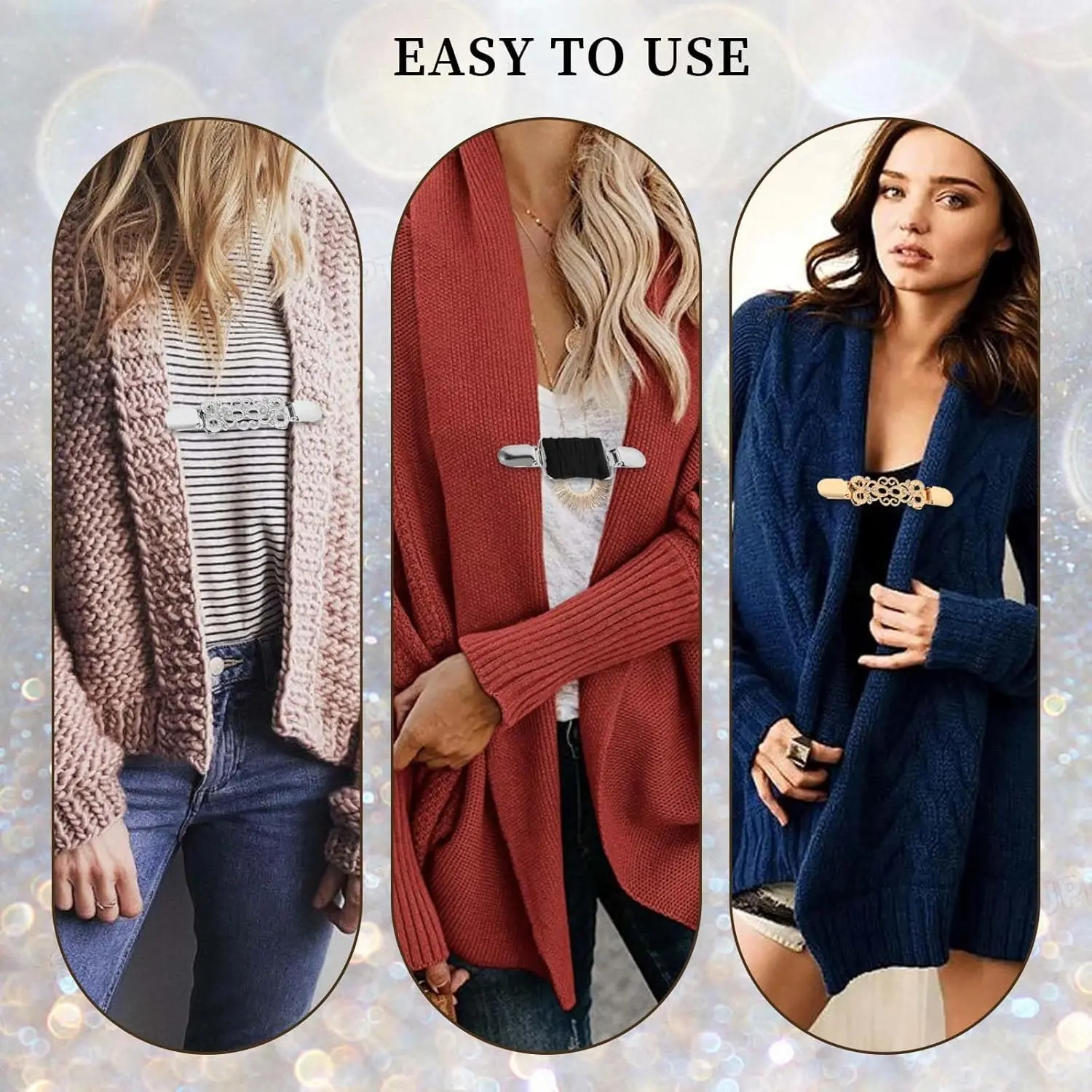 These clips are great for a variety of clothing items, such as sweaters, dresses, jackets, and scarves. Perfect for both formal and casual events, including weddings, dates, and daily wear.