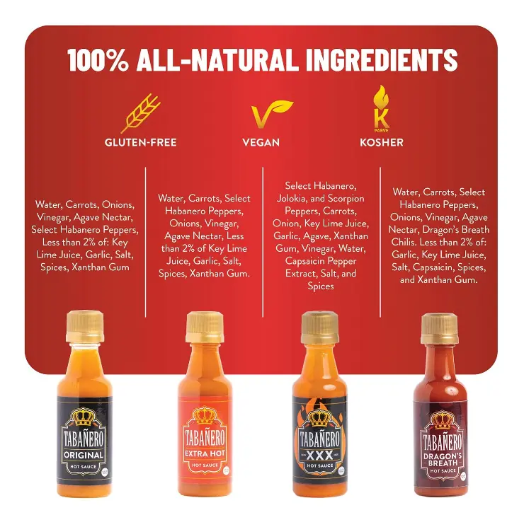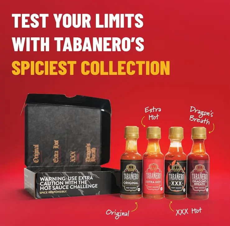 ·HOT SAUCE CHALLENGE SET Take the heat to the max with the ultimate Tabanero Hot Sauce Challenge! This mini sampler pack lets you try 4 of Tabanero's spiciest options, including Original, Extra Hot, XXX Hot, and Dragon’s Breath Hot Sauce.