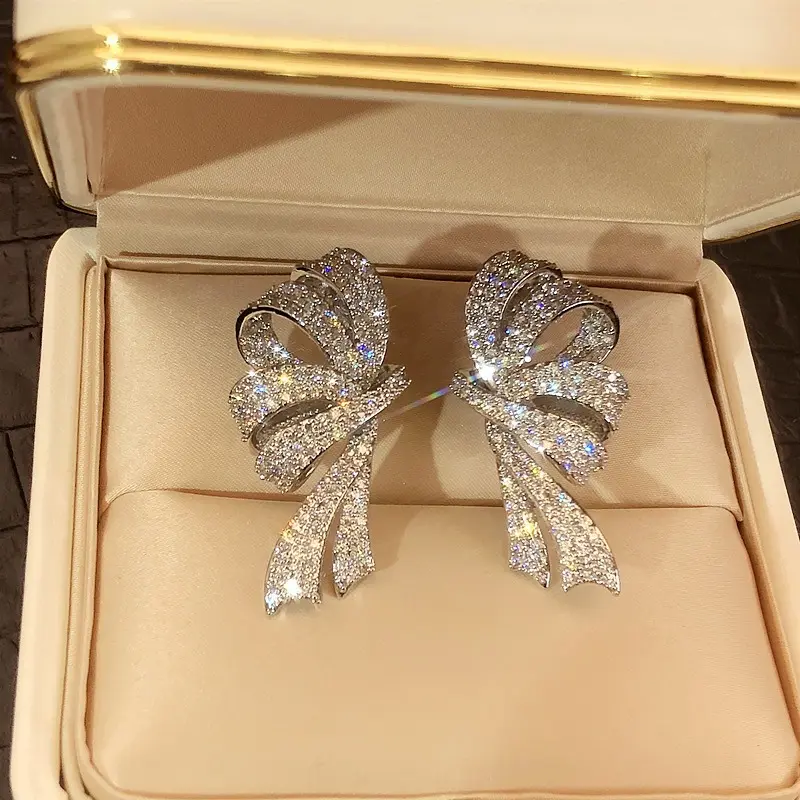 Three-dimensional bow earrings, full of diamonds, dazzling and sweet, light luxury, ultra-shiny, diamond-studded, high-end earrings with exquisite elegance. birthday gifts for gf