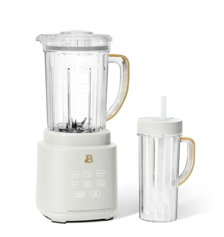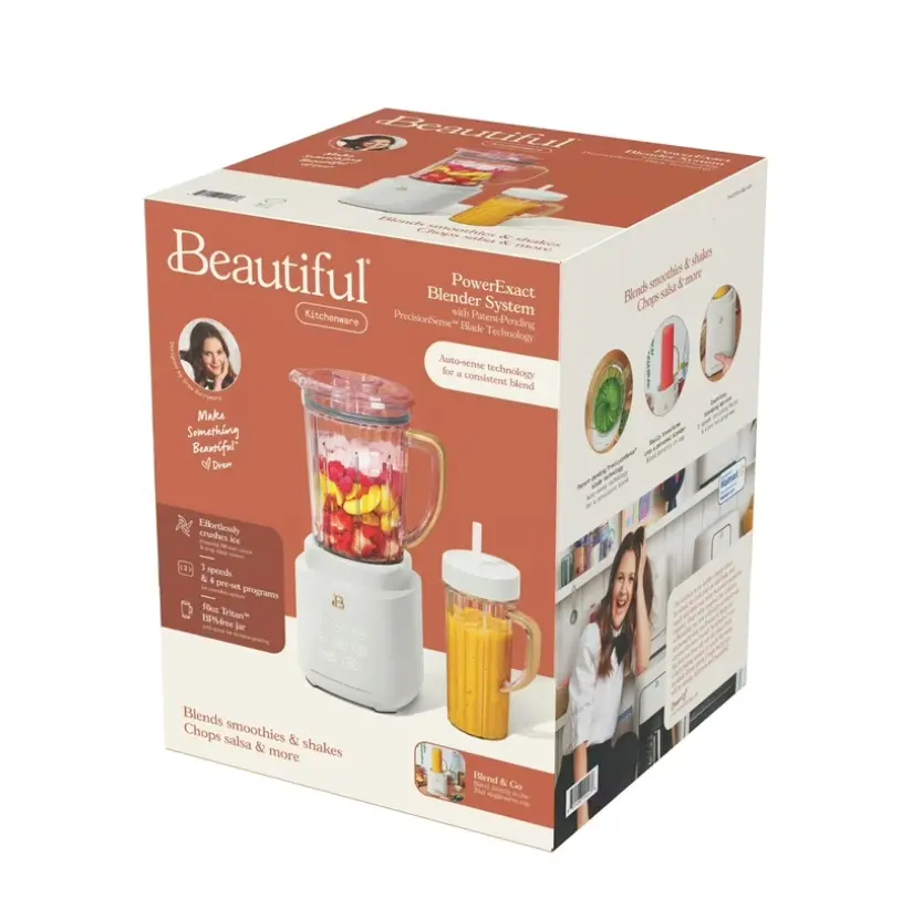 Consistent smoothies, soups, and salsas await with the Beautiful PowerExact Blender System. It features our PrecisionSense Technology designed to adjust blade speed and power based on the type of ingredients you’ve added. The result? A consistent blend every time. A powerful 700-watt motor crushes the toughest of ingredients with ease, and with three speeds and four pre-set functions, this blender can tackle everything from perfect purees and silky soups to frozen mocktails and freshly chopped salsas. The 50oz Tritan BPA-free jar is easy to clean and the lid comes with a removable 2oz measuring cup. Bonus: For on-the-go drinks, blend directly in the 20oz to-go cup, then use our patented No Drippy Sippy lid to transport your creation mess-free. Thoughtfully designed with sleek touch-activated illumination and our signature gold accents, the Beautiful Blender is perfectly suited to your kitchen and your lifestyle, complete with auto-clean functionality and removable, dishwasher-safe parts. 50.0 L. Condition: new.
