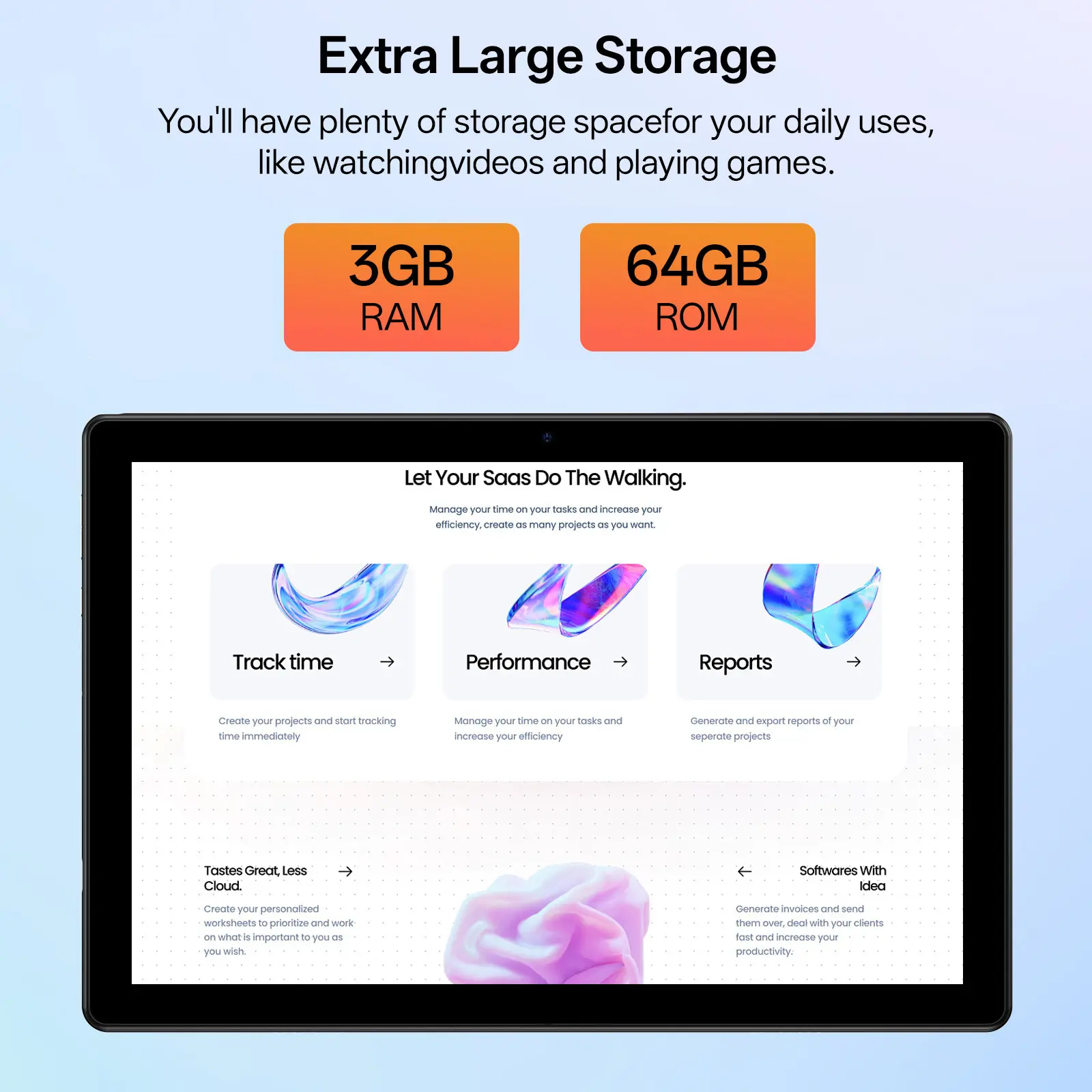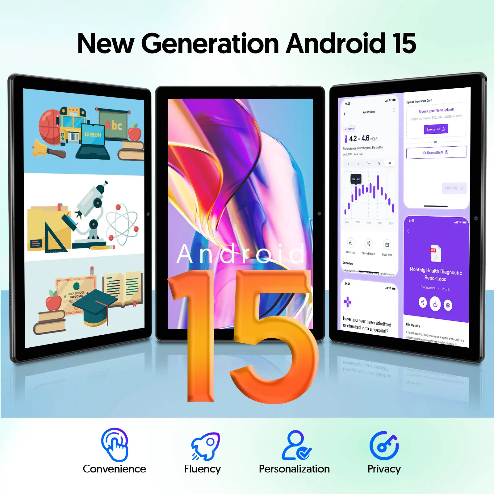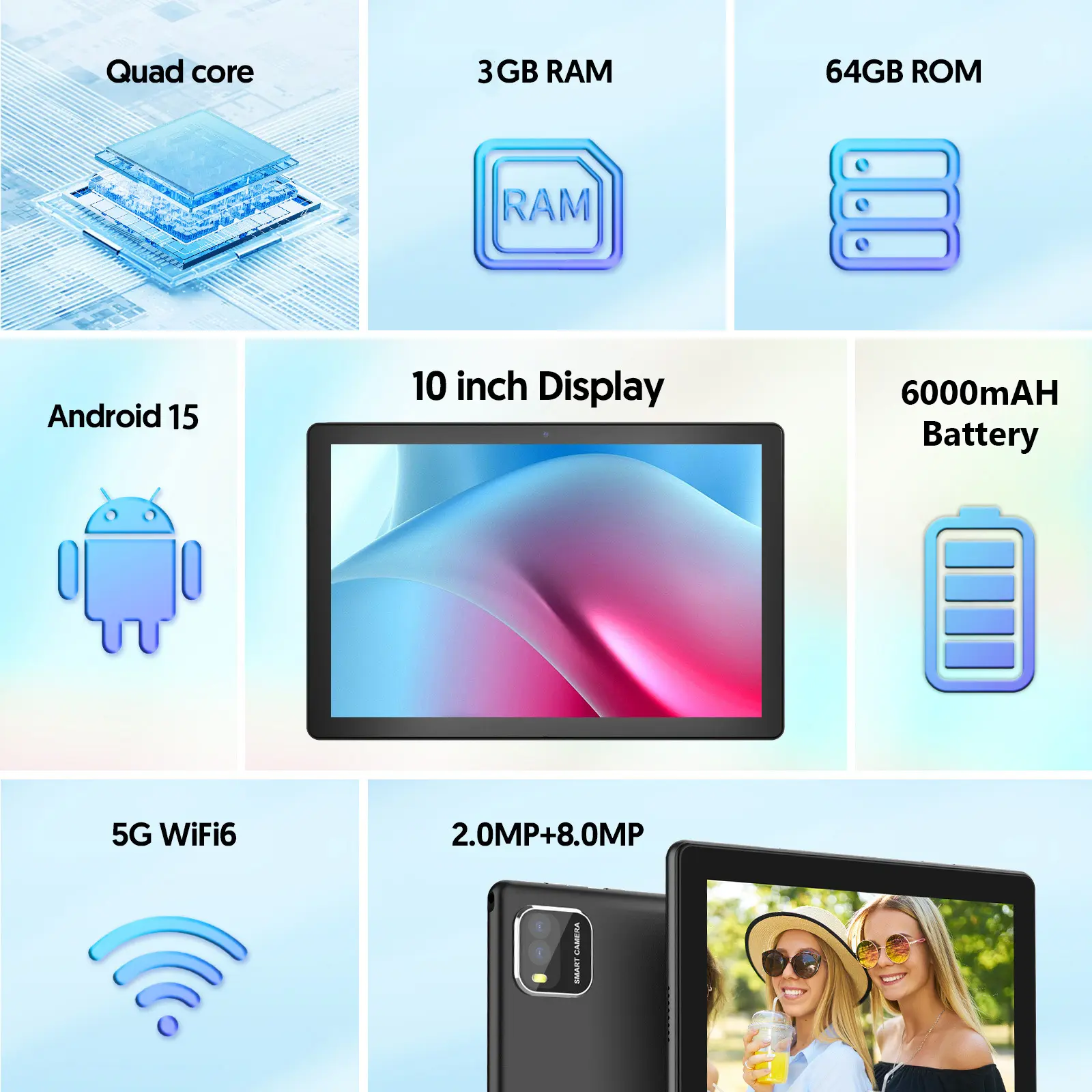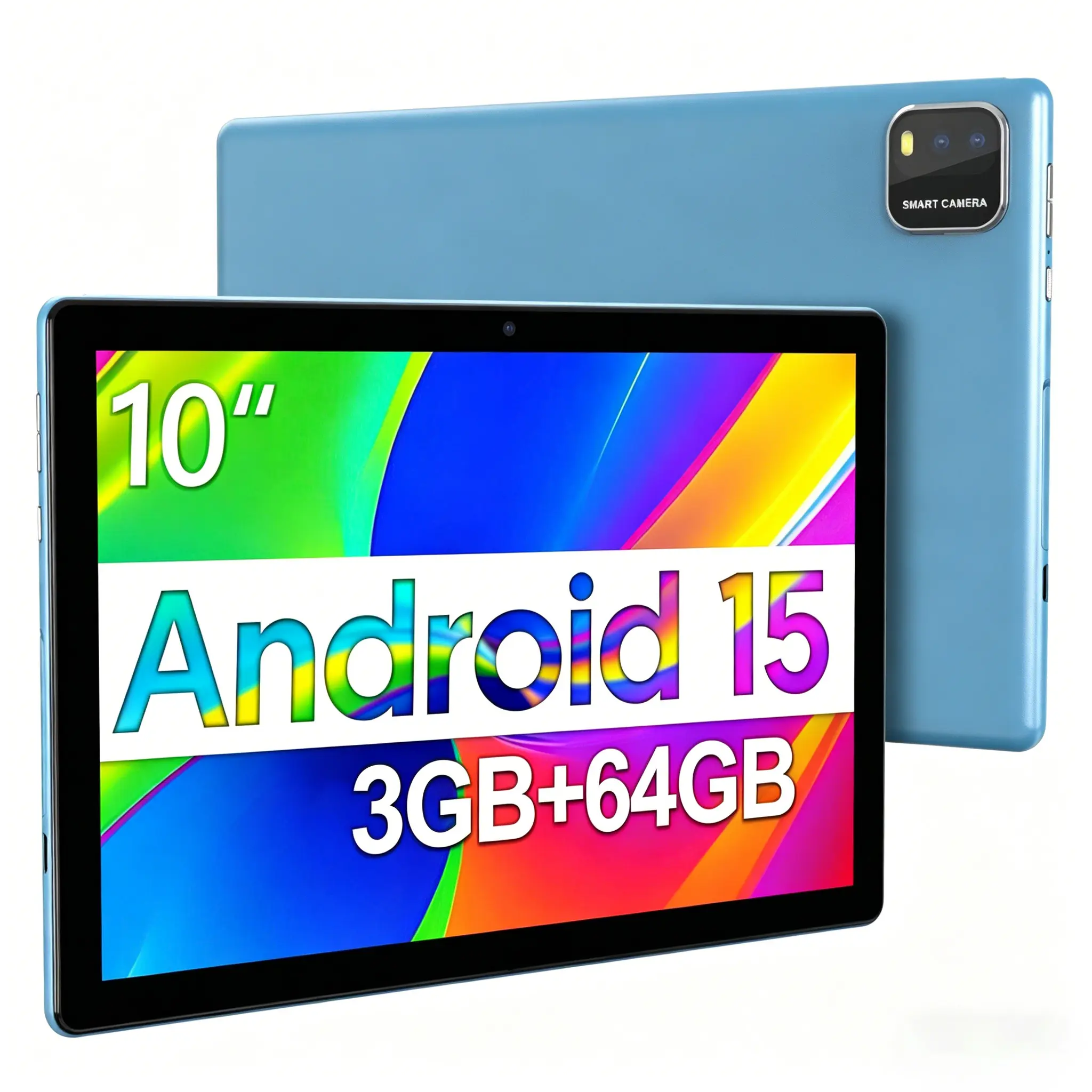 10-Inch Android Tablet Featuring The Latest Android 15, Equipped with 3GB of RAM And 64GB of Storage. This Wi-Fi Tablet Includes a 2MP Front Camera And an 8MP Rear Camera and 6000mAH Battery