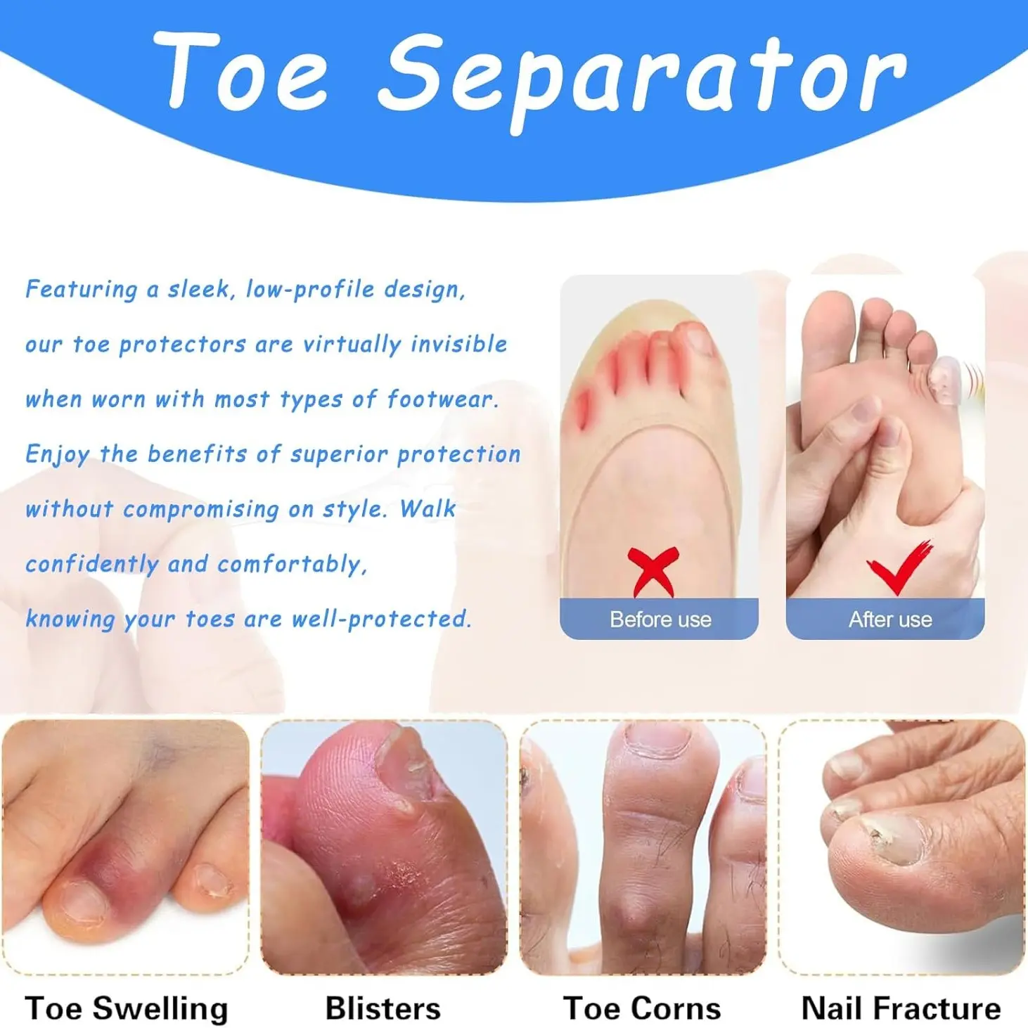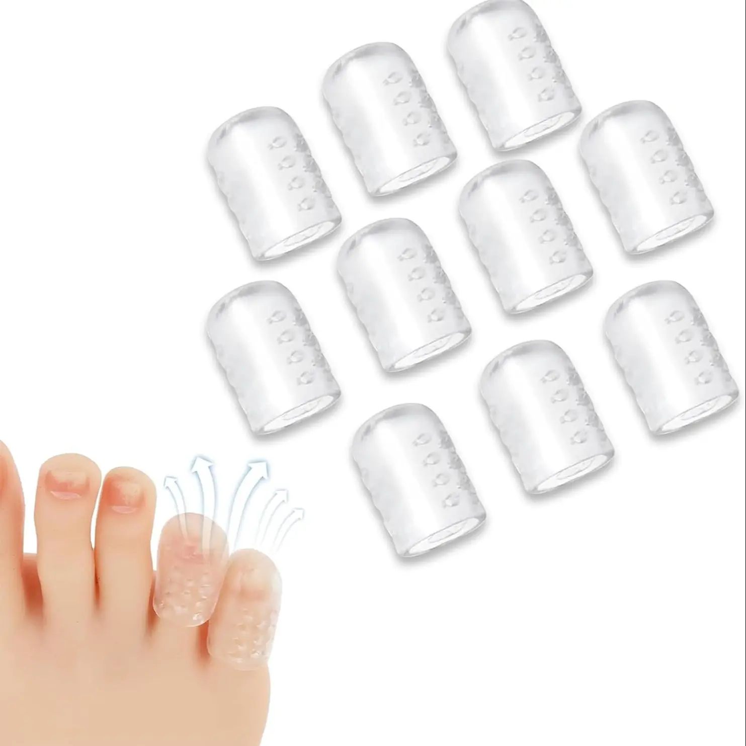 【Breathable & Invisible】Silicone toe protector caps feature a breathable hole design to keep toes ventilated and reduce sweating effectively in daily life. With a slim, transparent design, our toe protectors are nearly invisible when worn with most types of footwear.