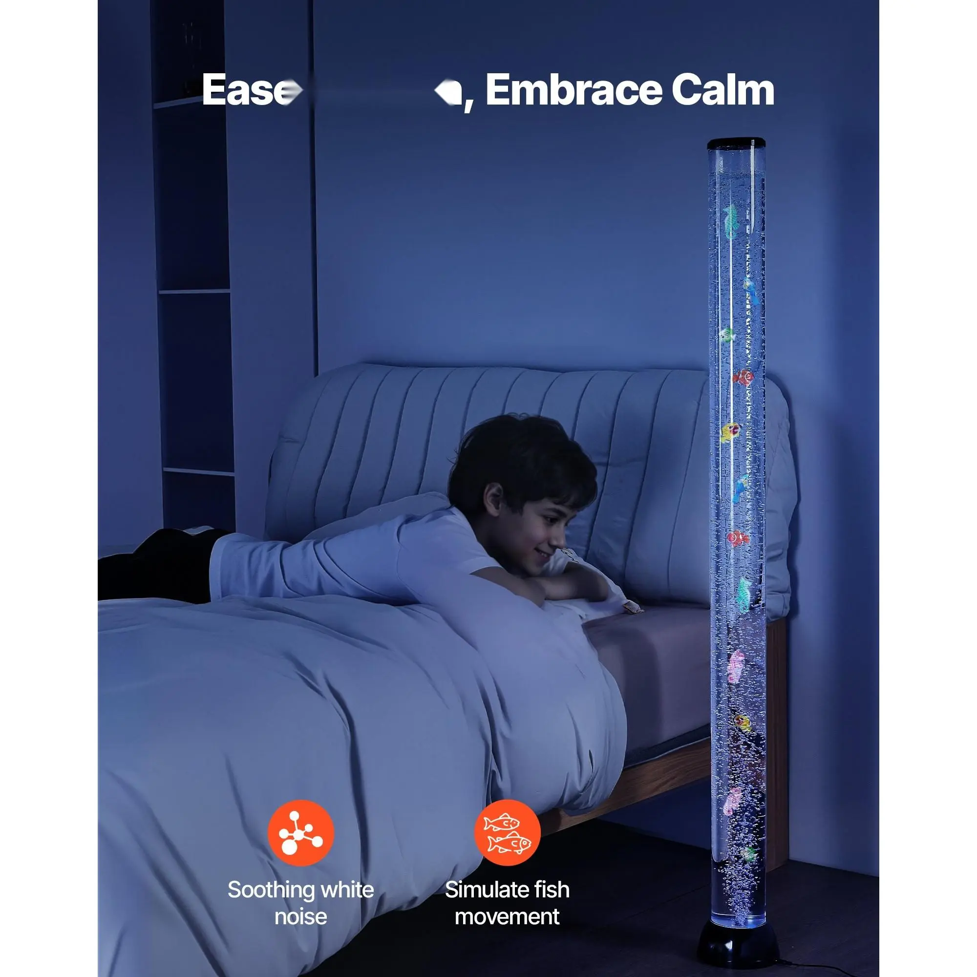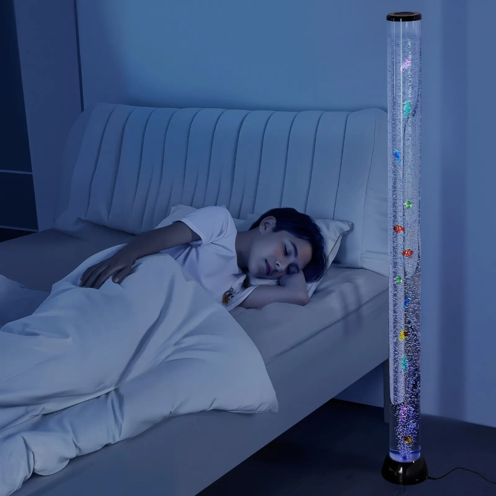 ·Floor-standing Bubble Lamp: This bubble lamp mimics underwater creatures' soothing movements, creating a calming ambiance with white noise. Ideal for those with autism, ADHD, or anxiety, it helps reduce stress and promote relaxation