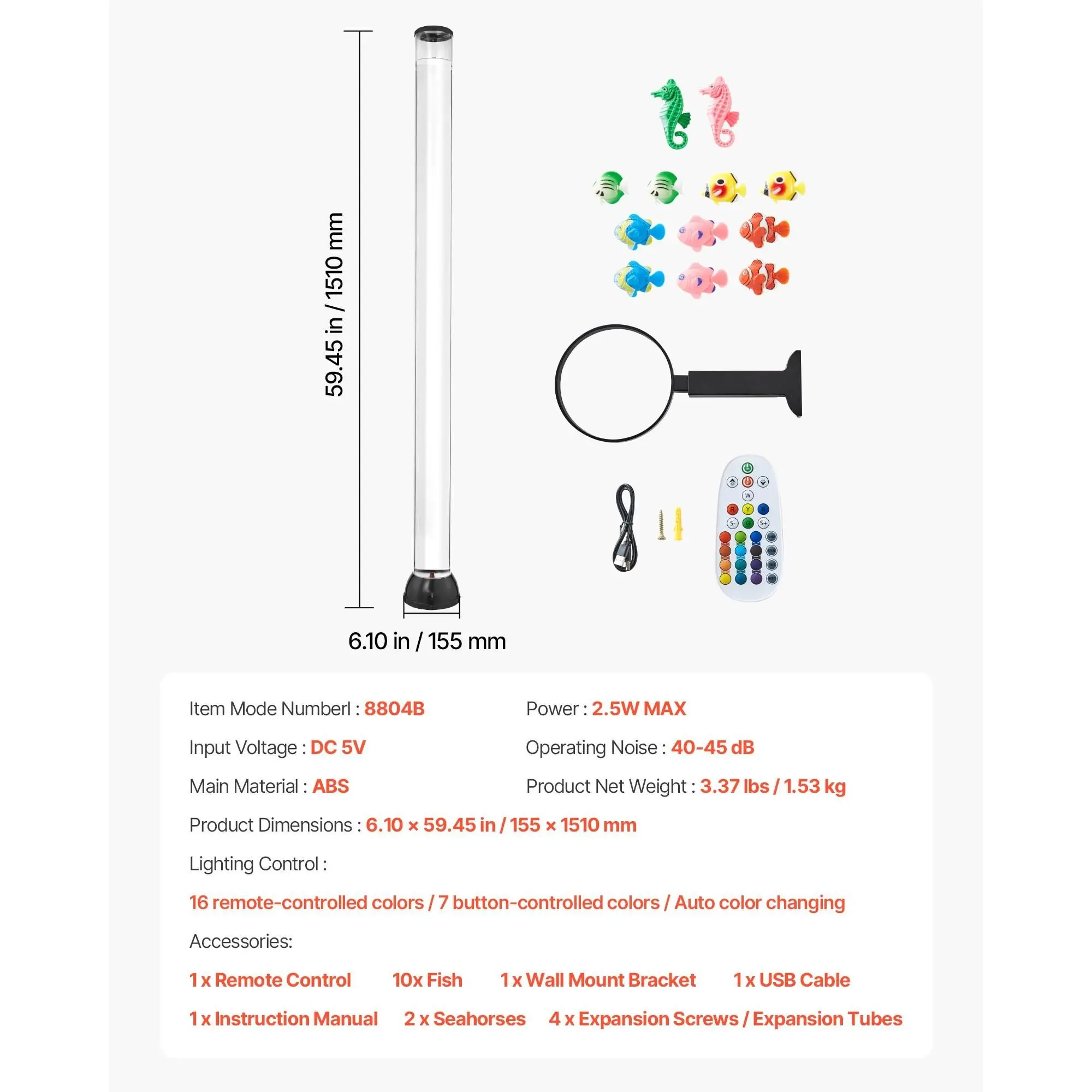·Anti-tip Design: Standing at 5 ft / 1510 mm tall, this bubble tube lamp is ideal for creating ambiance in any room. The widened tube walls avoid fish warping, enhancing their realism. A sturdy base ensures stability, keeping it secure