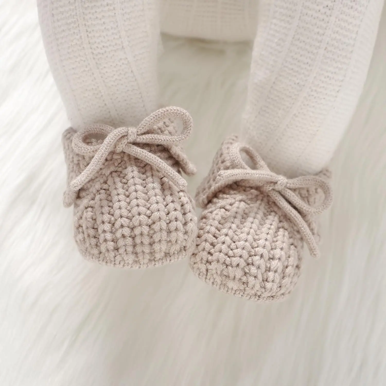 They are simple little knit booties for newborns babies who aren't walking yet, just to keep their feet warm and look cute. These go on easily and just tie closed.Very simple and easy to wear design.The newborn baby booties are also stylish, and would make a great addition to any baby closet.