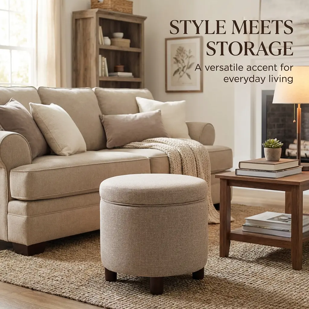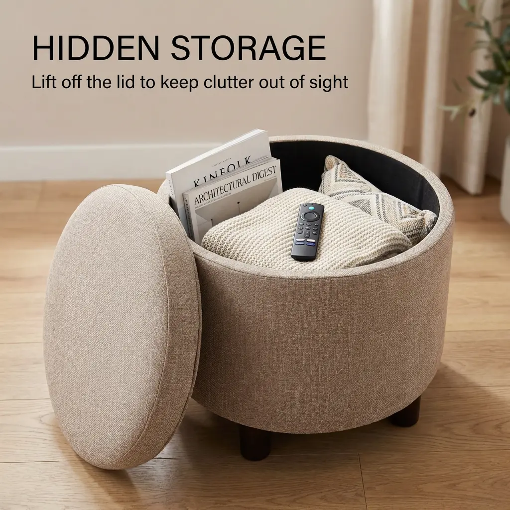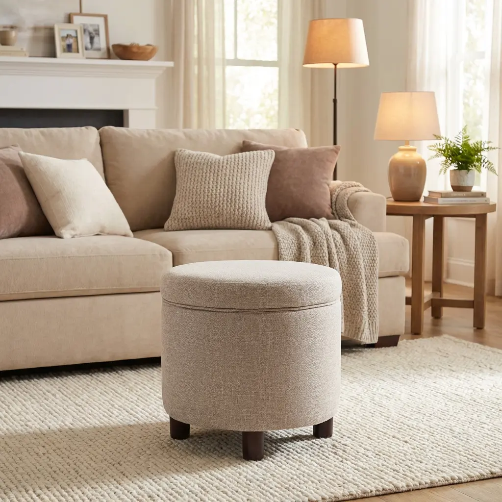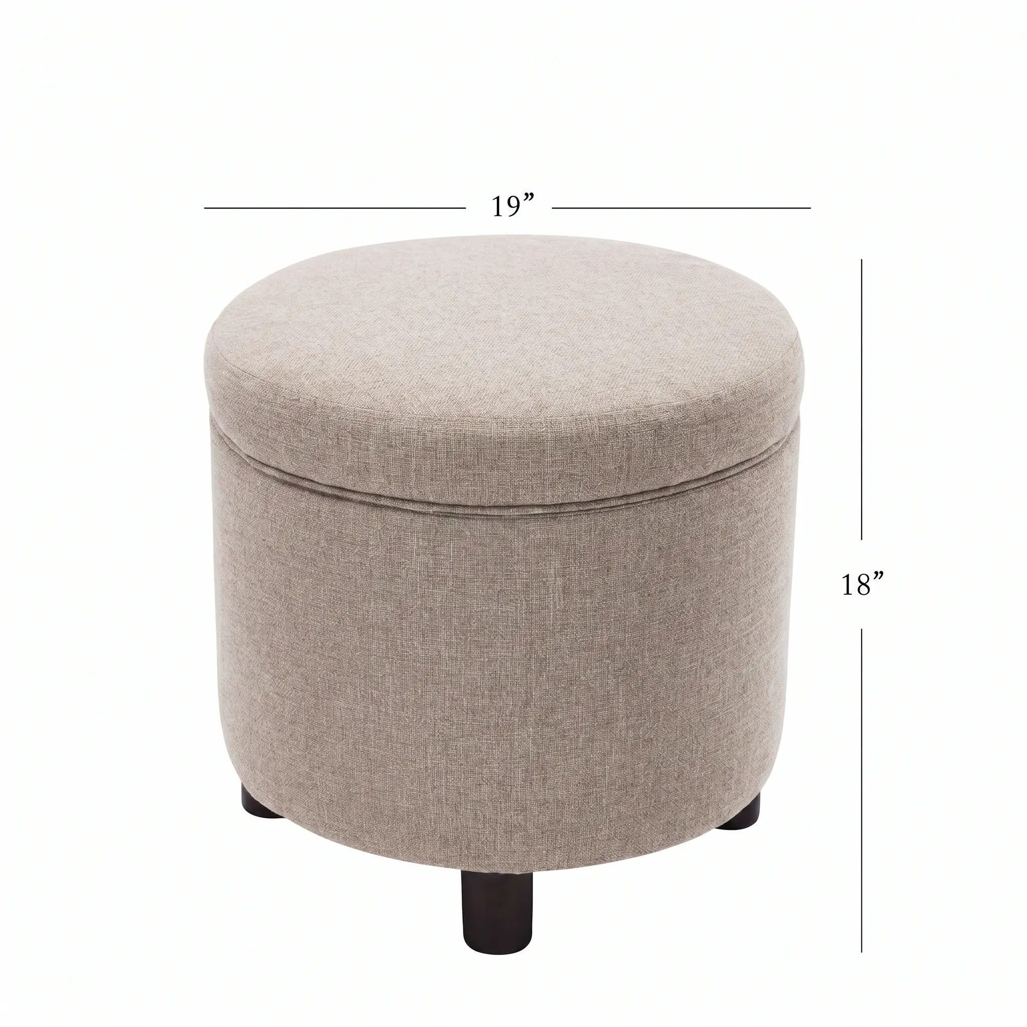 Add style and hidden storage to your home with the Callister 19" Round Storage Ottoman. Designed with a compact round shape and a convenient lift-off lid, this accent ottoman helps keep everyday items neatly tucked away while bringing a warm, elegant touch to your space. Perfect for the living room, bedroom, entryway, or dressing area, this versatile piece can be used as a decorative accent, footrest, or extra seat when needed. Its 19-inch size makes it easy to place in small spaces without sacrificing function. Available in Tan, Blue, and Cream, it blends beautifully with a wide range of home décor styles.