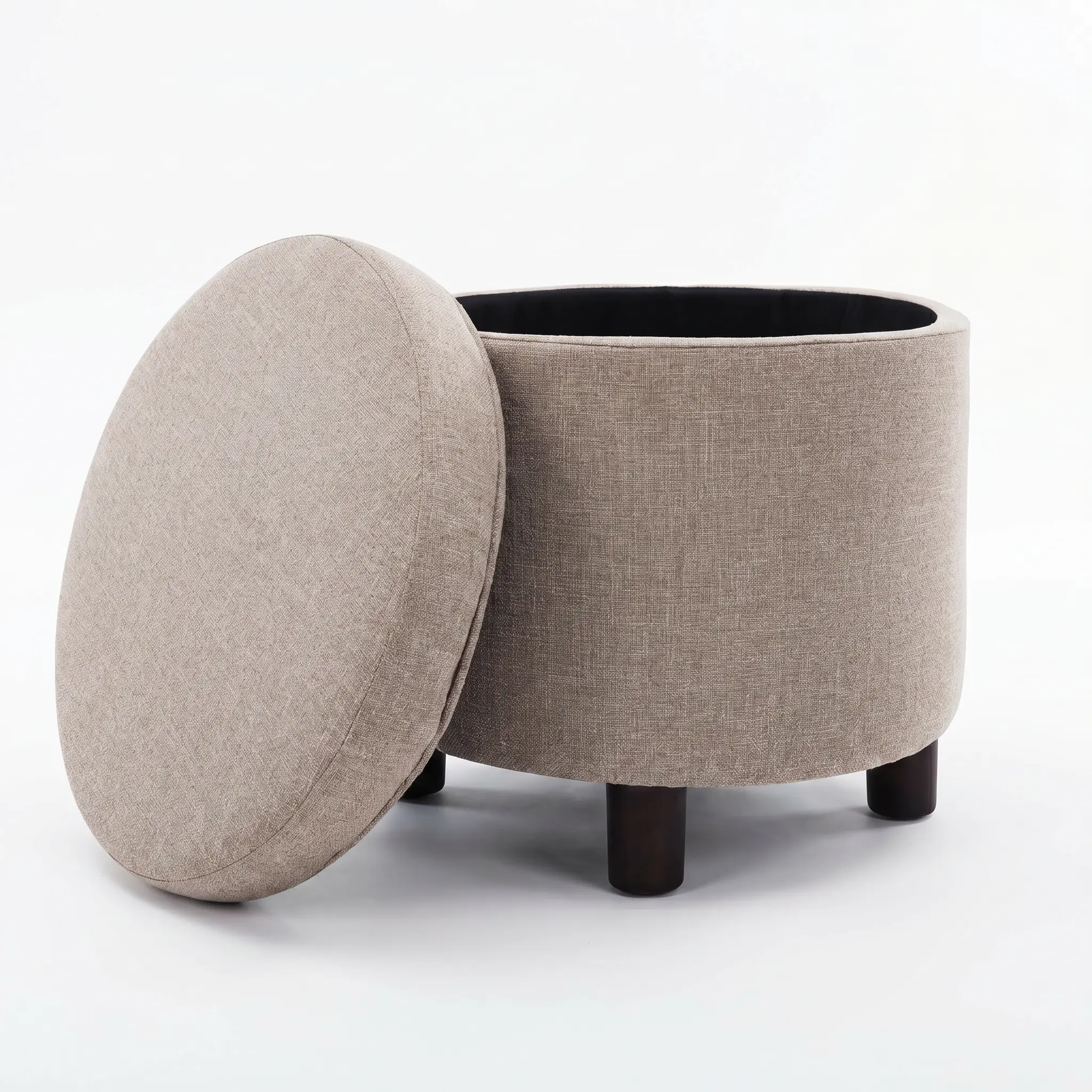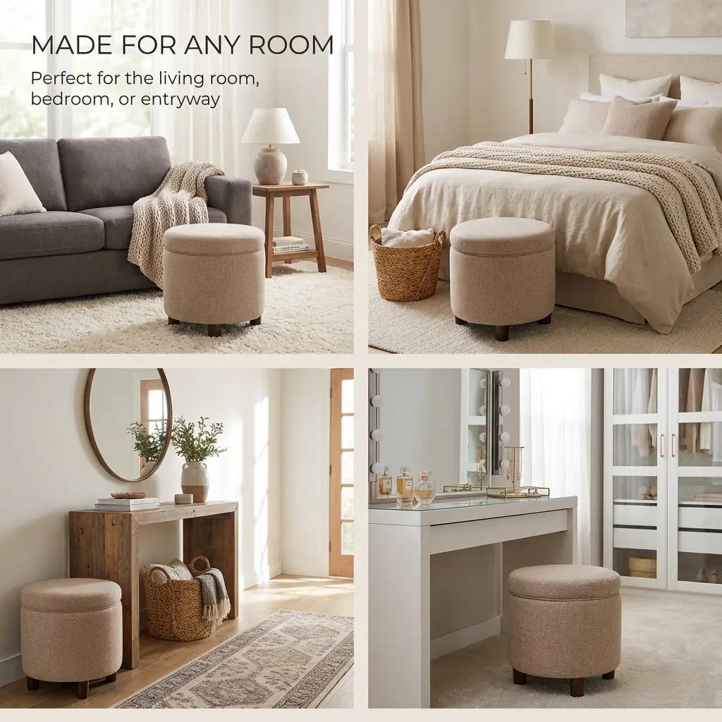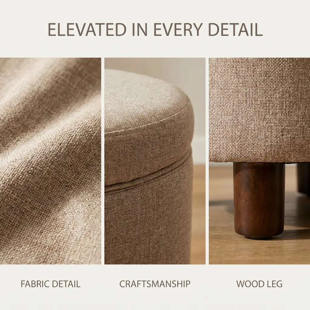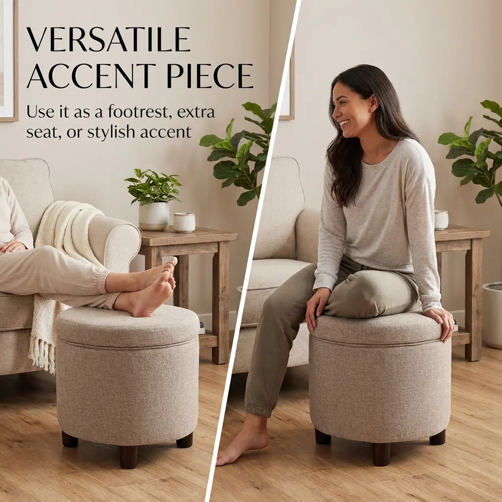 Add style and hidden storage to your home with the Callister 19" Round Storage Ottoman. Designed with a compact round shape and a convenient lift-off lid, this accent ottoman helps keep everyday items neatly tucked away while bringing a warm, elegant touch to your space. Perfect for the living room, bedroom, entryway, or dressing area, this versatile piece can be used as a decorative accent, footrest, or extra seat when needed. Its 19-inch size makes it easy to place in small spaces without sacrificing function. Available in Tan, Blue, and Cream, it blends beautifully with a wide range of home décor styles.