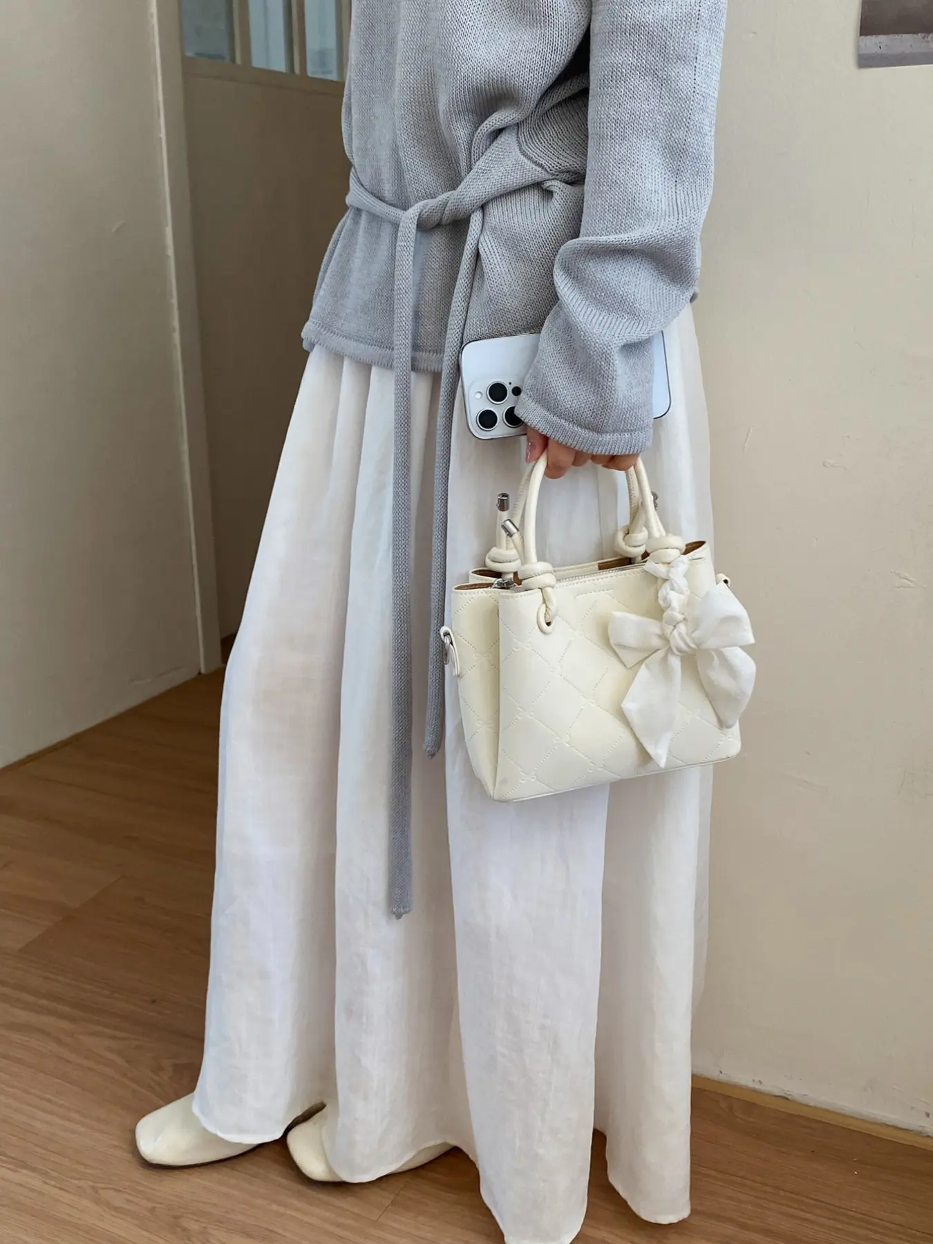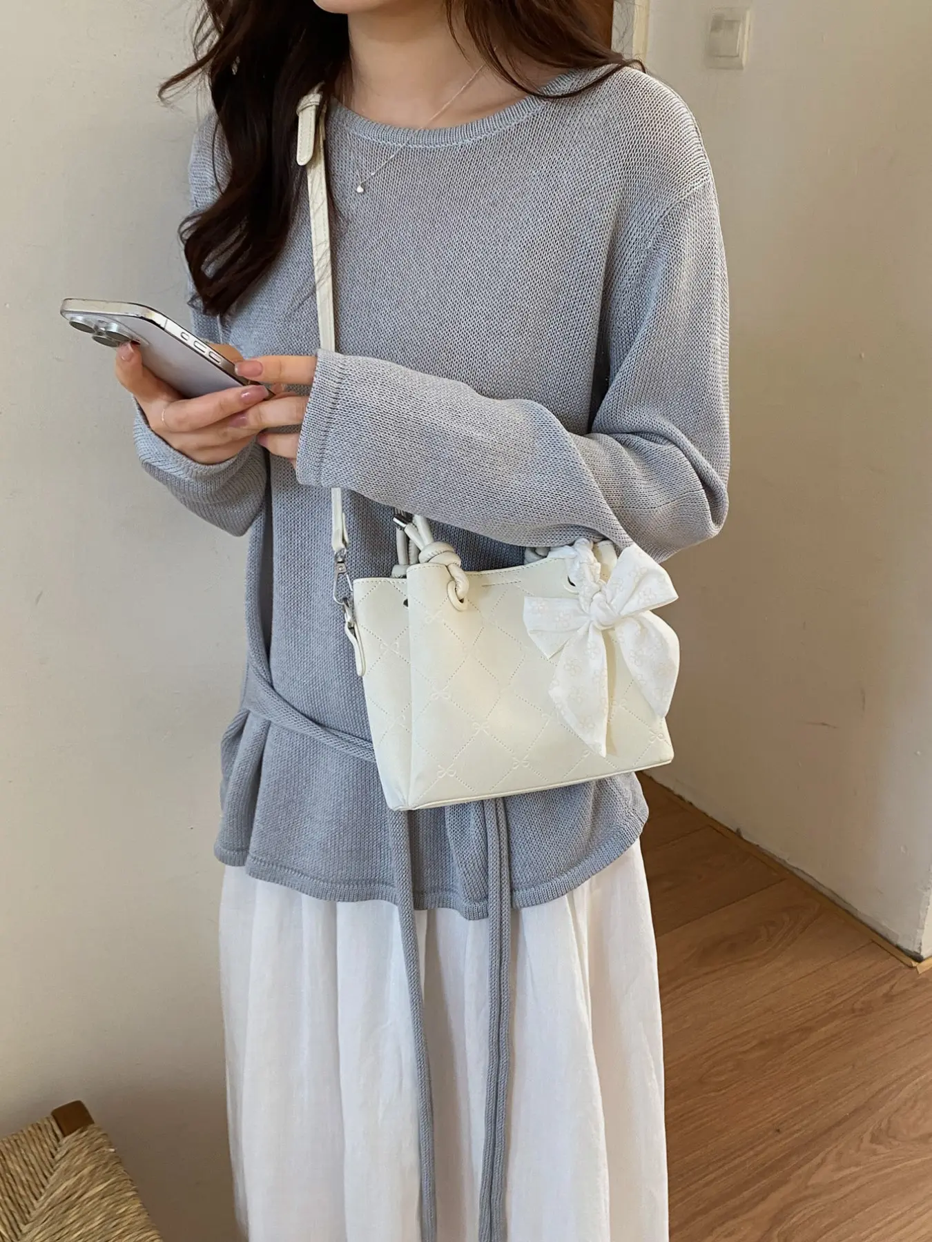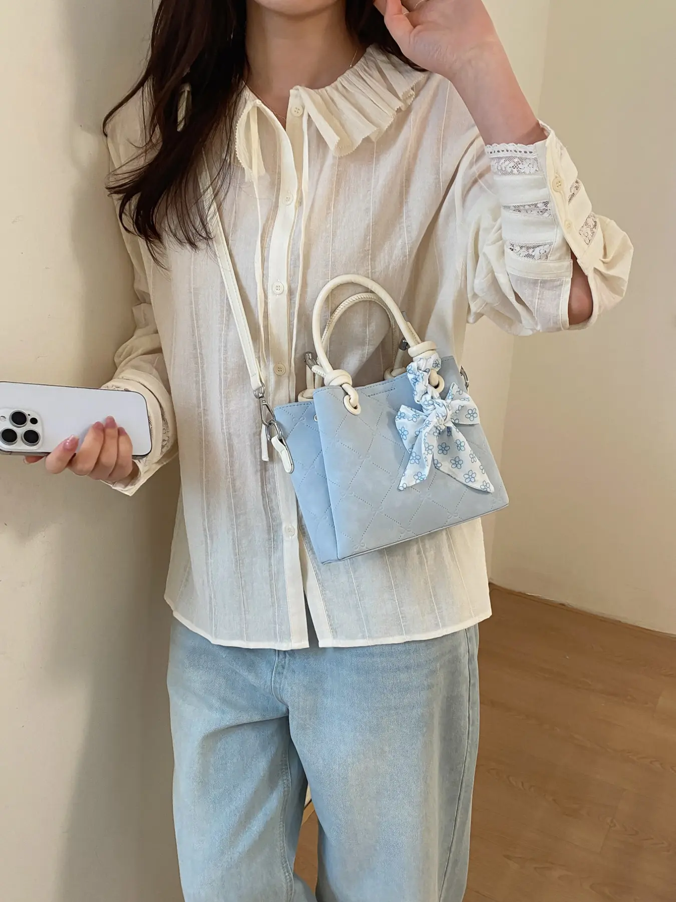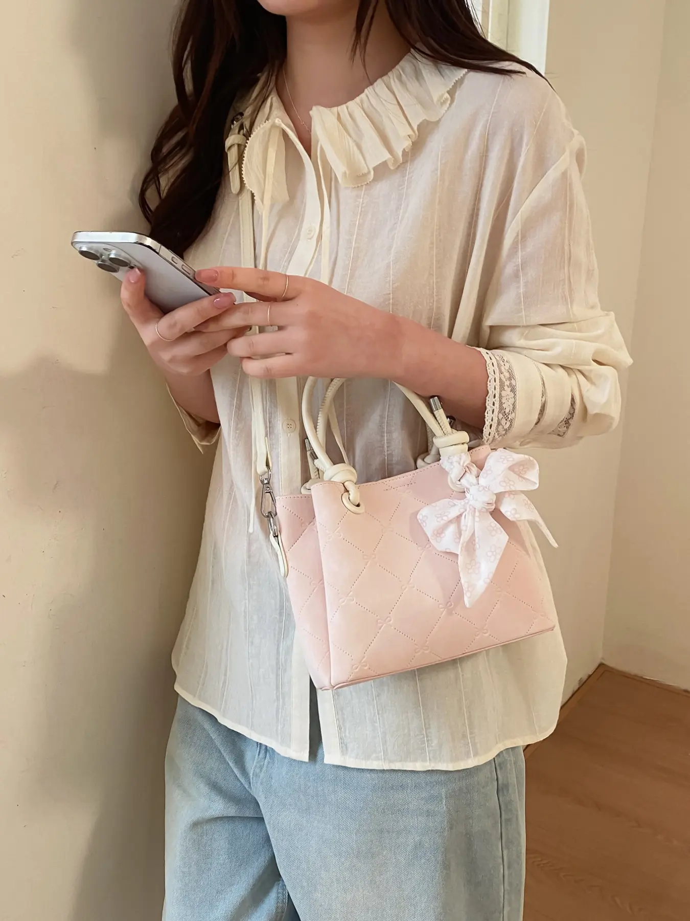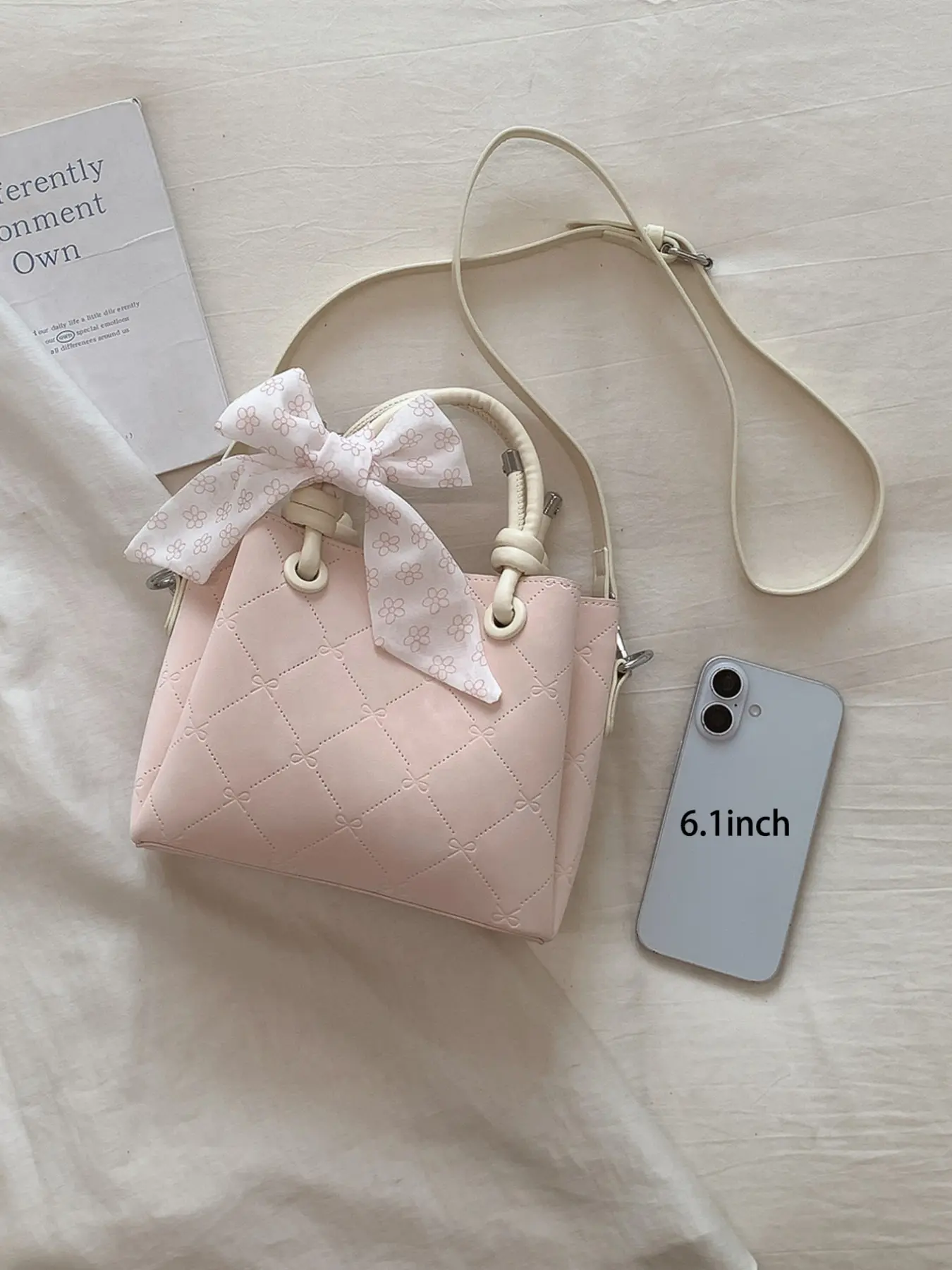 1Powder pink coach bag,Quilted Bucket Bag with Floral Bow Scarf | Dual-Tone Handle Crossbody Tote for Women | Ideal for Daily & Special Occasions