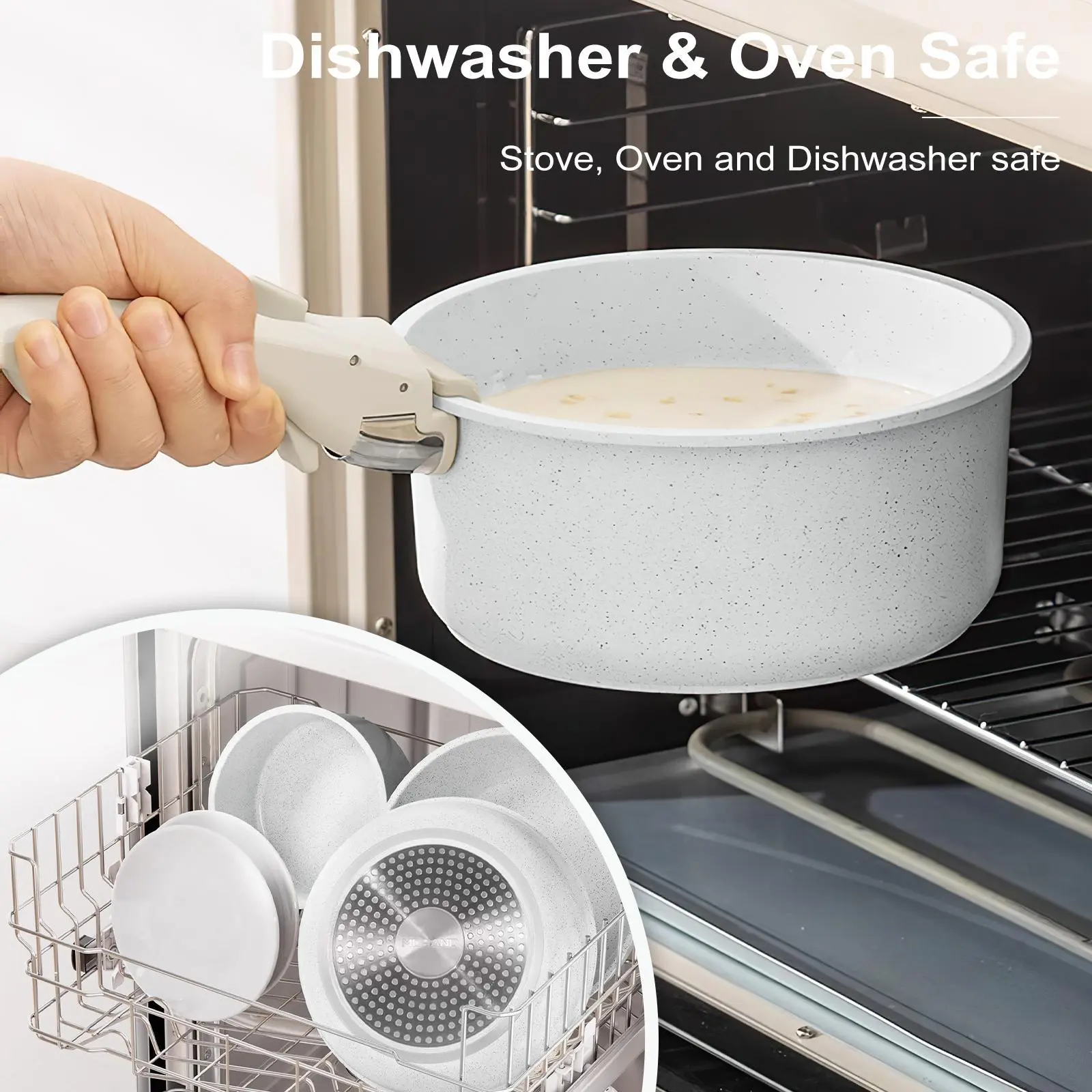 Removable Handles for Convenience: The non-stick cooking pot set features removable handles, and the ceramic cookware can be converted into baking trays and bowls for easy storage and cleaning. This unique design saves space in the kitchen cabinets and is dishwasher-safe for worry-free maintenance.