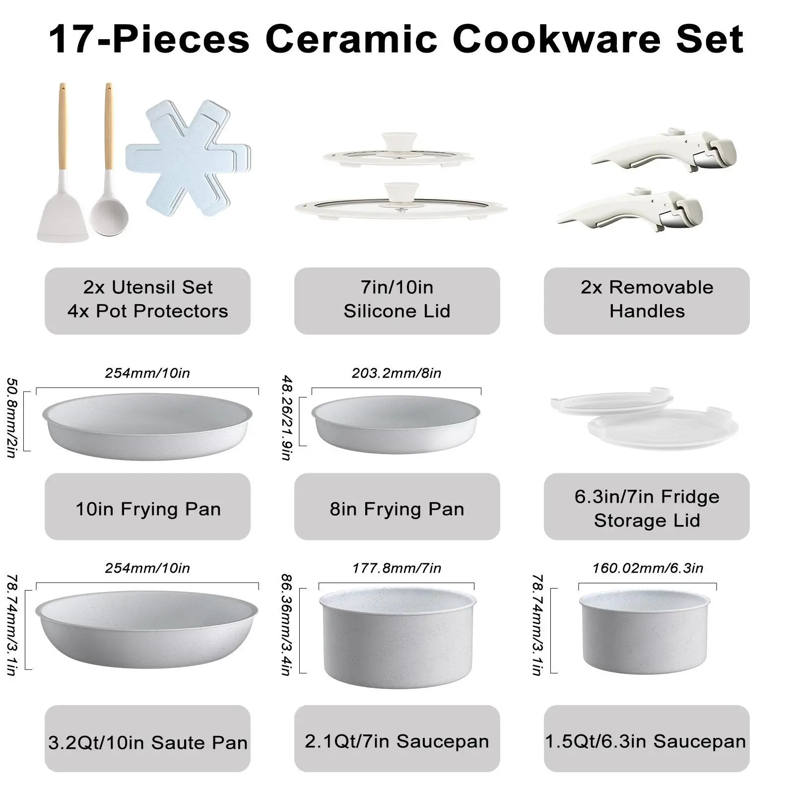 17-piece set includes: 1.5-liter (16 cm) and 2.1-quart (7 cm) pots, 8-inch and 10-inch frying pans, 3.2-quart (25.4 cm) sauté pan, 2 removable handles, 7-inch and 10-inch glass lids, 6.3-inch and 1 3-inch freezer lids, 4 pot lids, silicone slotted spatula and spoon.
