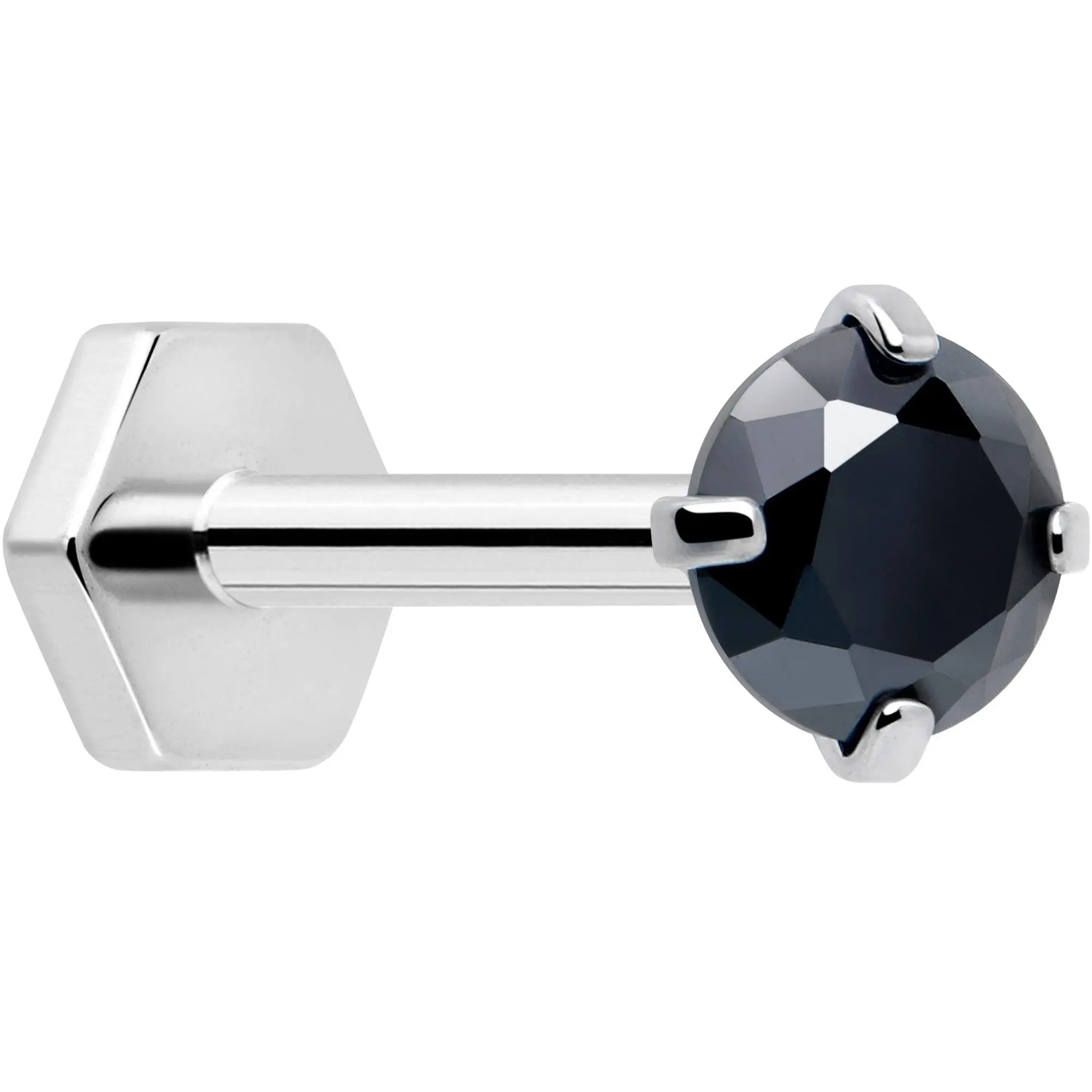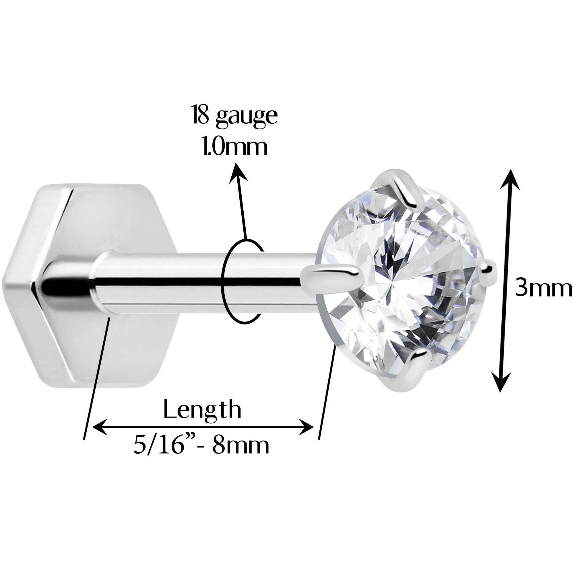 Your cartilage piercings will have twice the style with this 18 gauge lip ring. It's made with an 8mm ASTM F-136 titanium straight post. The front end features a 3mm cubic zirconia gem and a threadless design that makes insertion and removal a snap. The back end features a hexagon shape, for a charming change from the standard disc shape and it's even reversible so you wear it however you choose. You can even rock this jewelry in multiple piercings including lip, monroe, tragus, helix, and some conch piercings. With such an endearing style and such thoughtful details, this is one cartilage piercing stud you'll never want to remove.Specifications18 Gauge (1.0mm), 5/16" (8mm), ASTM F-136 Titanium Straight Post, Threadless Push-In Design, Cubic Zirconia