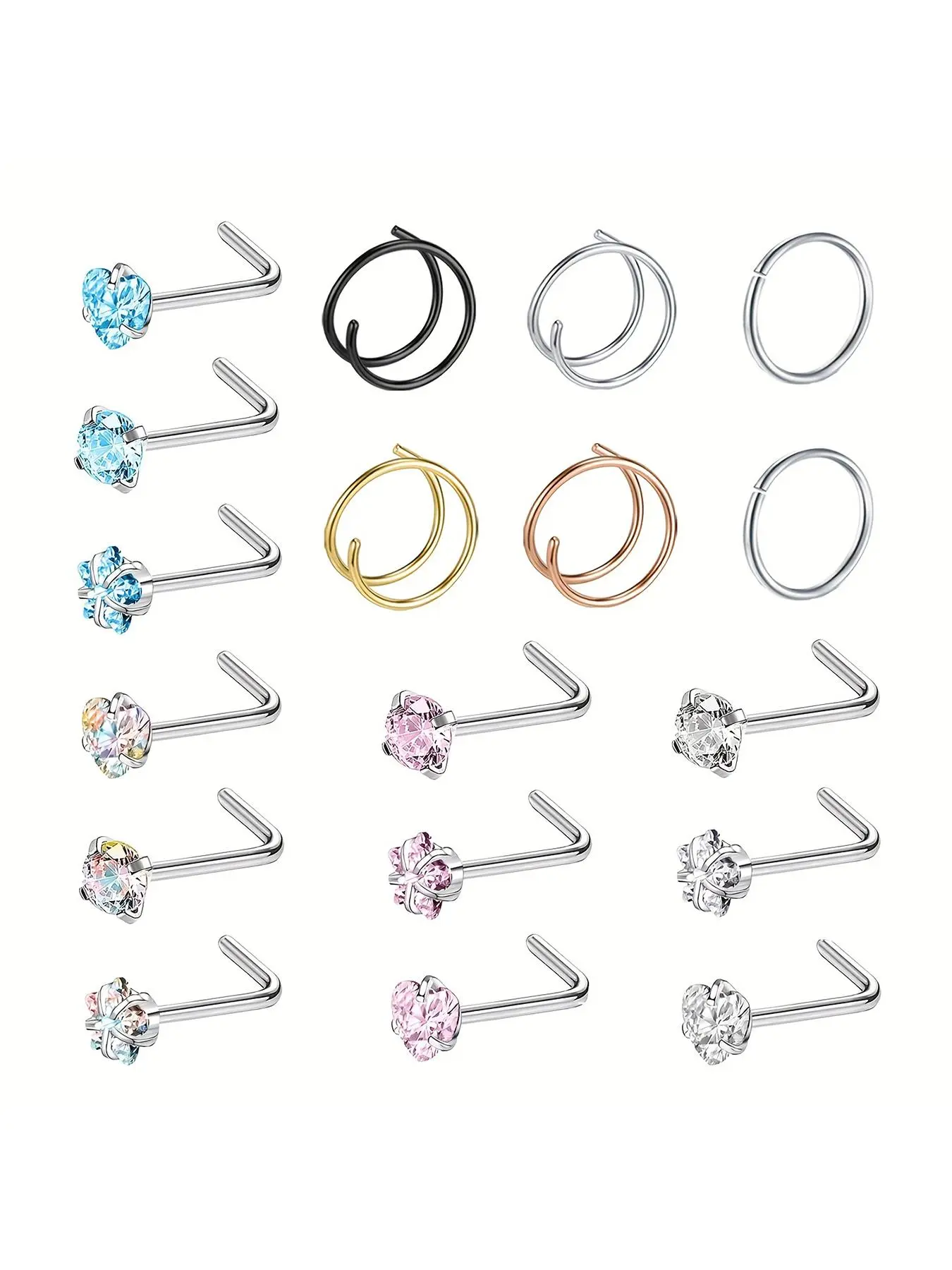 5. 18pcs Rhinestone Decor Spiral Nose Ring & L-shaped Nose Stud Set, Nose Rings Set, Casual Stainless Steel Jewelry for Vacation Party Daily Gift, Classic Fashion Accessories for Daily Wear