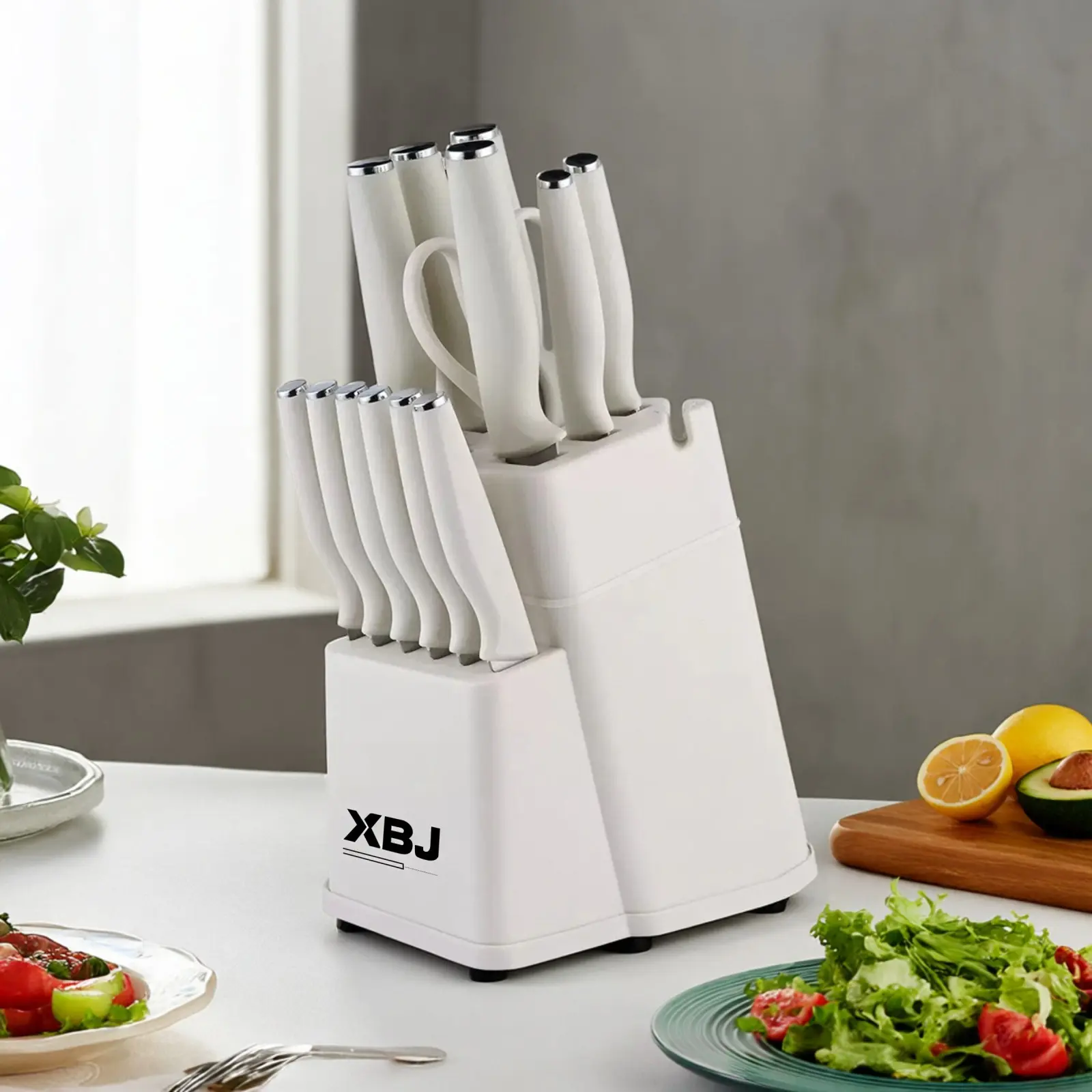 Eay Care and Storage - Our knife set features a stylishknife block design that complements your kitchen. Craftedfrom high-quality wood, this compact knife block securelystores and organizes your knives while protecting theirsharp edges.lts durable and easy-to-clean desian ensureslong-lasting performance and provides a convenient andyour prized kitchen knivesattractive storaqe solution fo)