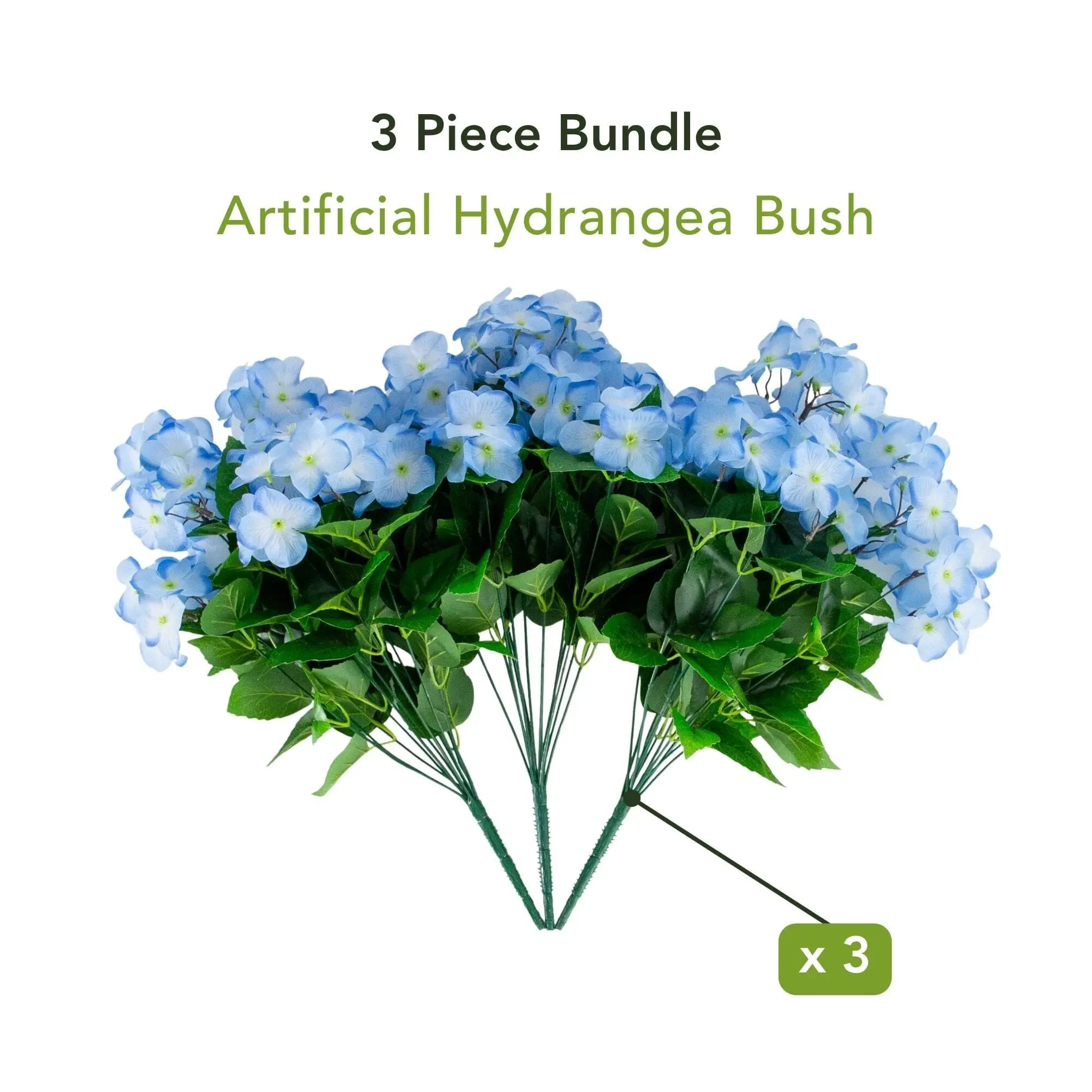 Classic, fresh, and clean, this 19-In UV resistant hydrangea bush set of 3 is a staple for year-round decorating. Each lifelike stem is filled with soft petals and realistic green leaves that stay vibrant year round. Perfect for both indoor and outdoor use, these faux hydrangeas bring color to planters, entryways, or gardens. Their medium size makes them ideal for DIYing into larger pots, or styling for simple looks. Shape the branches and fluff petals for a full look and get your dream style effortlessly.